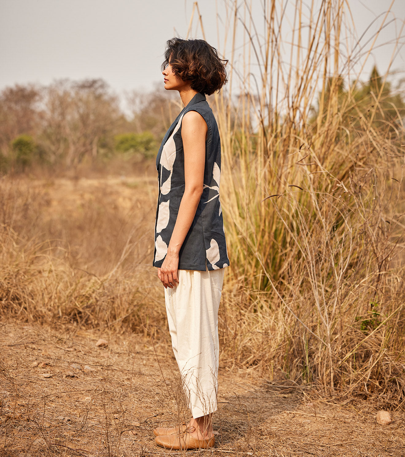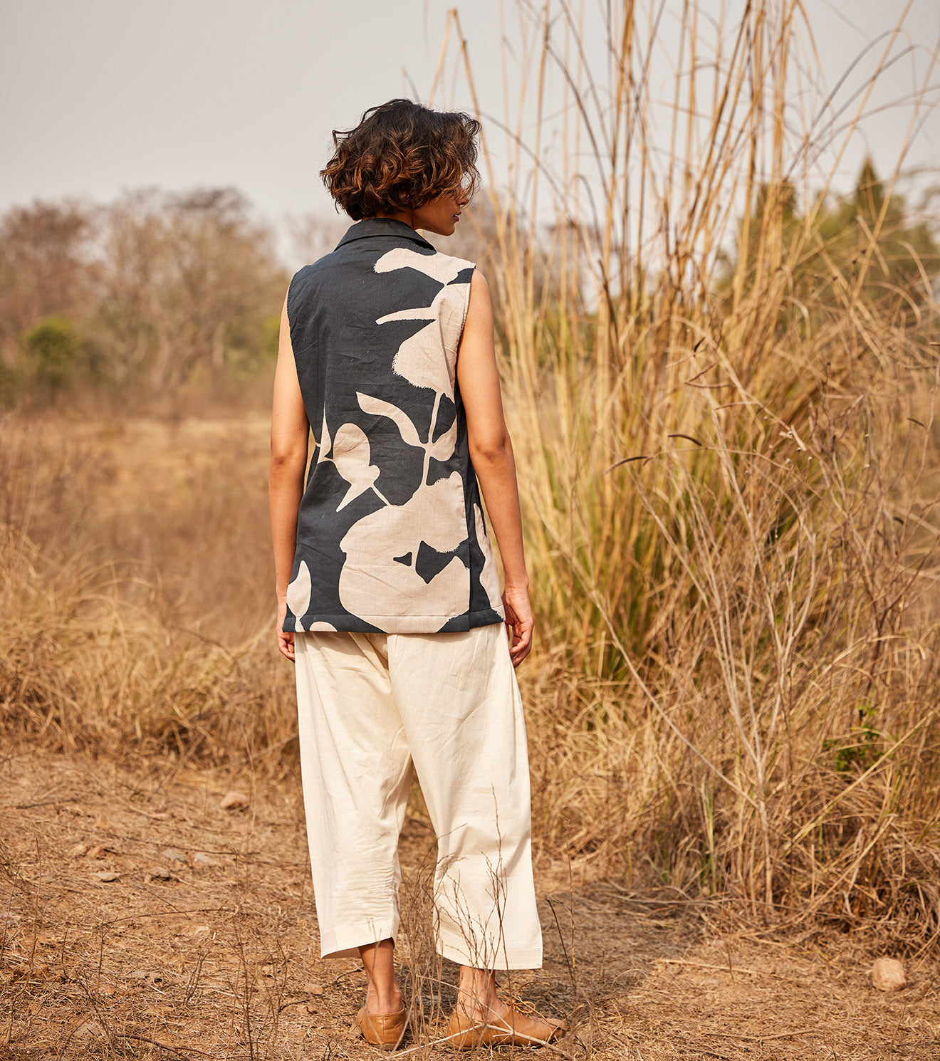 A monochromatic co ord set featuring a statement printed waistcoat crafted in breathable cotton mul fabric. comes with salwar bottoms - Handcrafted in India. - 2 Side pockets