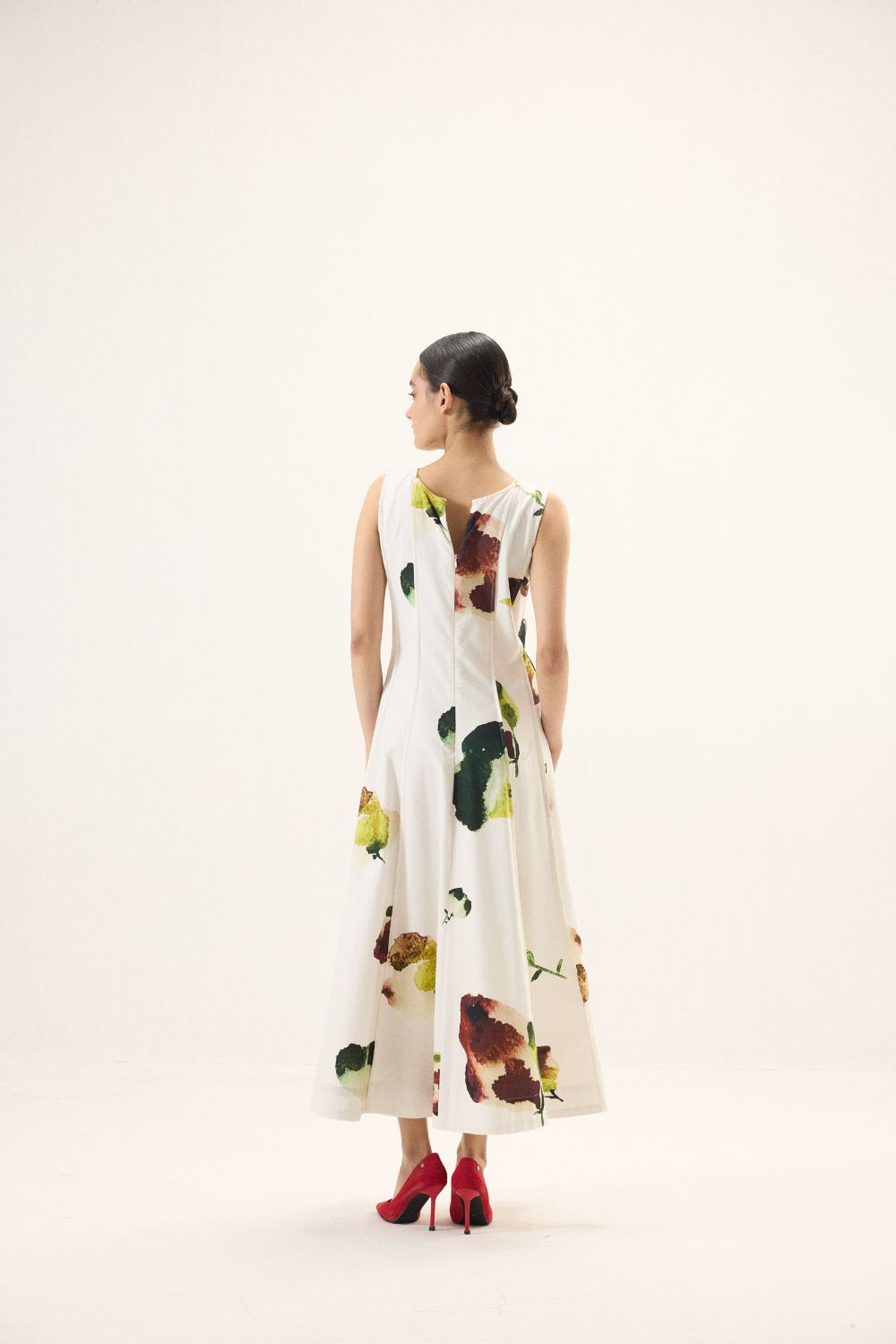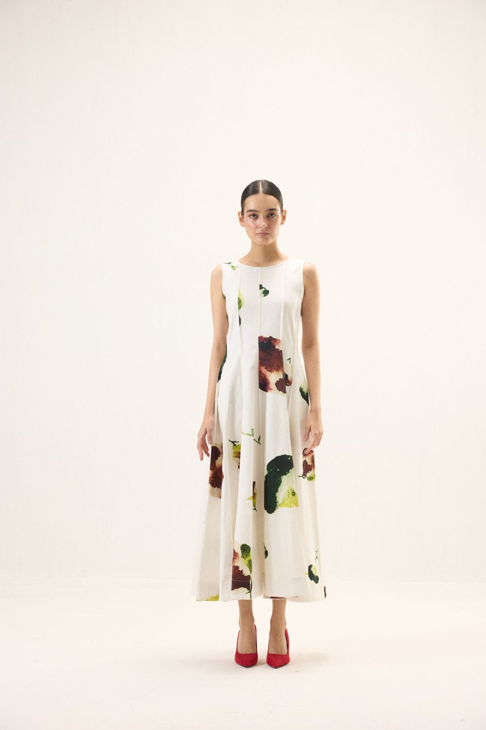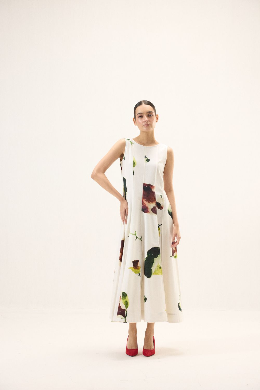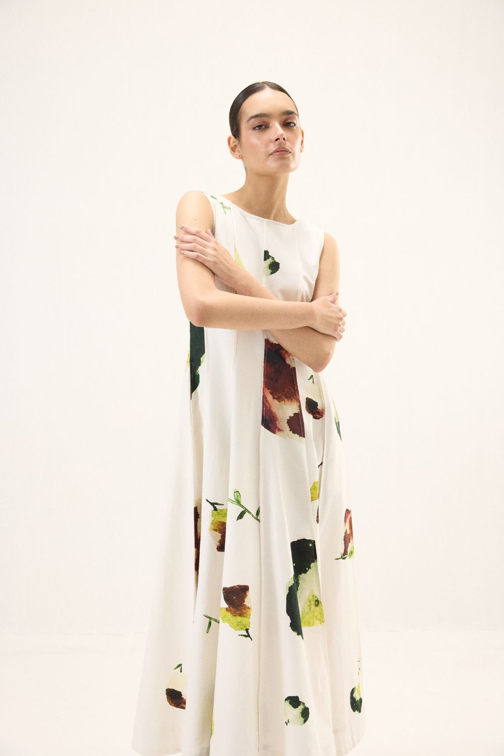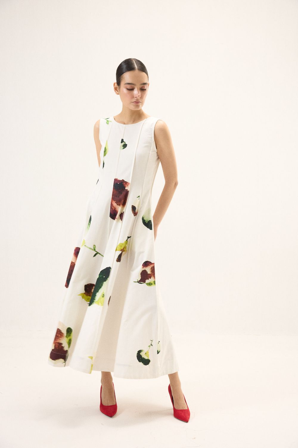 A flowing sleeveless dress crafted in soft printed oxford, featuring delicate pintucks that run seamlessly from top to bottom, creating a lengthening silhouette. The dress is adorned with bold painterly floral motifs in vivid hues, adding a touch of artistic elegance against its white base.