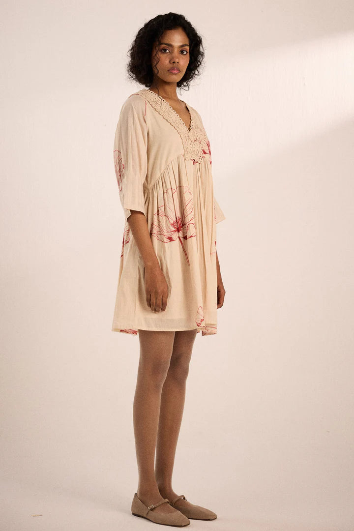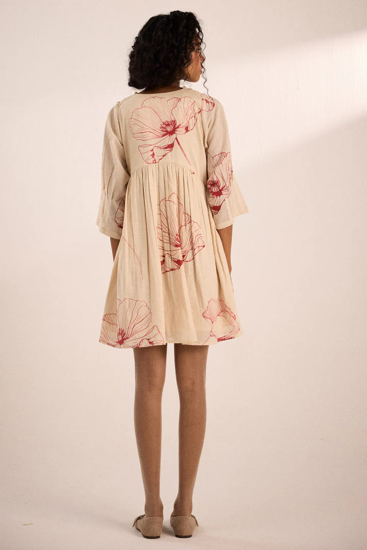 A breezy beige dress with red poppy artsy print, a lace-trimmed V-neckline, and three-quarter pleated sleeves. Flowy and effortless.