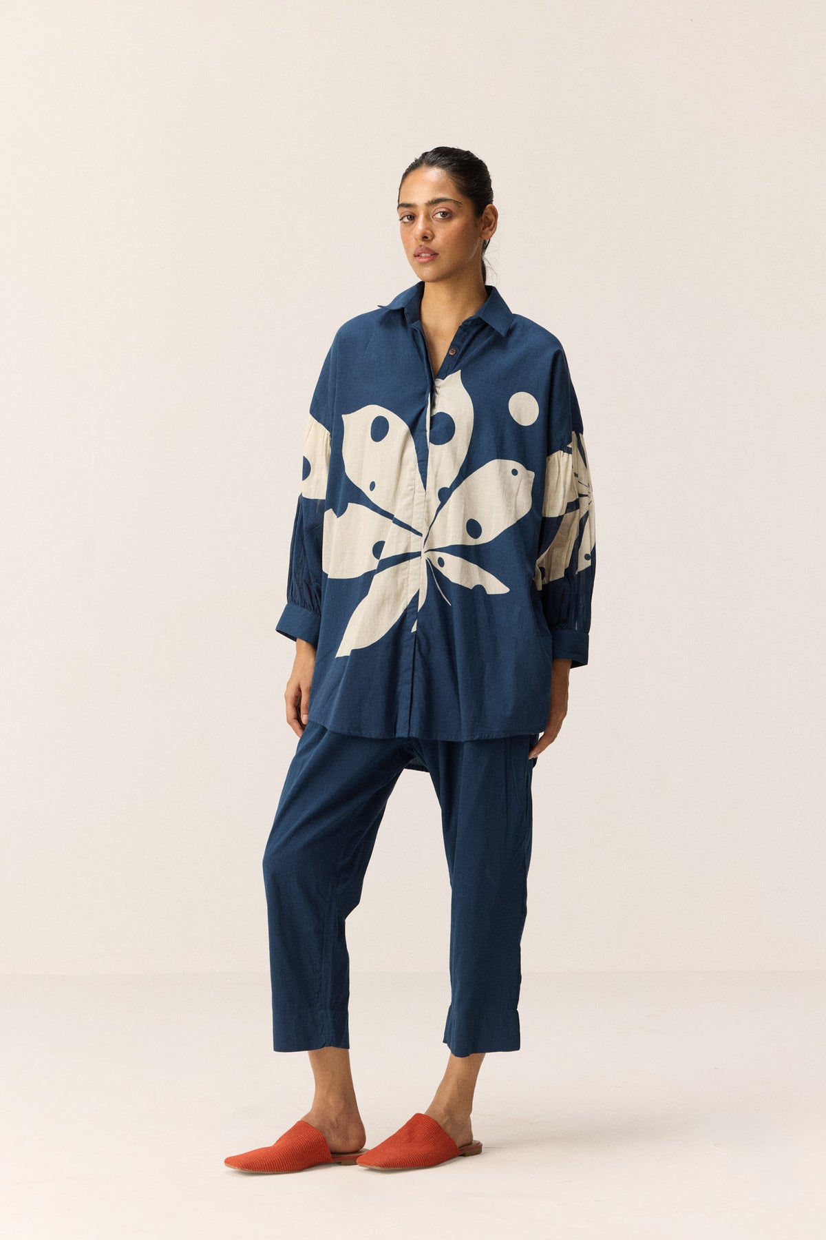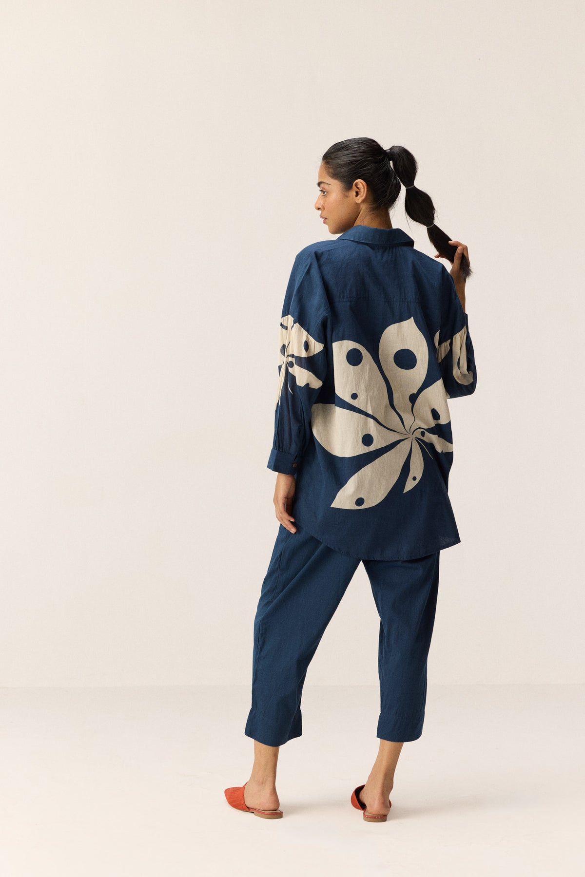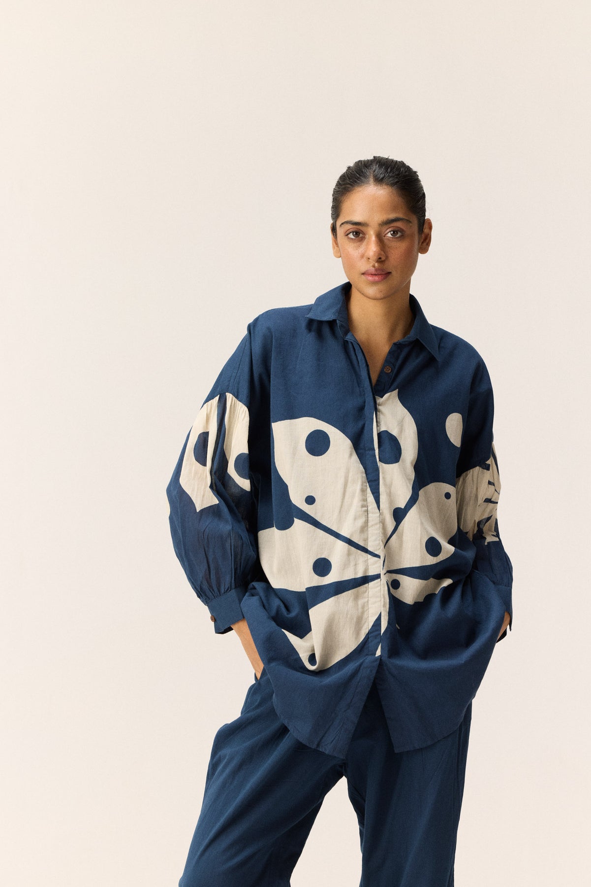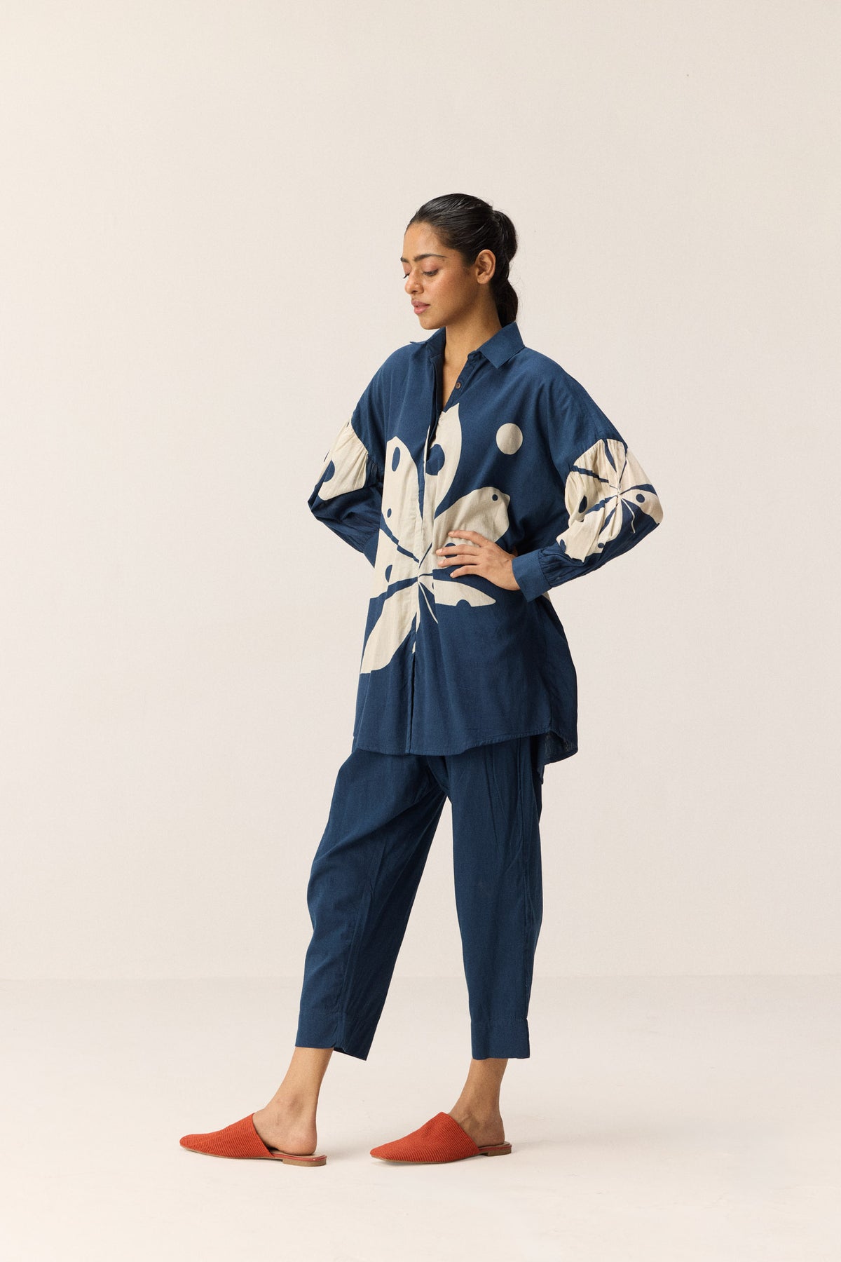 A navy blue co-ord set featuring an off-white abstract leaf print on the front and sleeves of the top. Designed with lapel collars and two front buttons, it pairs with solid navy pants that include a front button opening, an elasticated back, and practical side pockets.