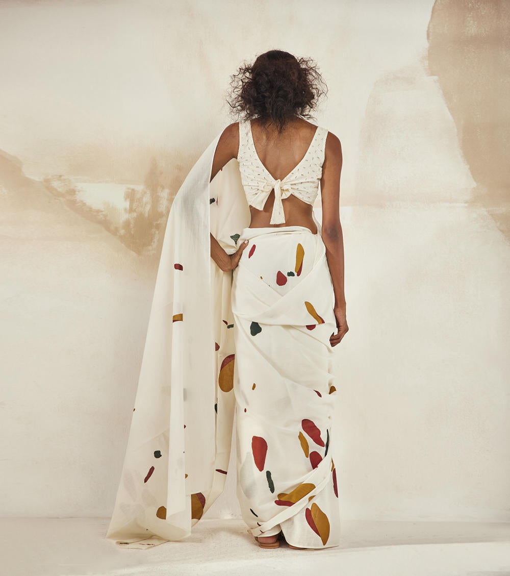 This mosaic printed saree comes with a deep neck cutwork blouse with adjustable knot closing at the back.