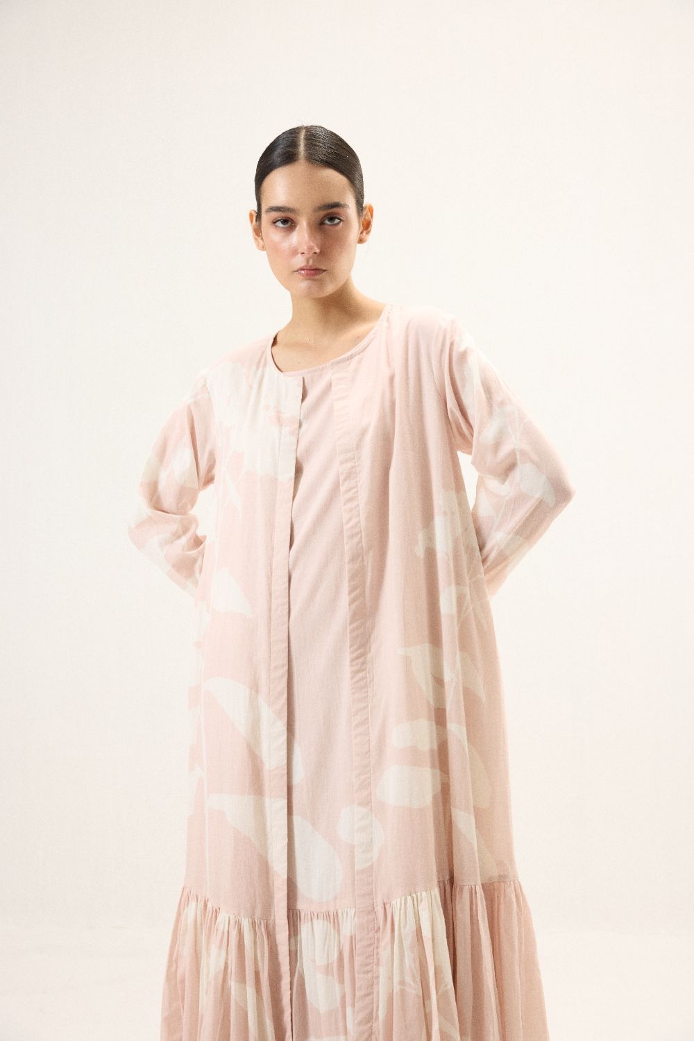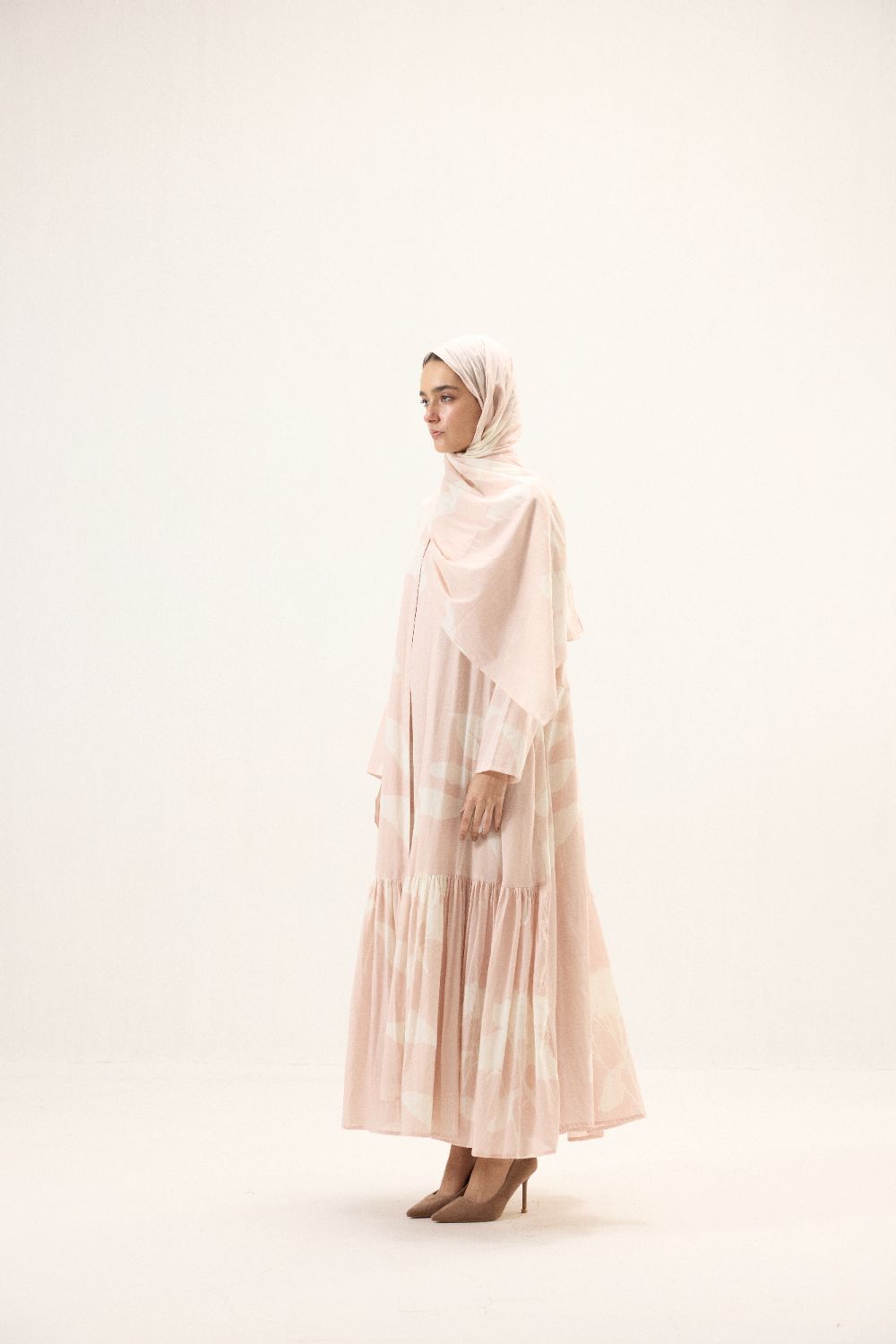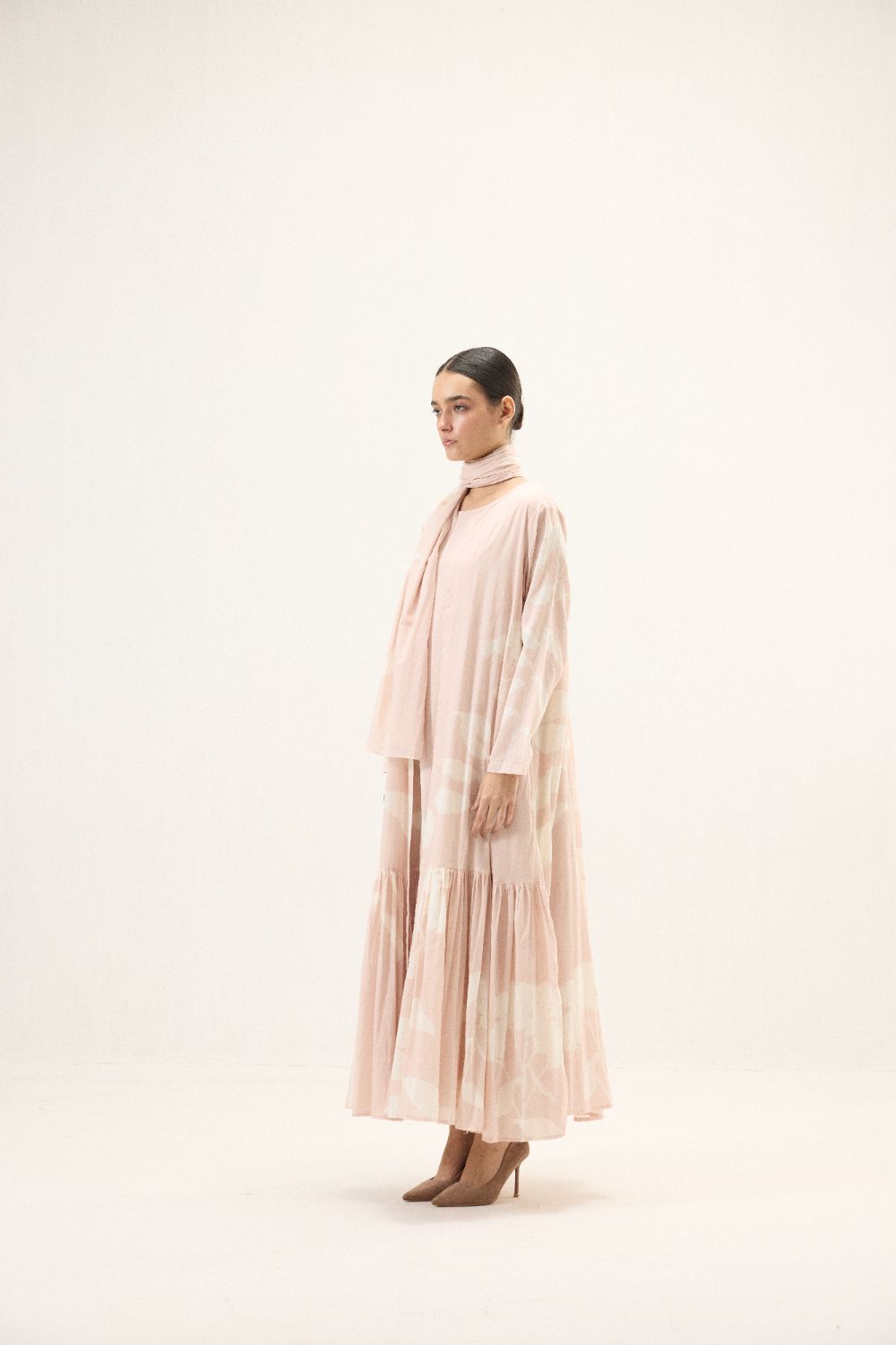 Crafted in soft cotton mul, this abaya set features a delicate floral print in pastel pink that dances across a flowy silhouette. Gathered panels at the bottom add gentle volume, while side pockets bring practical ease. Paired with a matching inner dress and scarf, it is an effortlessly graceful ensemble