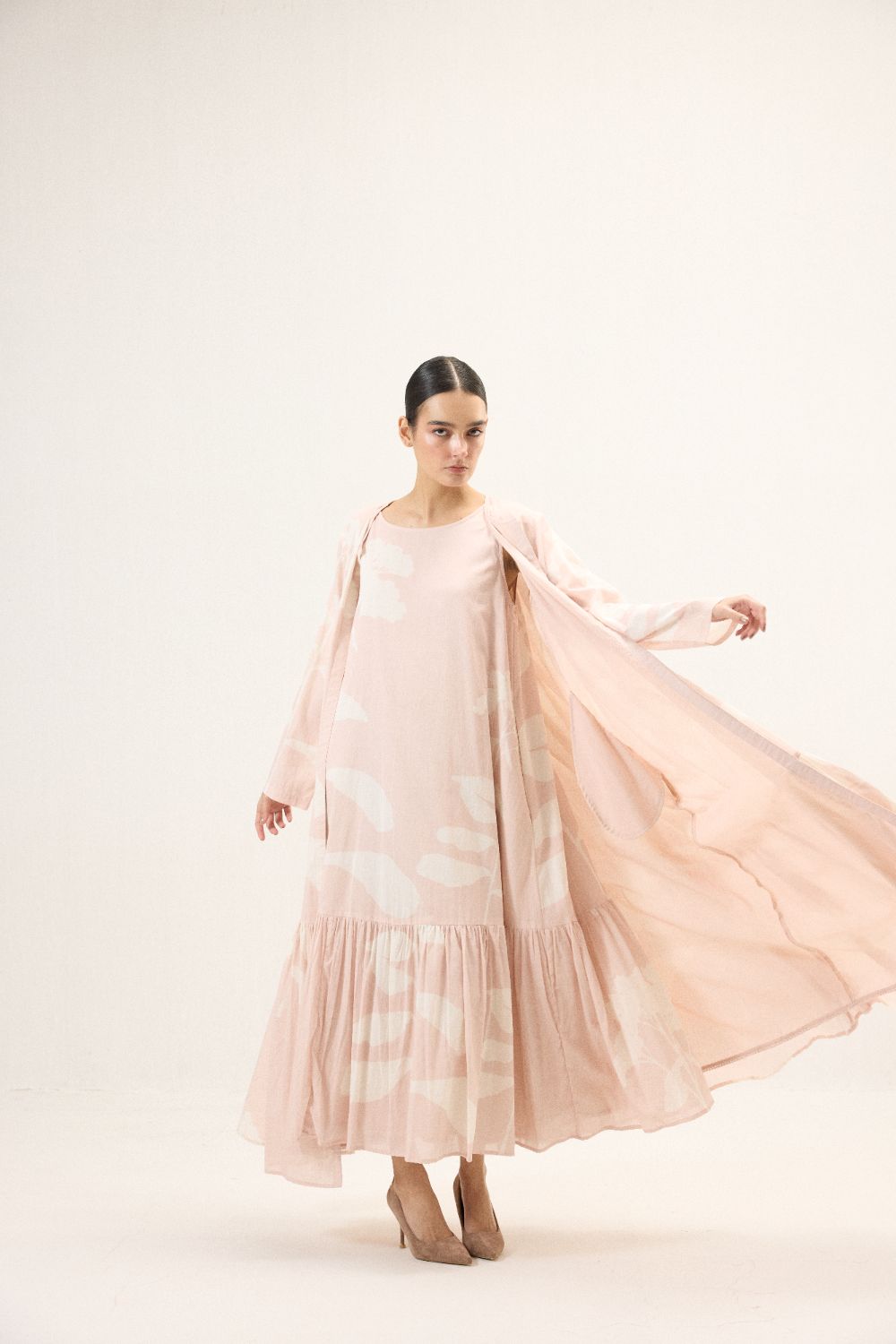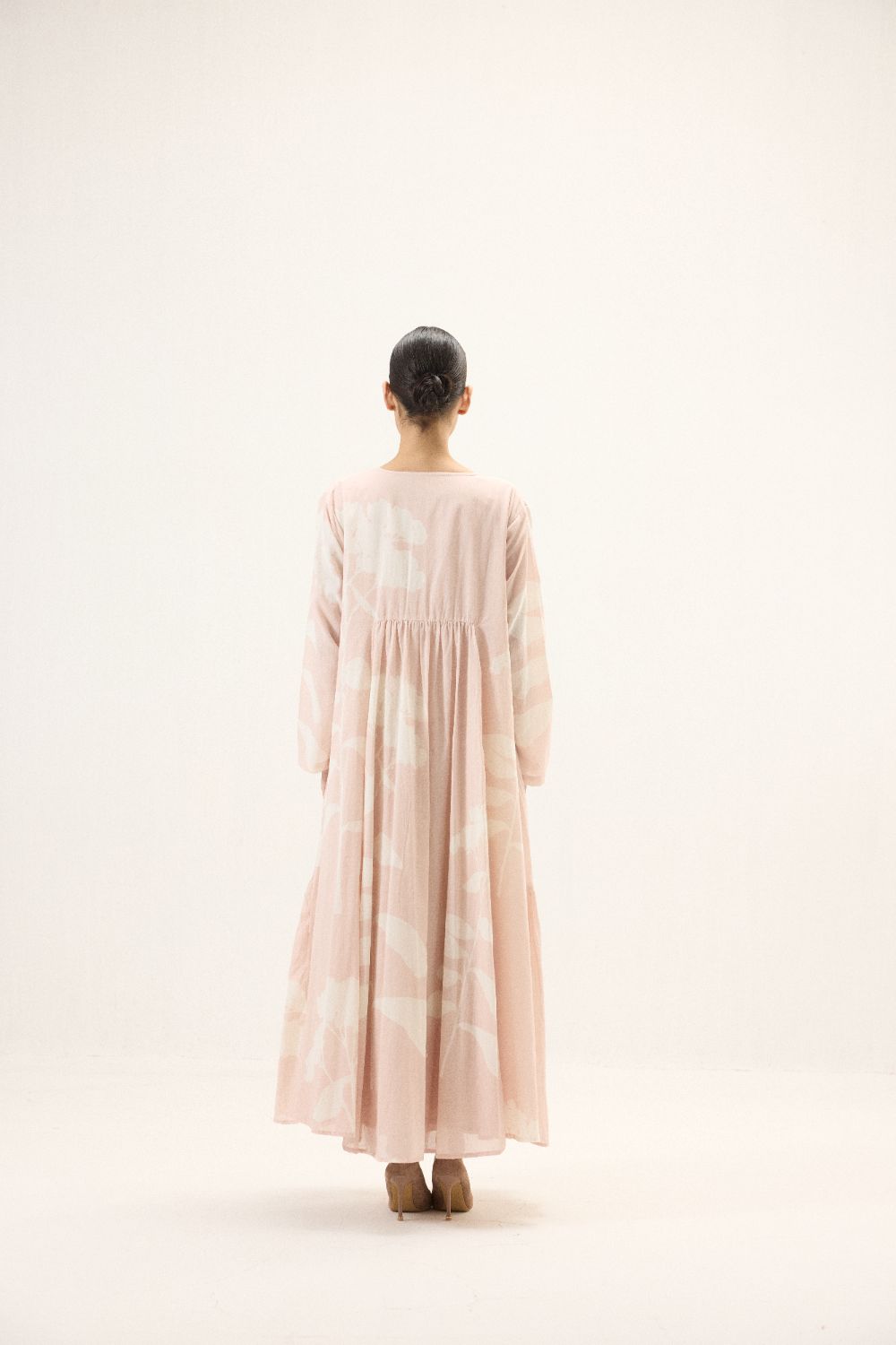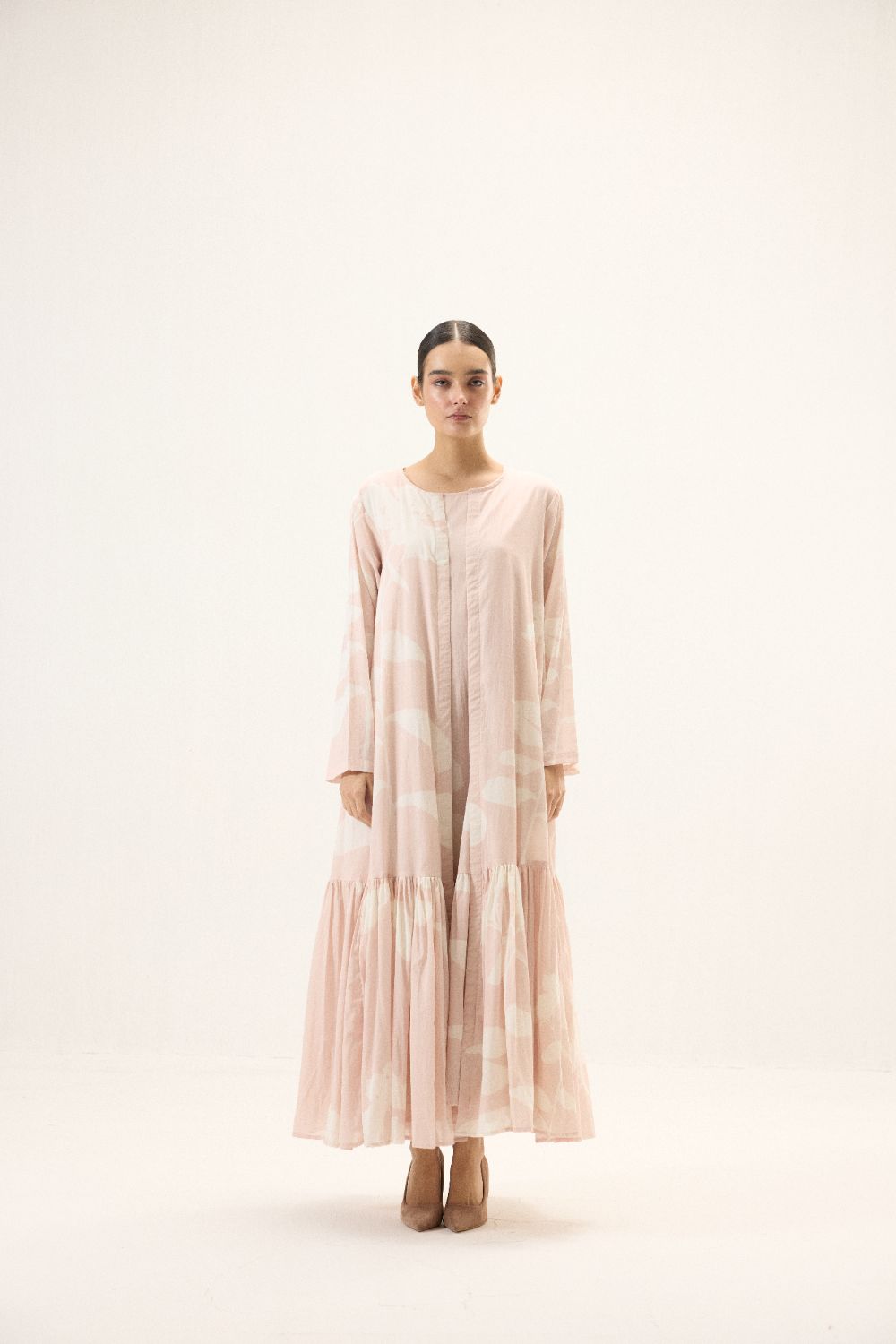 Crafted in soft cotton mul, this abaya set features a delicate floral print in pastel pink that dances across a flowy silhouette. Gathered panels at the bottom add gentle volume, while side pockets bring practical ease. Paired with a matching inner dress and scarf, it is an effortlessly graceful ensemble