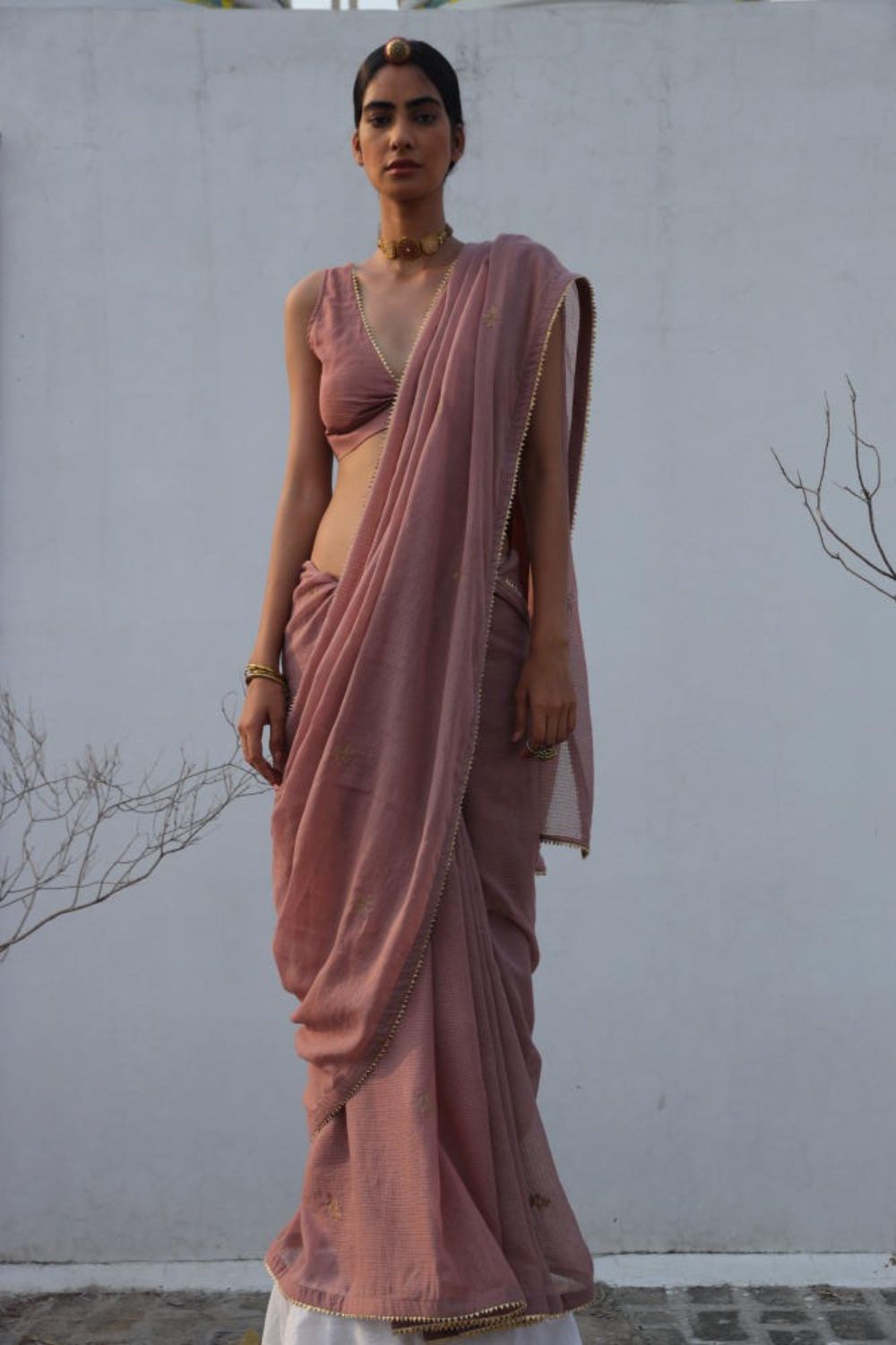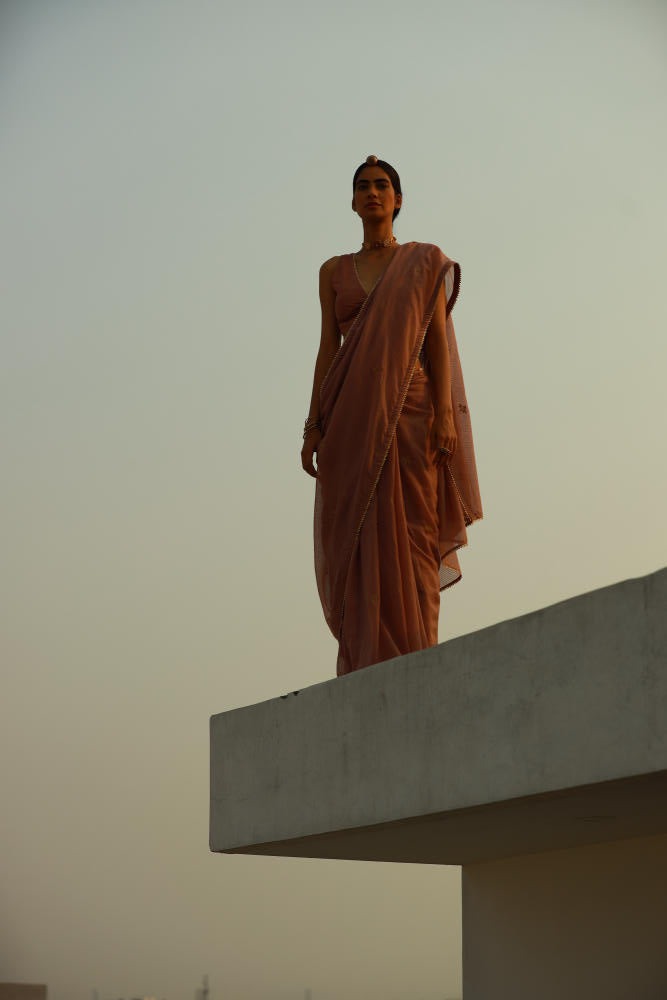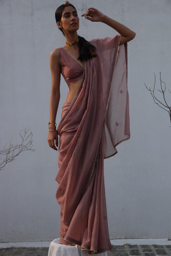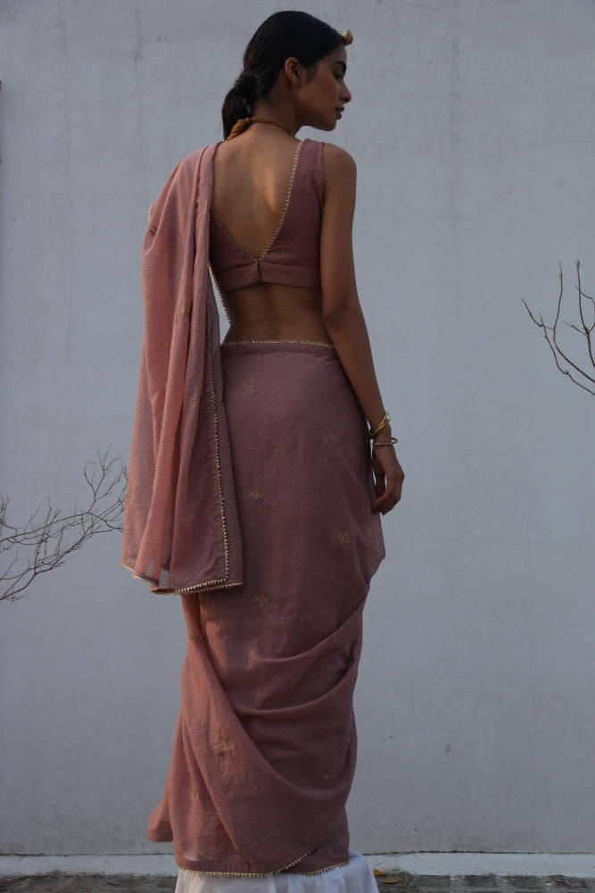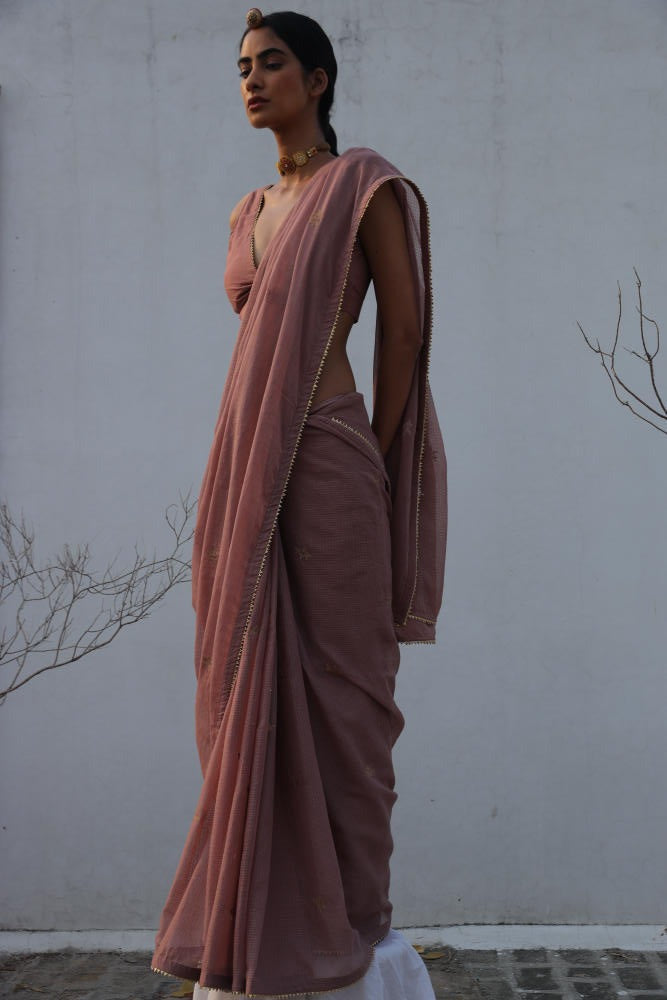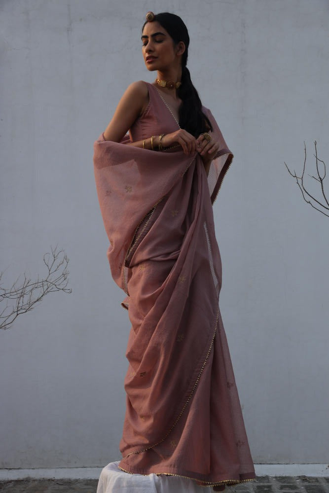An elegant onion pink kota doria saree with zari embroidery and gold lace trim. Comes with a deep V-neck cotton mulmul blouse featuring gold lace.