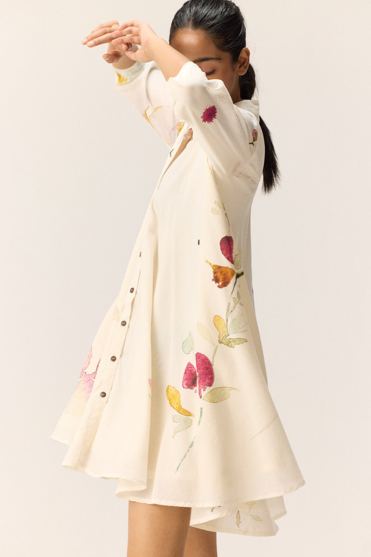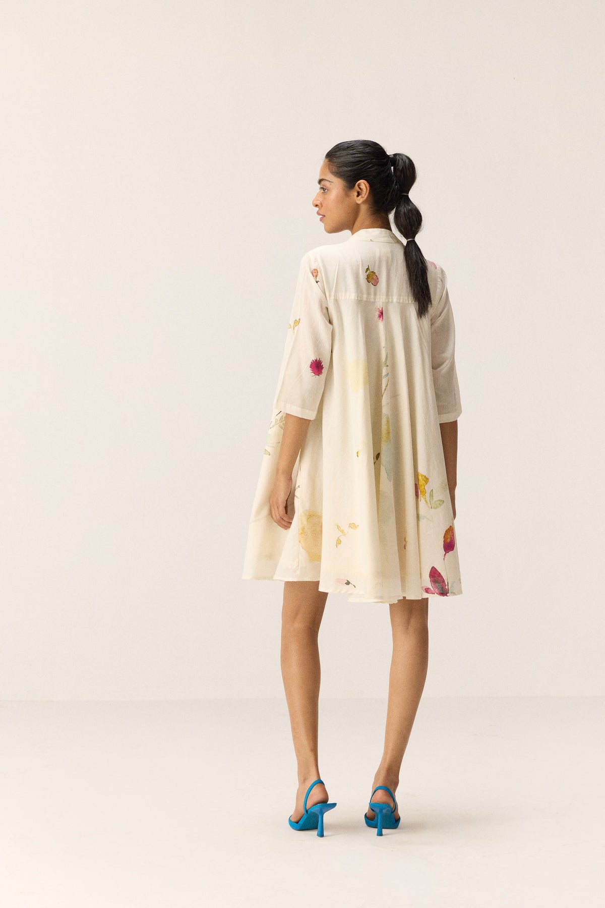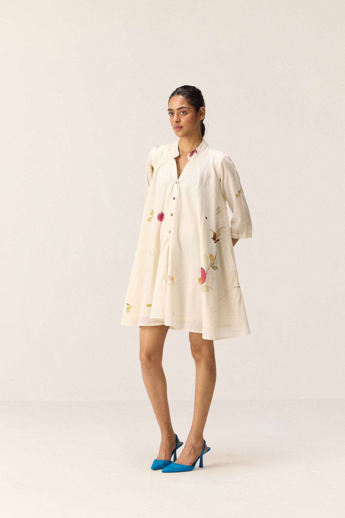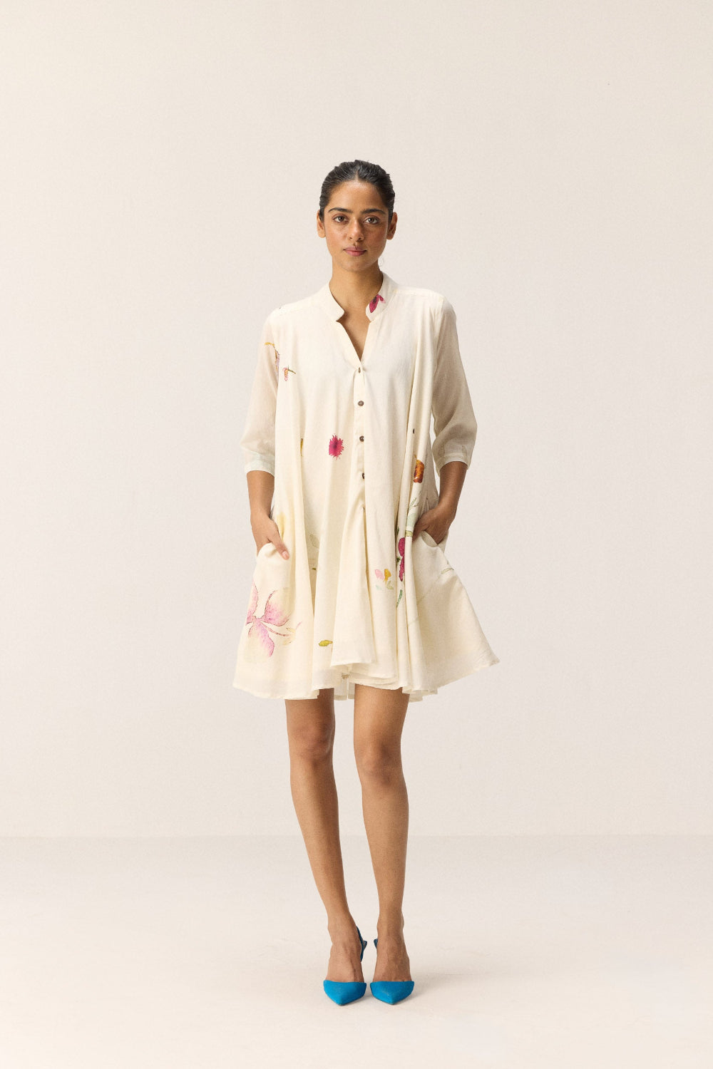 A short white dress crafted in soft, pure cotton mul, featuring an all-over floral print. Designed with a mandarin collar, front button opening, and practical side pockets, it blends classic structure with everyday ease.