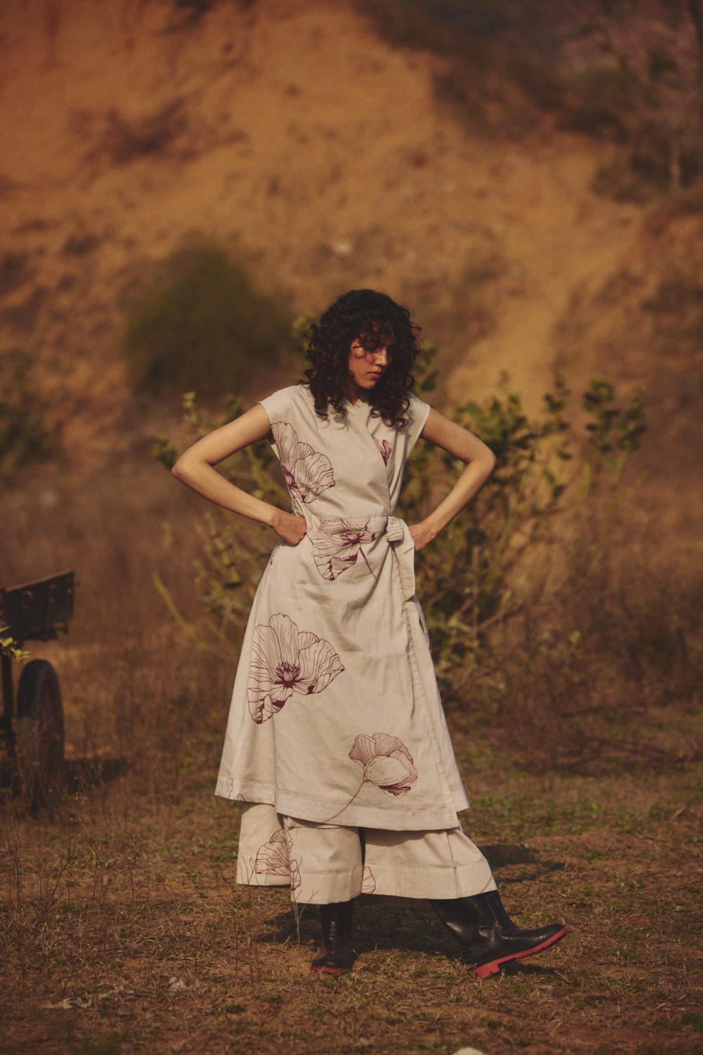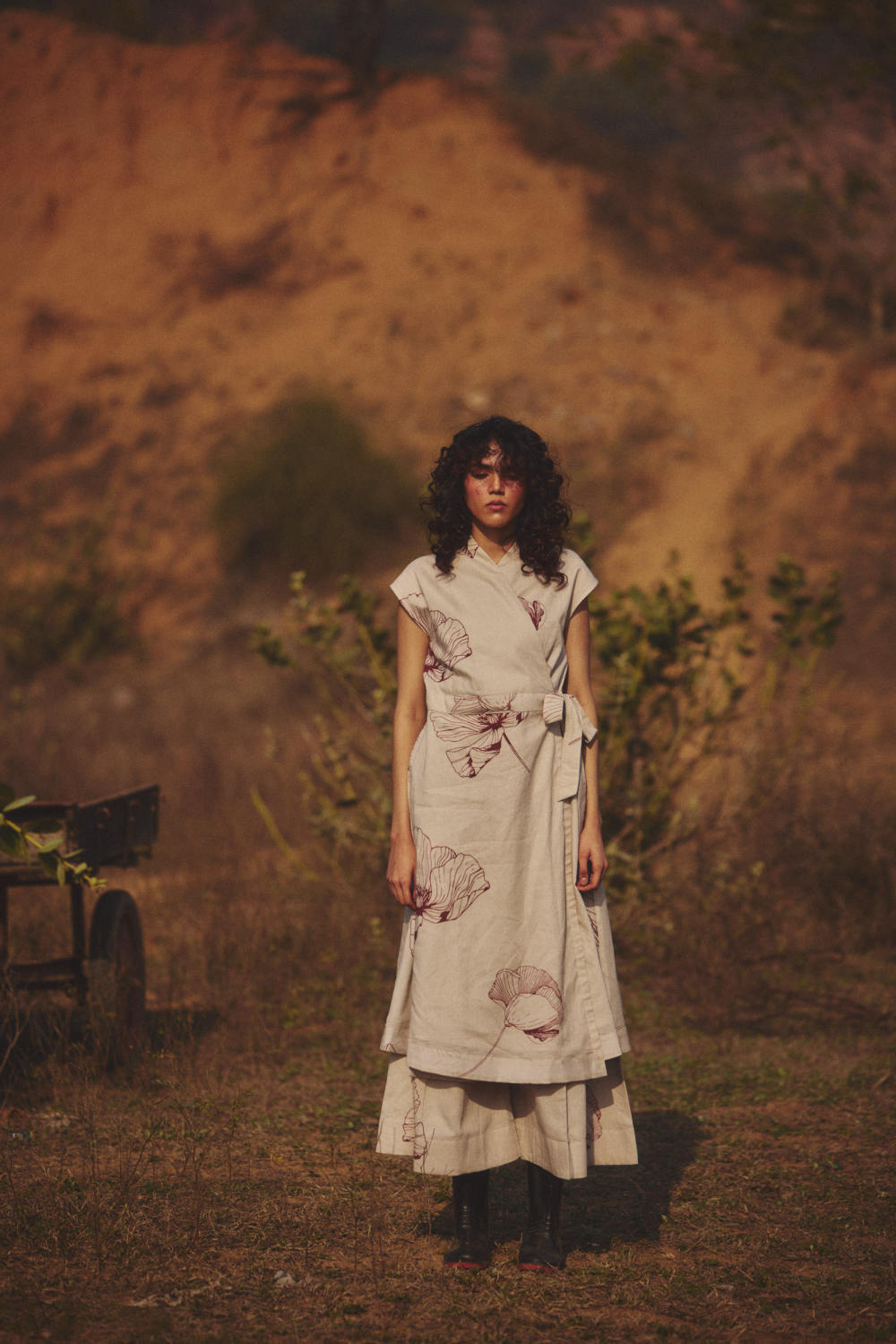 Featuring a wrap-style top with cap sleeves and a tie-up waist, paired with wide-leg pants. Adorned with delicate prints, it blends structure with ease for an effortless look.