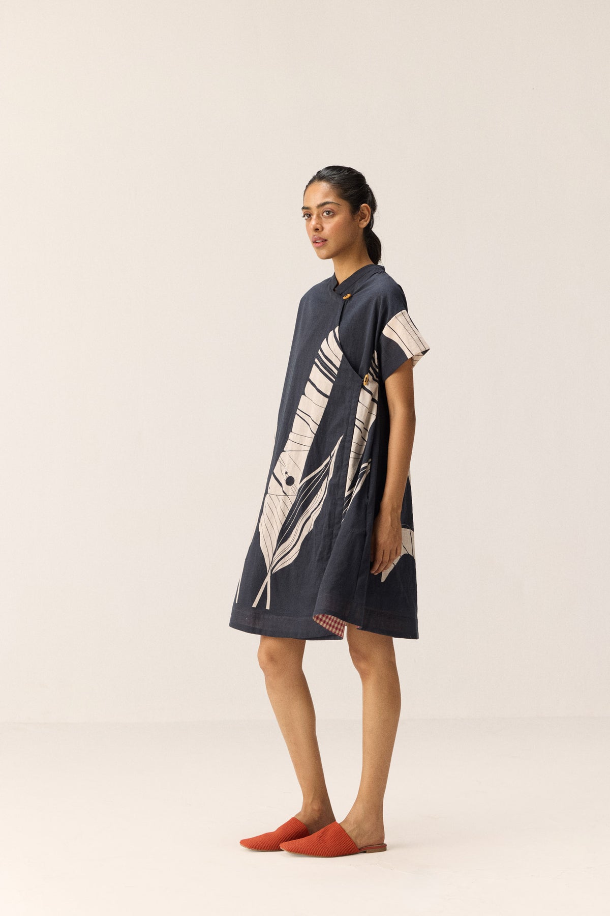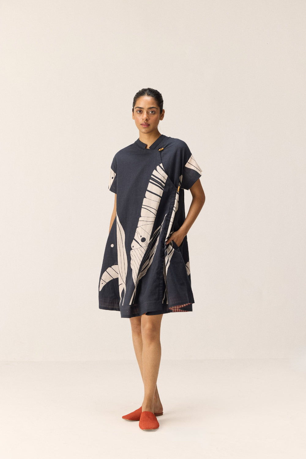 A black short dress featuring an overlap front panel with wooden button opening. Adorned with an abstract banana leaf print, it blends structure with ease. Thoughtfully designed with side seam pockets and fully lined for comfort. It has a red and white self weave fabric at the bottom for contrast