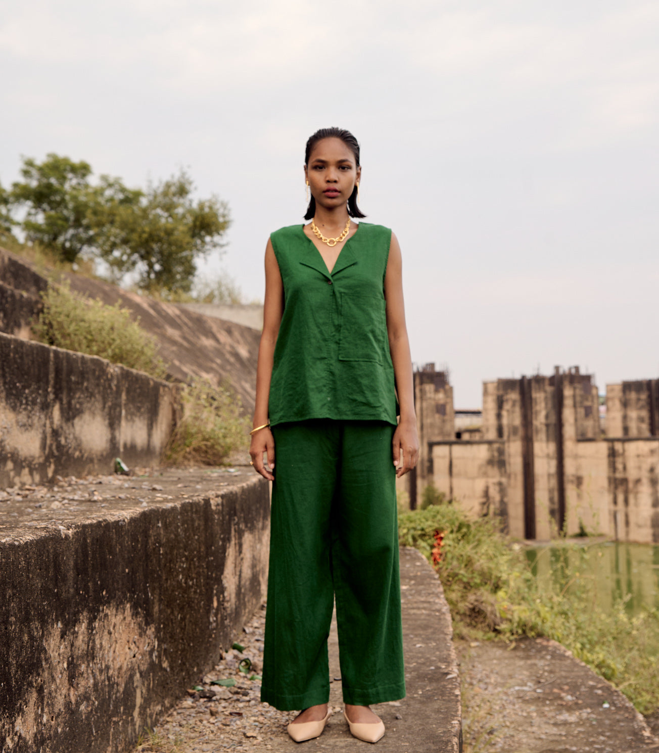 A forest green linen co-ord set. The tunic comes with front button opening, side slits and front patch pocket. Comes with a regular trouser with front button opening and side pockets.