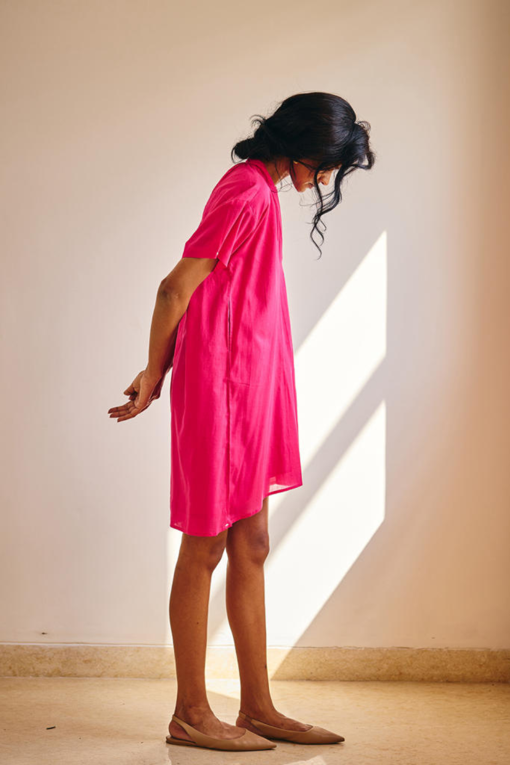 A hot pink relaxed fit dress featuring a v-neckline crafted in soft cotton mul Created to mirror the fire within.