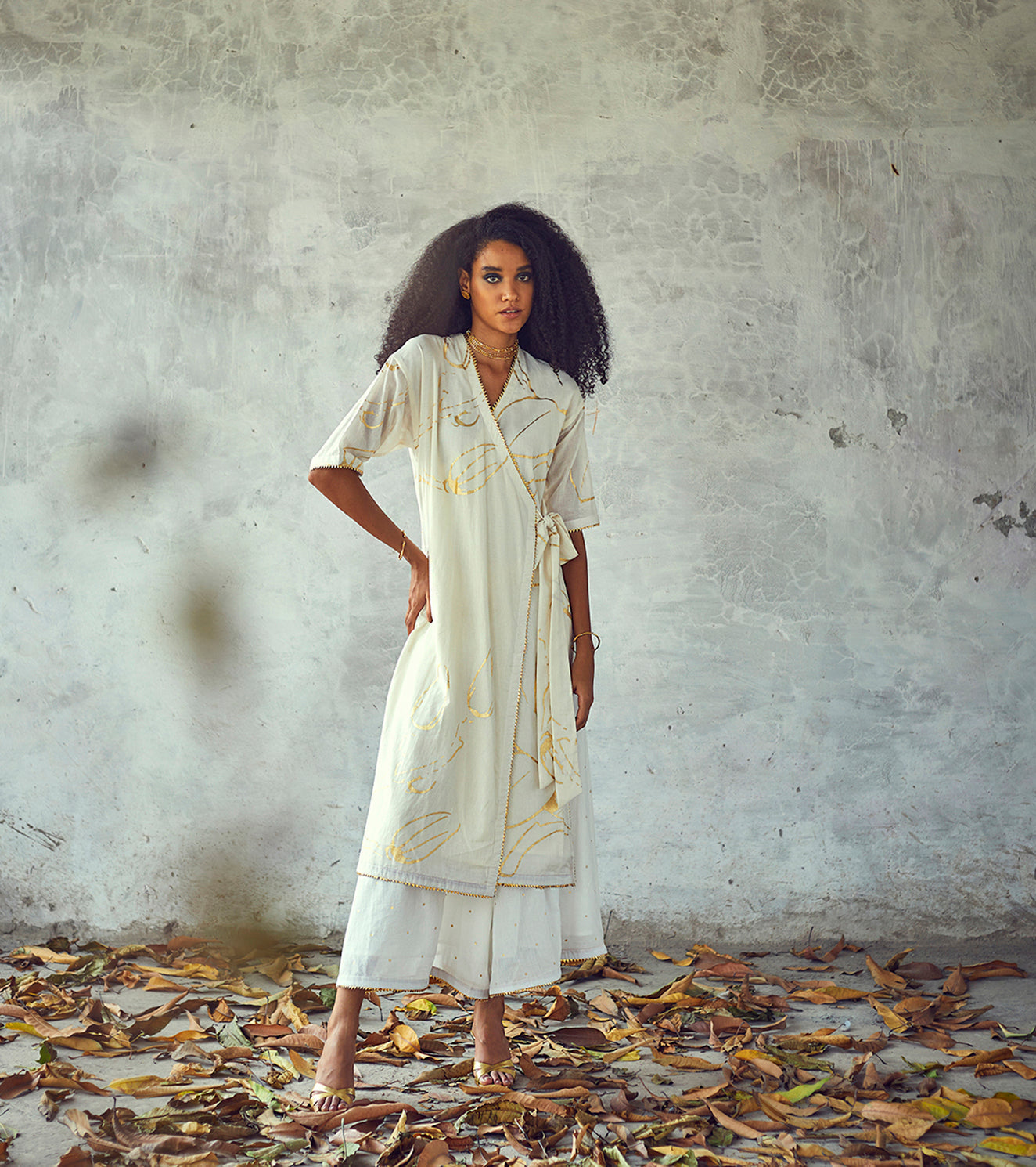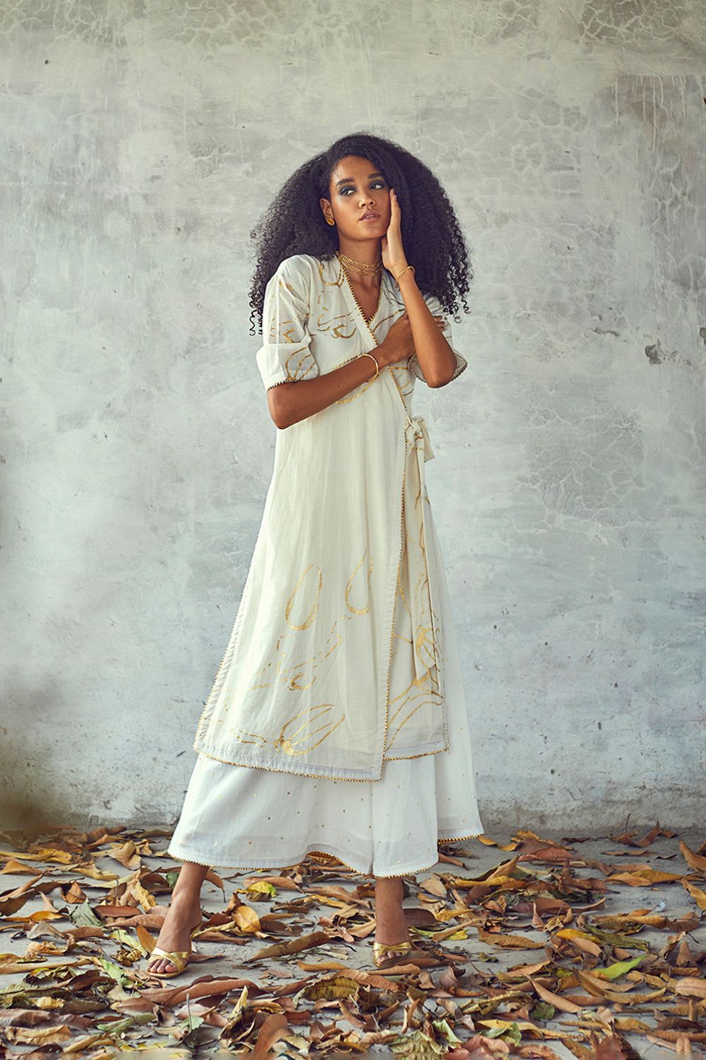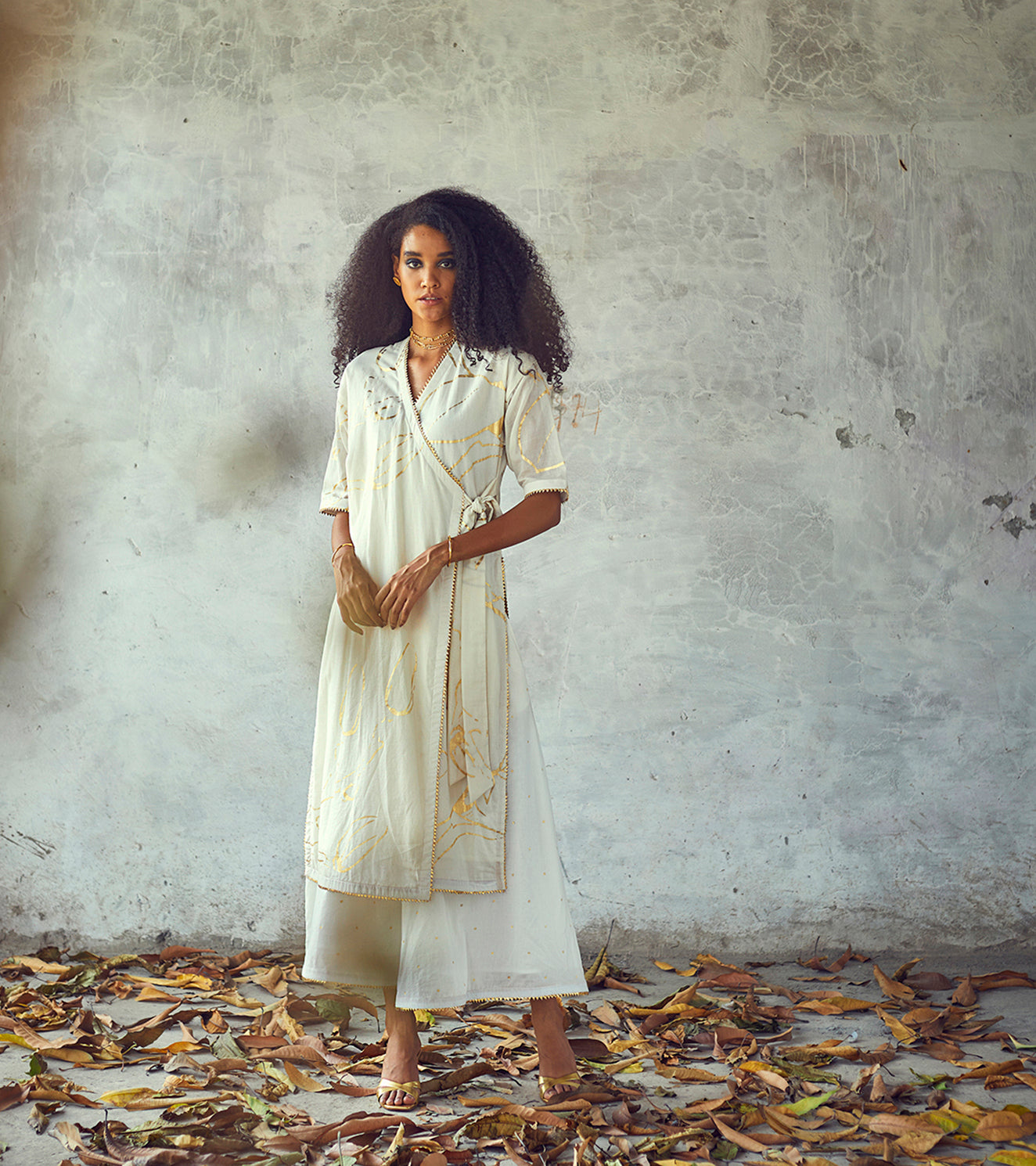 A floral foil printed wrap kurta with waist tie up and polka scattered foil printed pants. Club it with our gold hasli choker for a chic festive look.