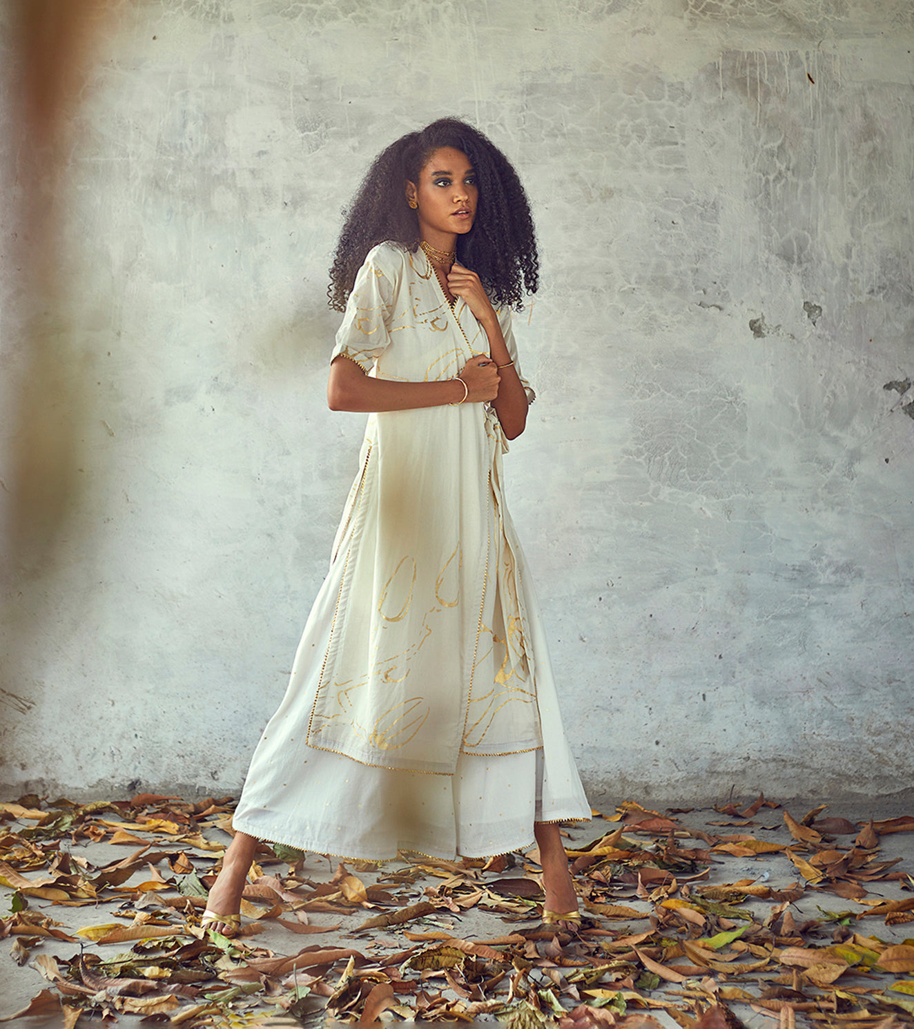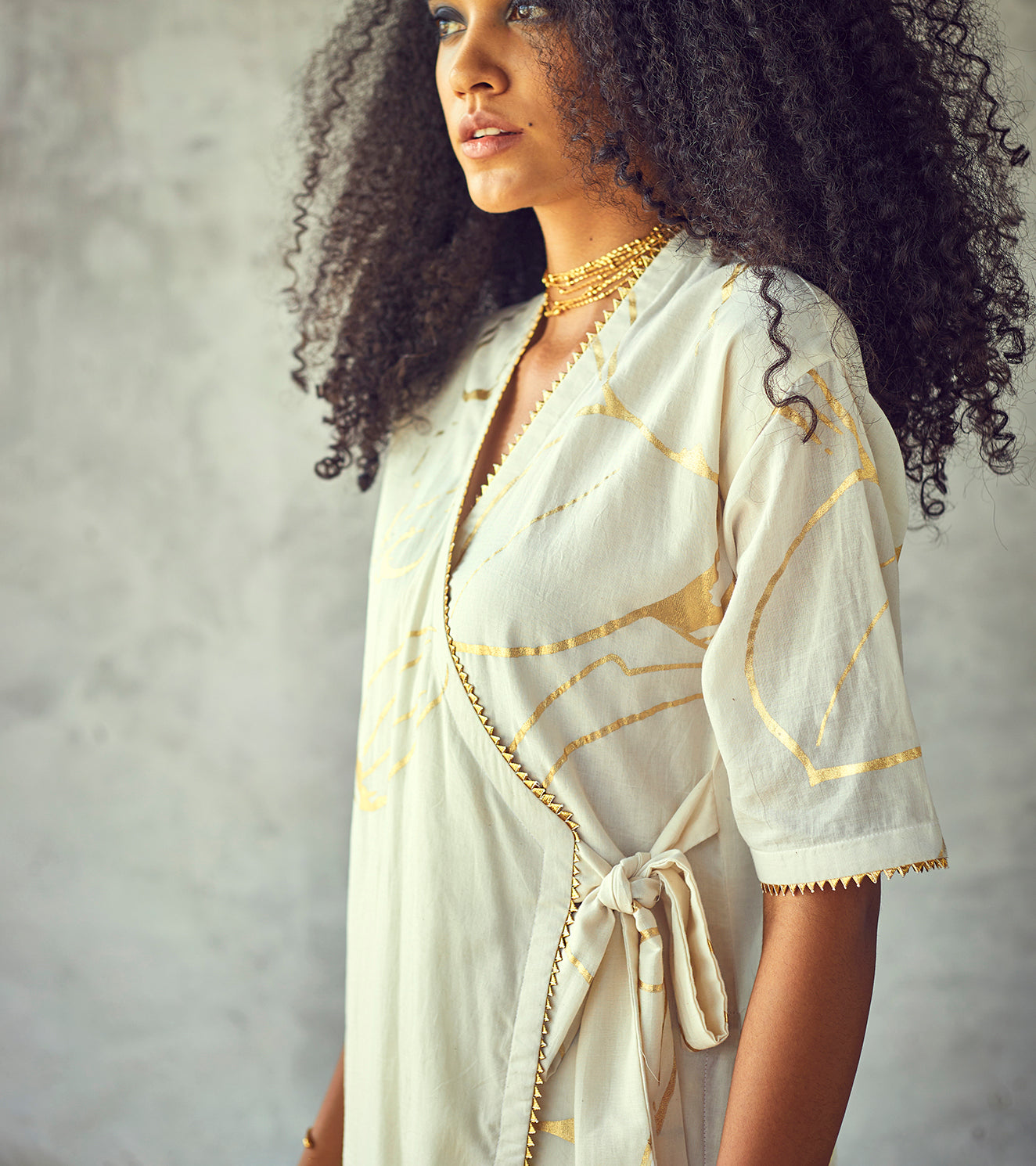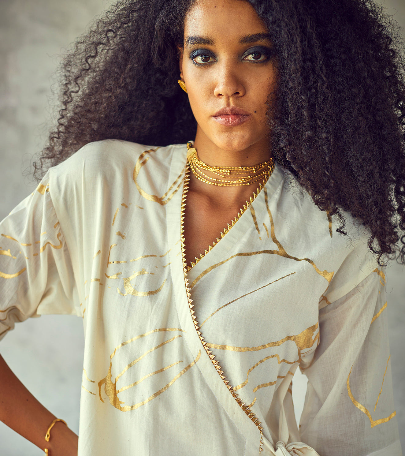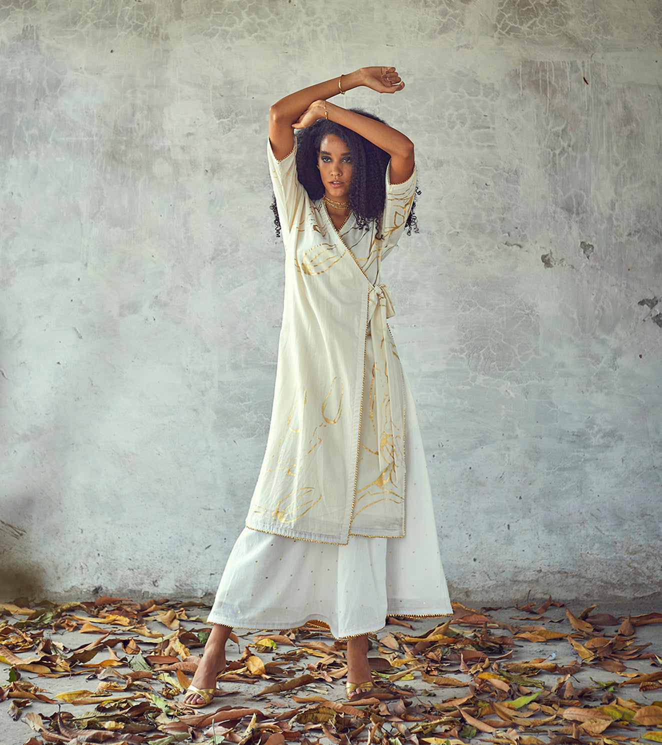 A floral foil printed wrap kurta with waist tie up and polka scattered foil printed pants. Club it with our gold hasli choker for a chic festive look.