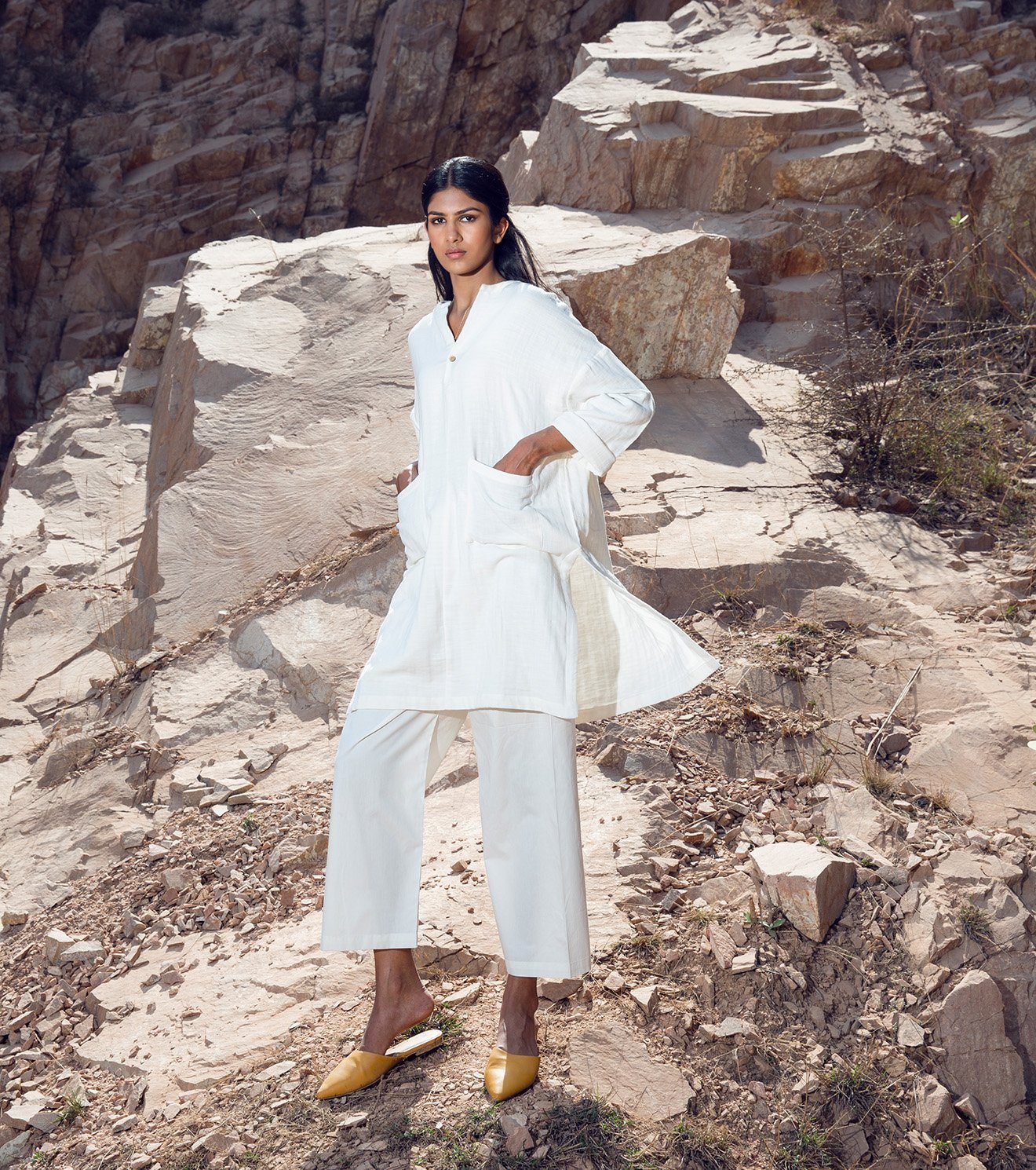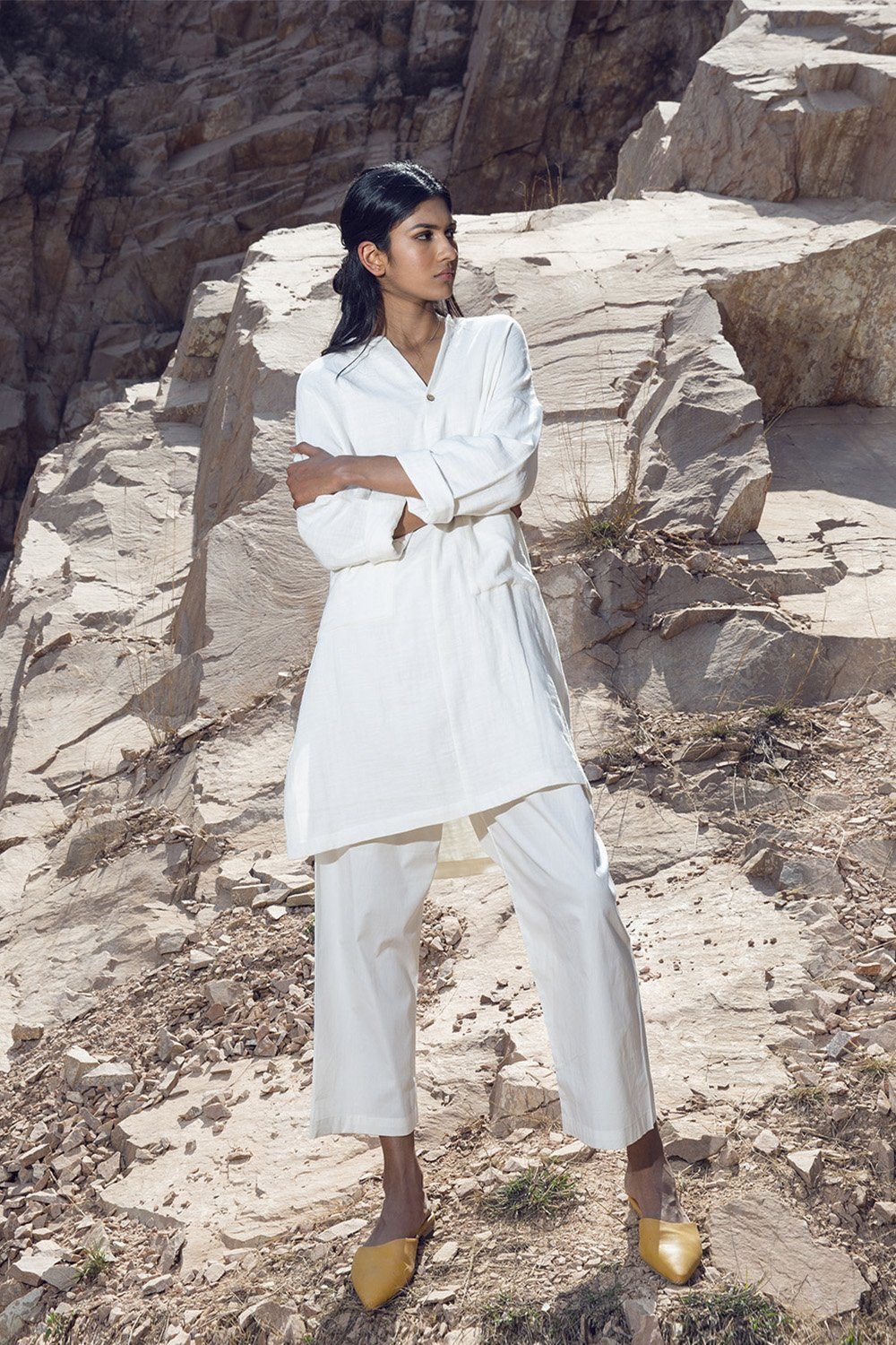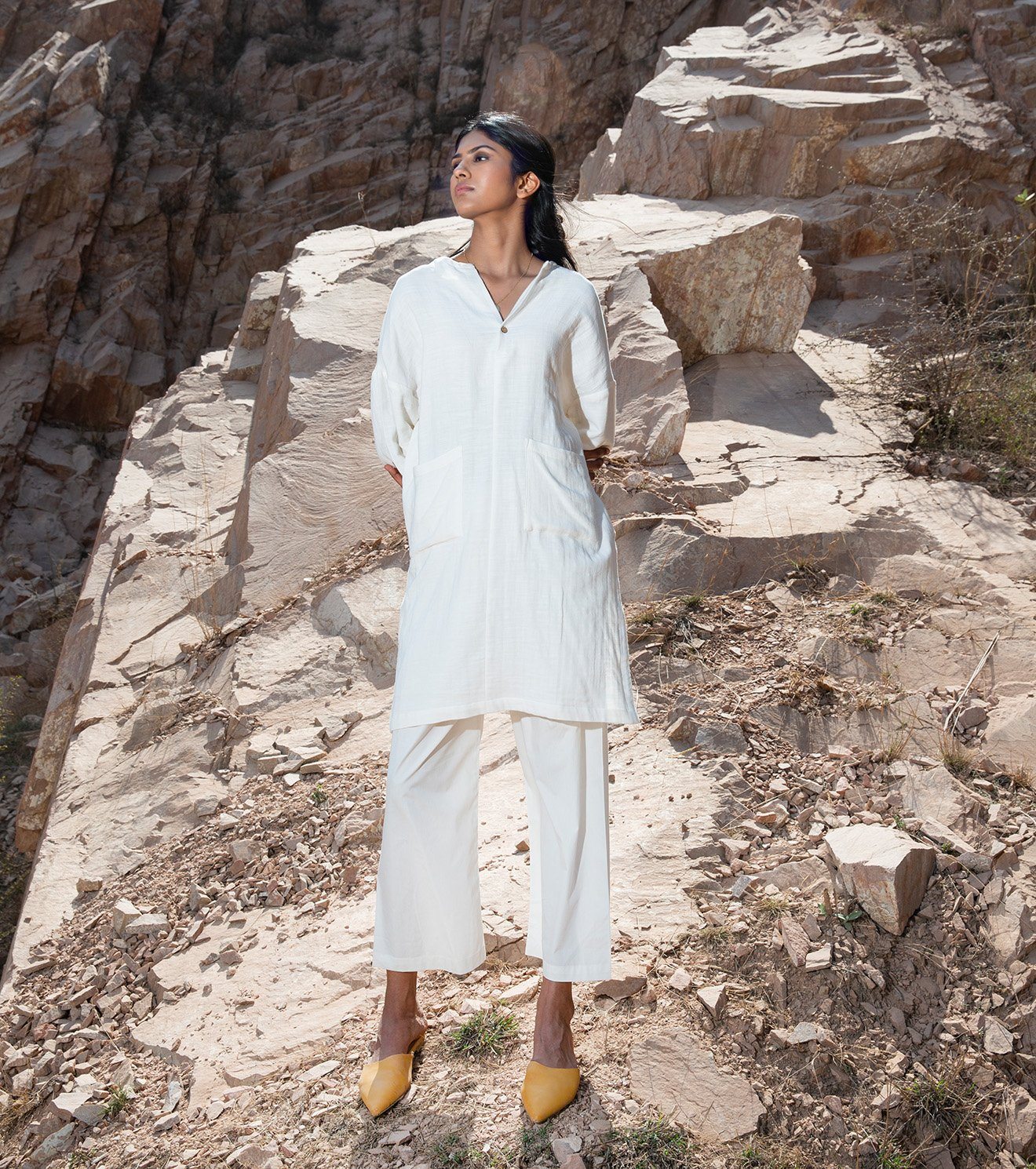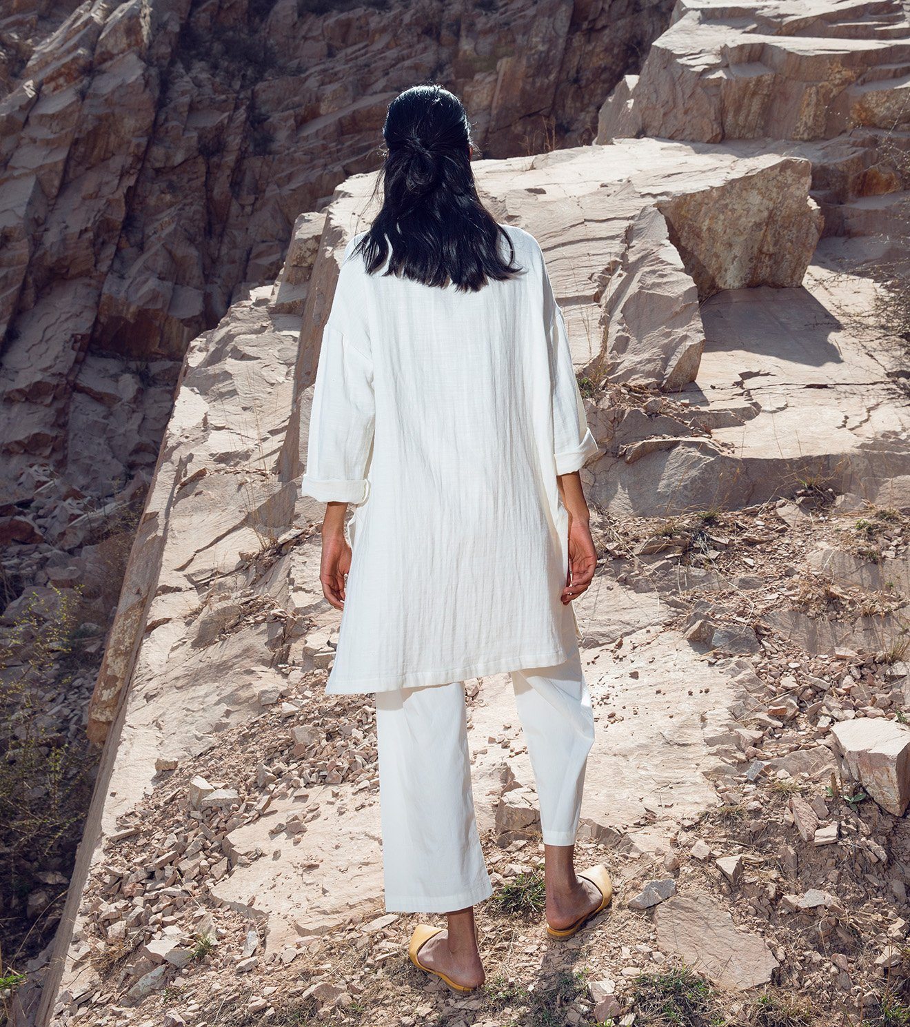 Seeing the light within and growing from there like lilies on water. A tunic and pants co-ord set in white. Short khadi tunic with a button, front pockets and long sleeves paired up with poplin pants.