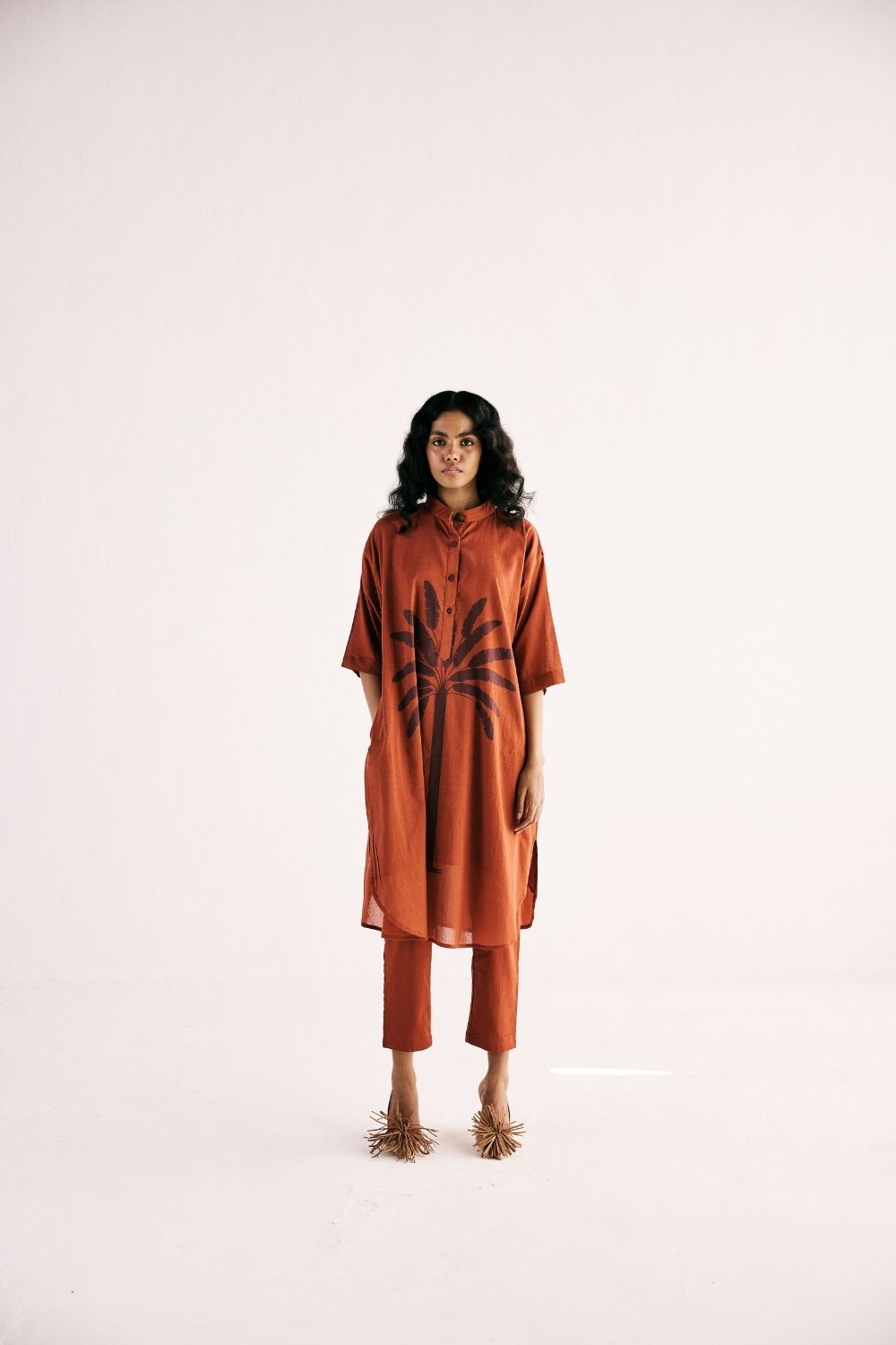 A rustic red signature palm printed kurta set with front button opening crafted in soft cotton mul paired with cotton mul pencil pants fully elasticated.