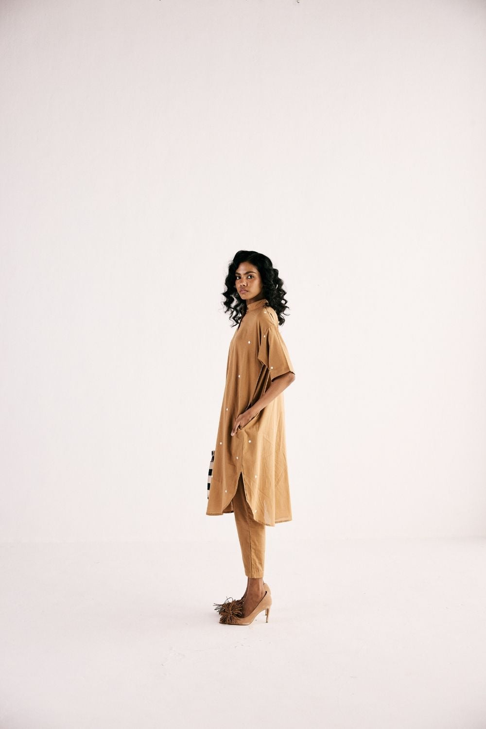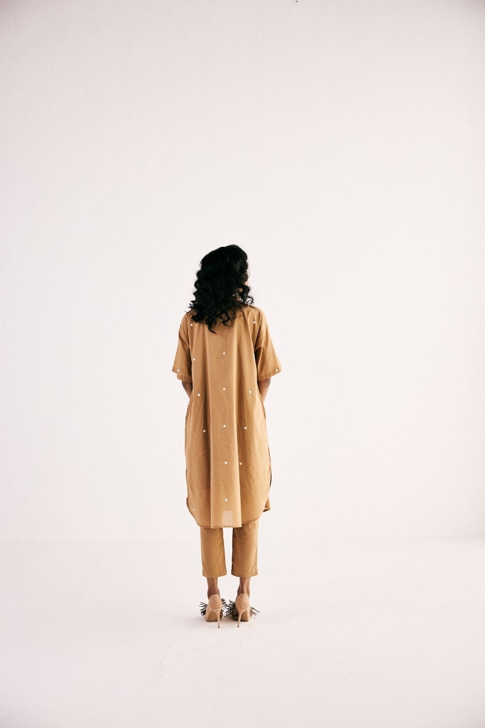 A Sand polka dot printed kurta with front button opening crafted in soft cotton mul paired with cotton mul pencil pants fully elasticated. Kurta Set, Pants