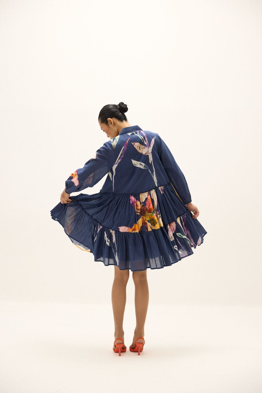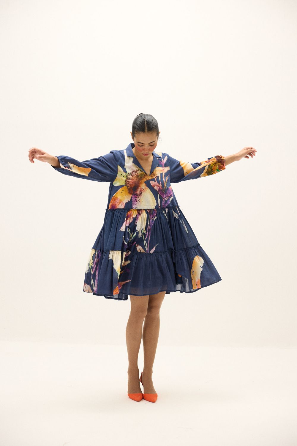 A tiered mini dress in cotton mul, adorned with abstract floral prints in painterly hues of violet, saffron, and ivory on a navy base. Featuring a relaxed collared neckline, full sleeves, and a fluid gathered skirt, it captures a sense of ease and movement in every step.