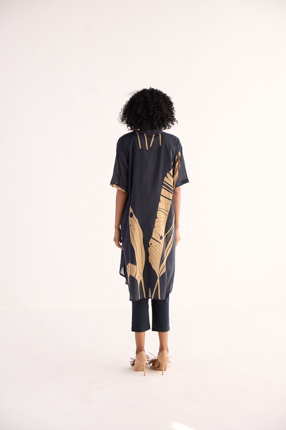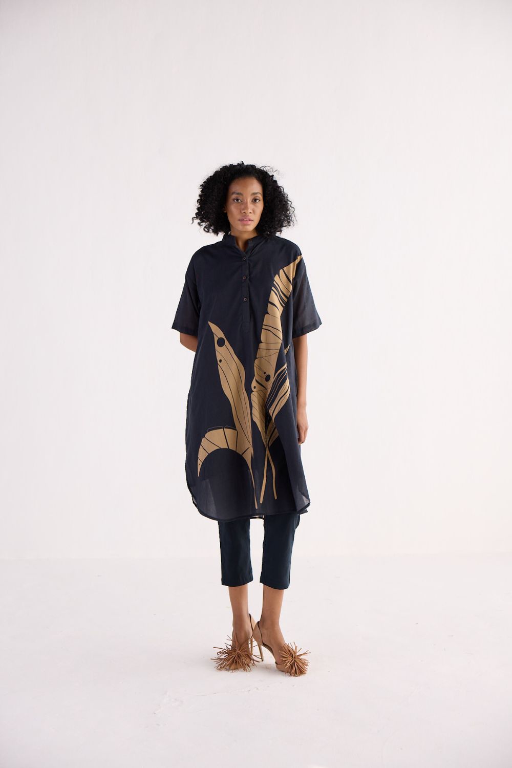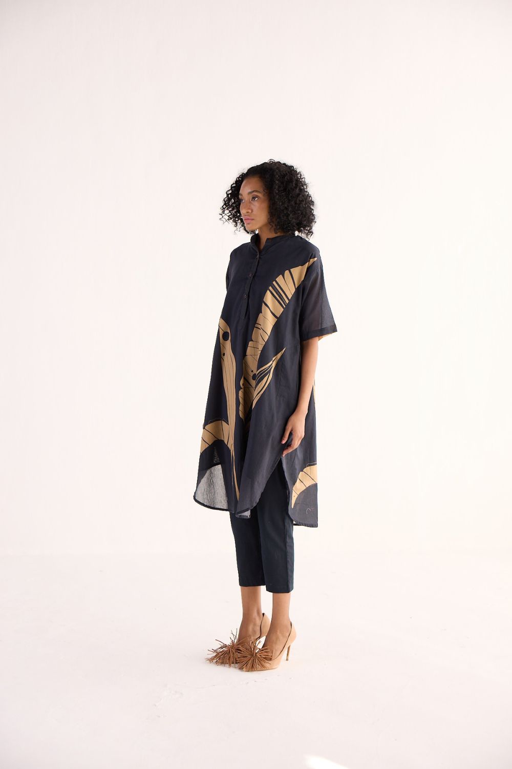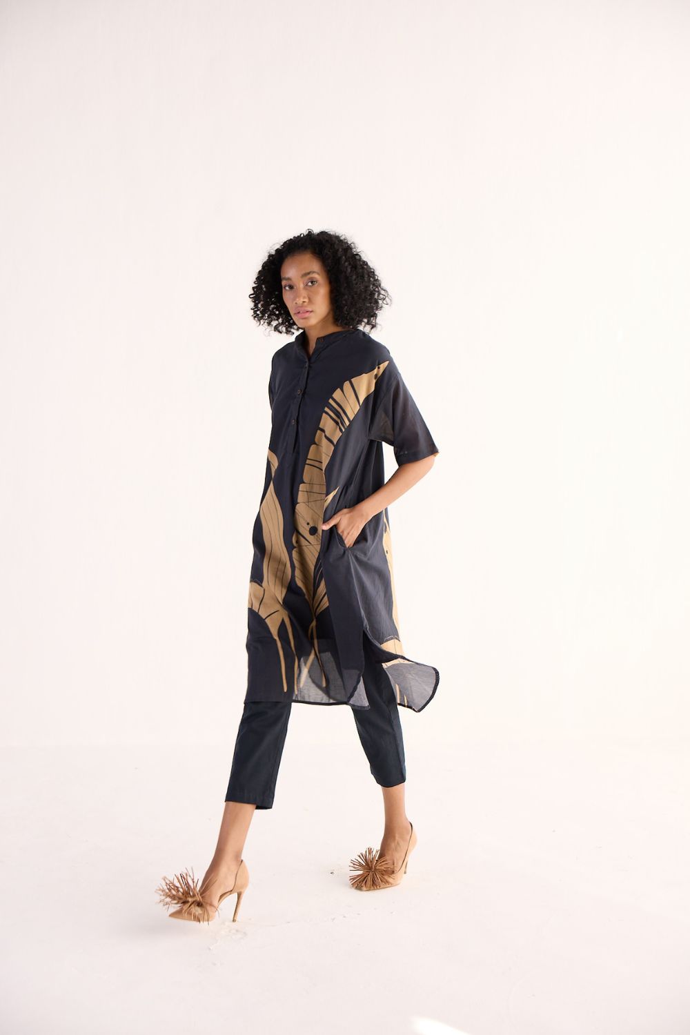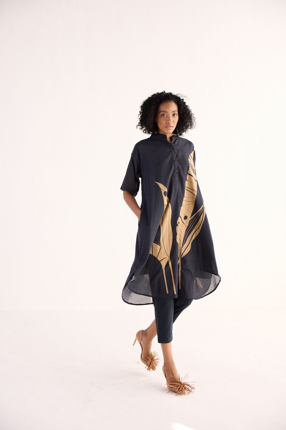 A charcoal black floral printed kurta with front button opening crafted in soft cotton mul paired with cotton mul pencil pants fully elasticated. Kurta Set
