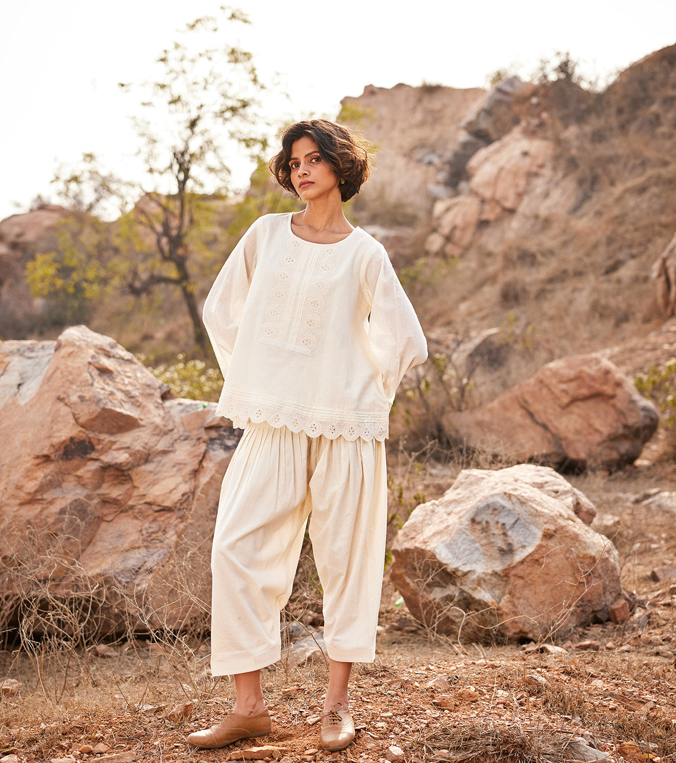 An off white top with lace details in the neckline and cuffs crafted in breathable cotton mul fabric. - Handcrafted in India.