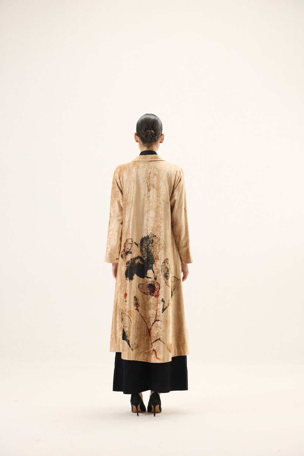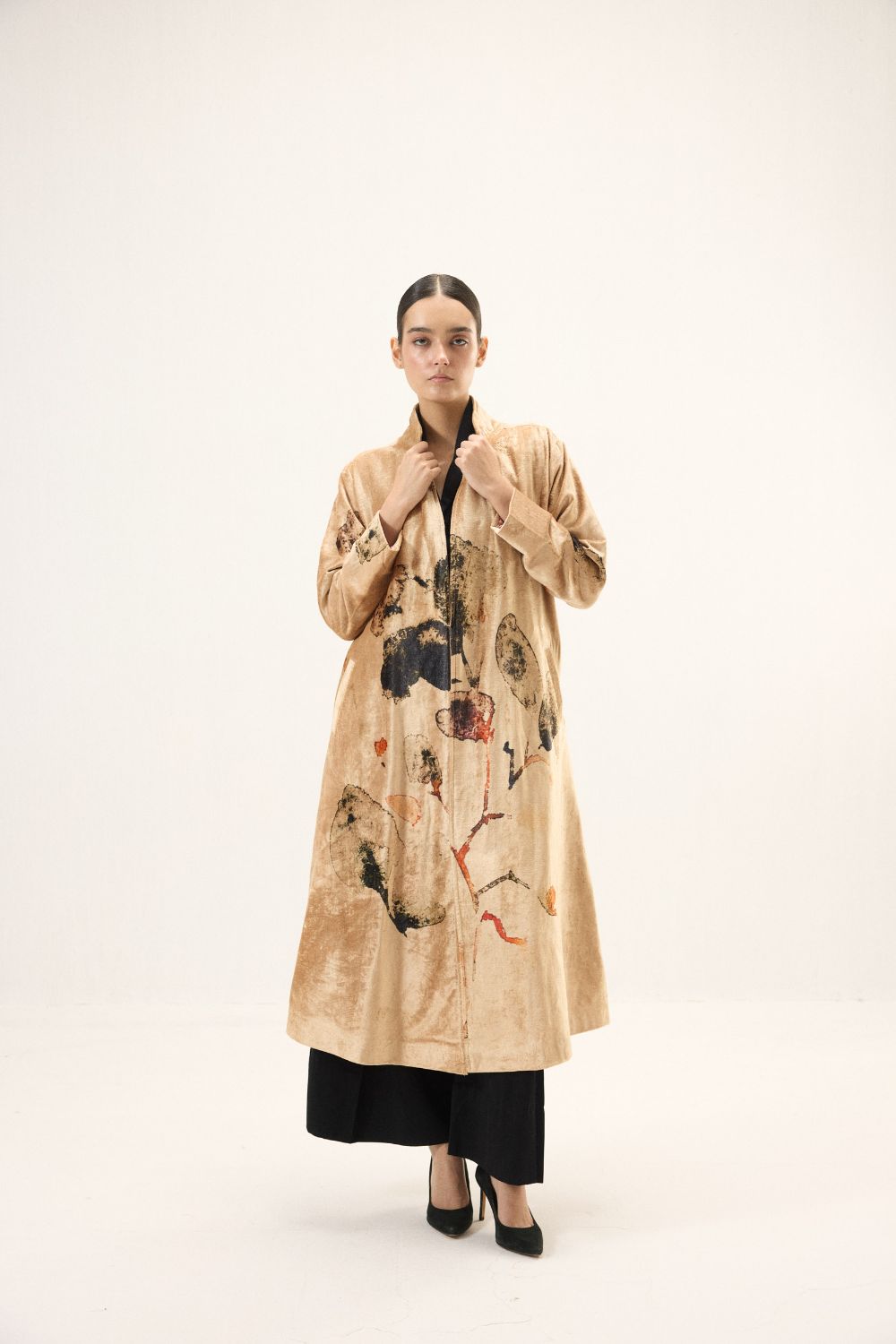 Crafted in rich golden velvet, this trench coat is a statement of quiet opulence. The fabric’s natural sheen lends a luminous depth, while bold abstract florals across the surface, create a striking visual contrast. Designed with long sleeves and a fluid silhouette, it layers effortlessly, balancing artistic expression with timeless elegance for a truly elevated outerwear piece. Lining: Red Checkered Mul Lining