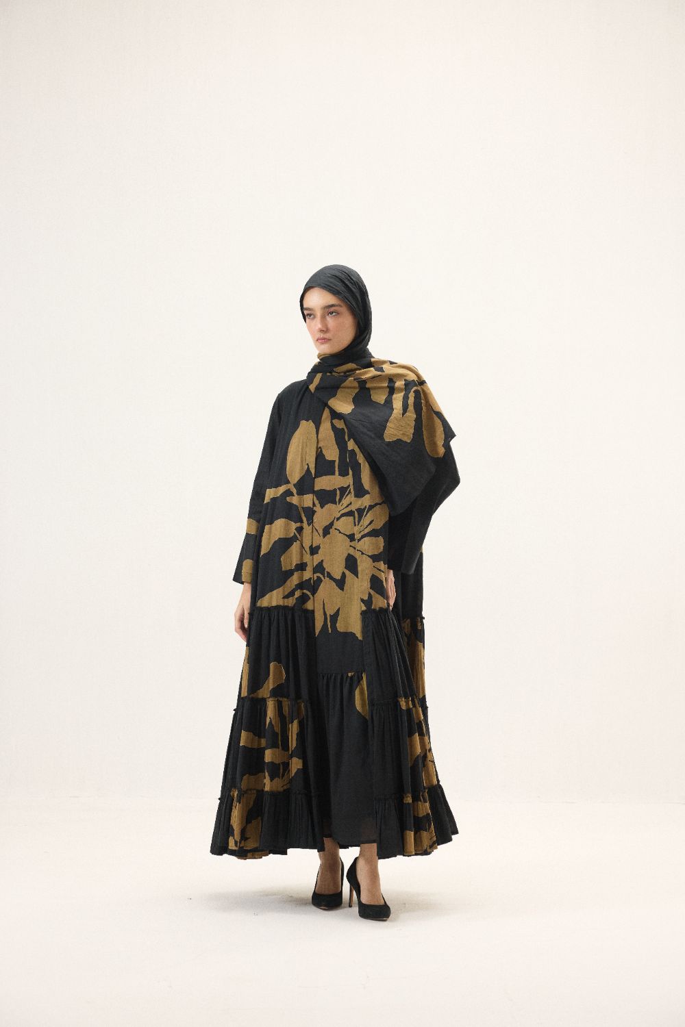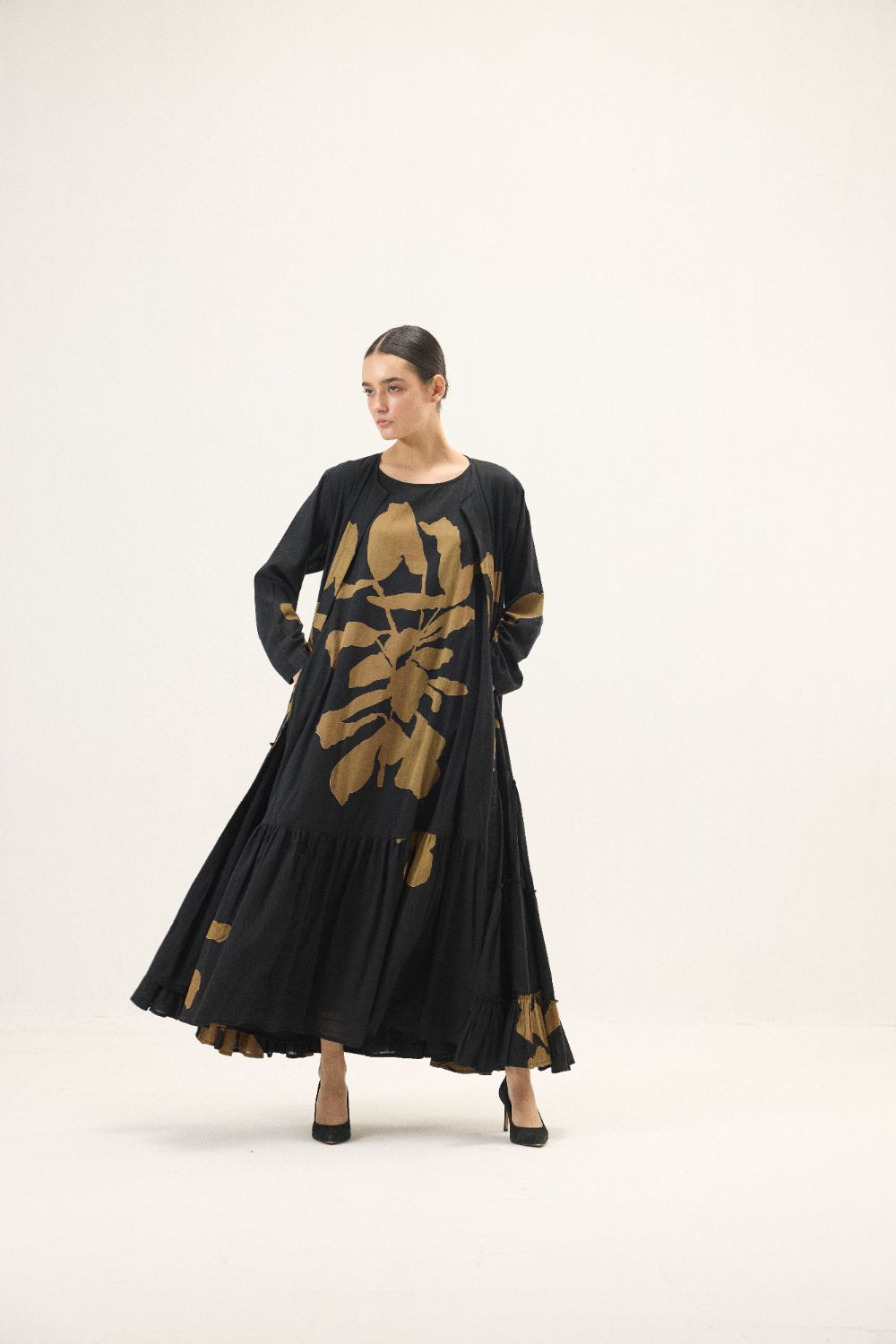 Crafted in soft cotton mul, this abaya set features bold abstract botanical motifs in earthy brown over black base across a flowy silhouette. Gathered panels at the bottom add gentle volume, while side pockets bring practical ease. Paired with a matching inner dress and scarf, it is an effortlessly graceful ensemble, quietly striking, comfortable, and timeless.