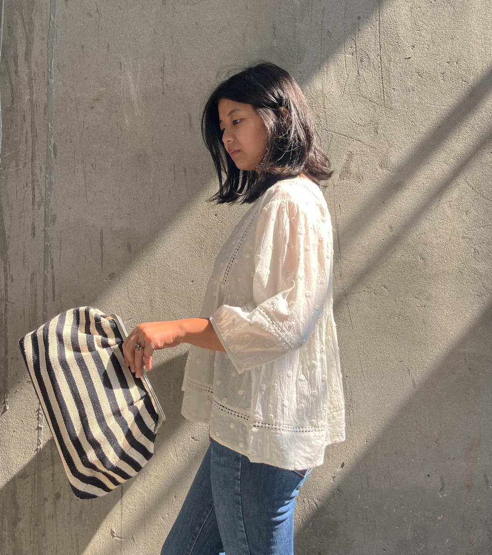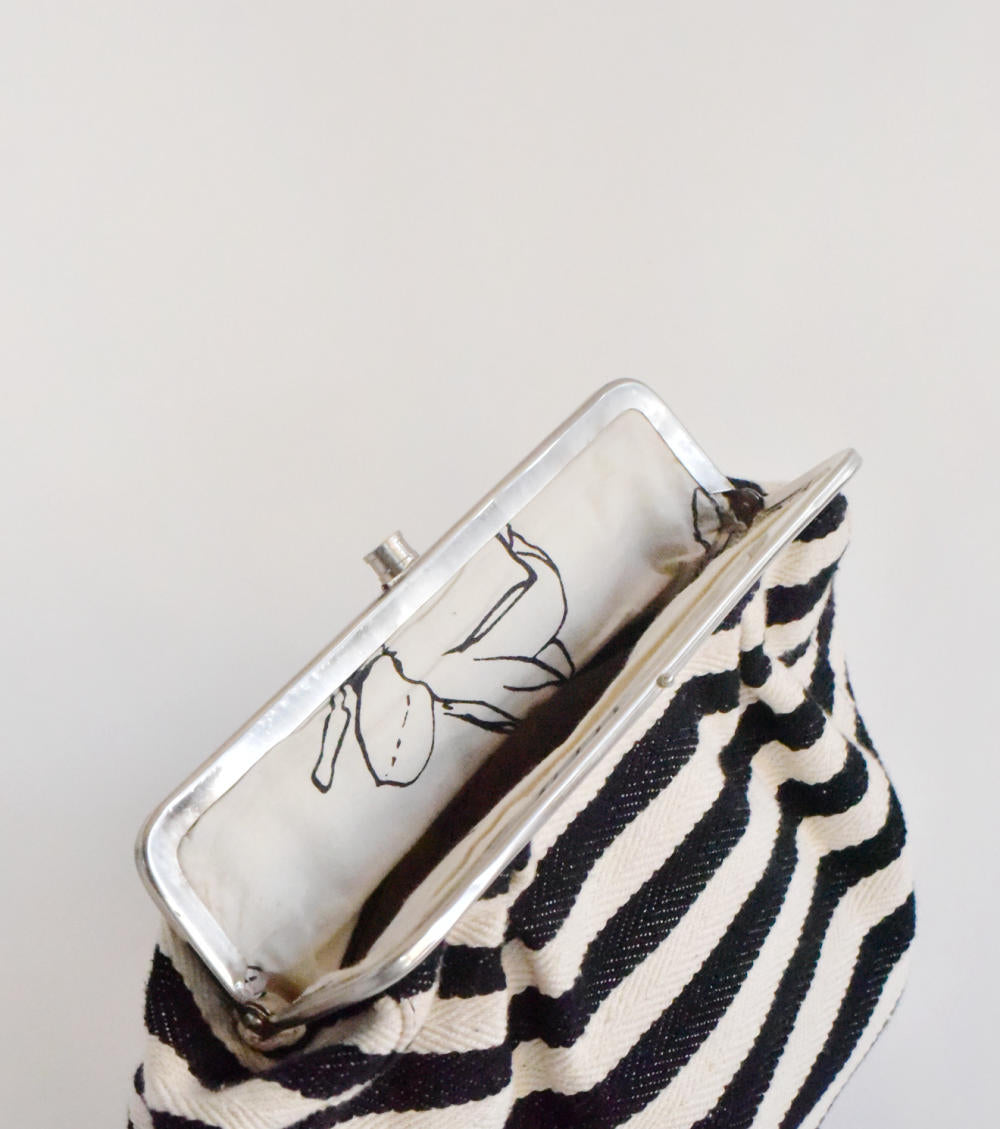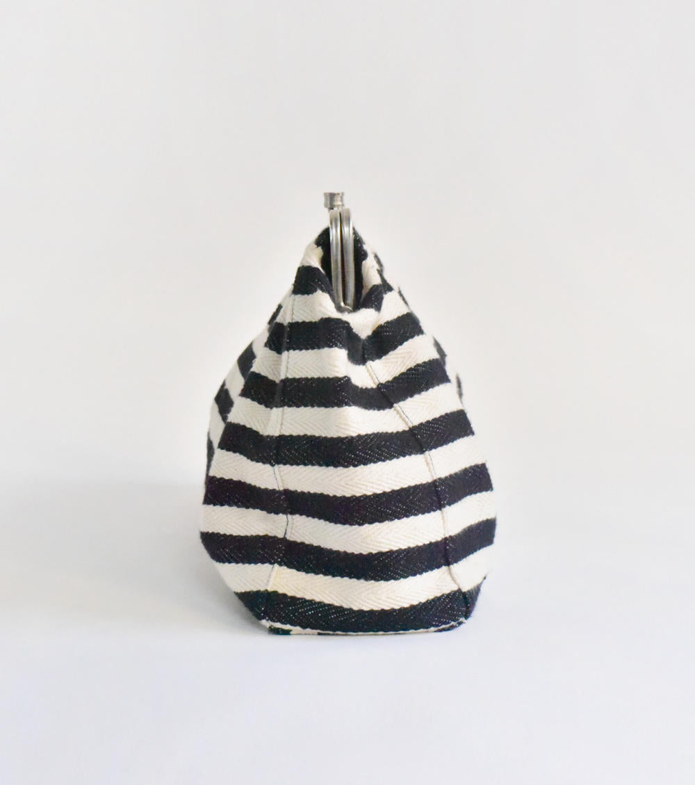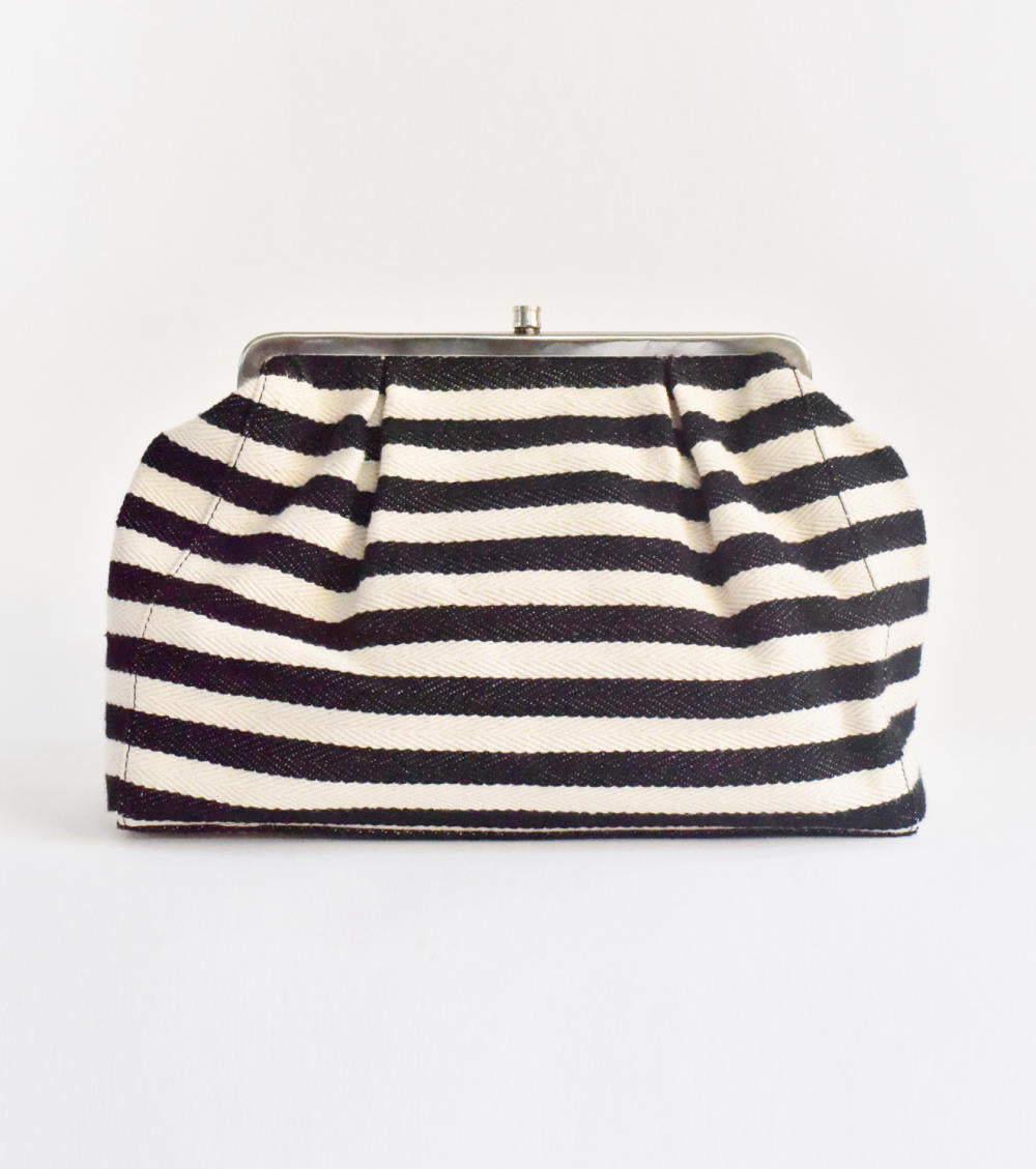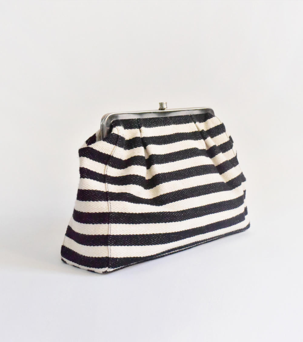A spacious black and white stripe clutch handcrafted in handloom cotton. She comes with two inside pockets. A perfect bag to carry when you want to carry your essentials and standout at the same time.