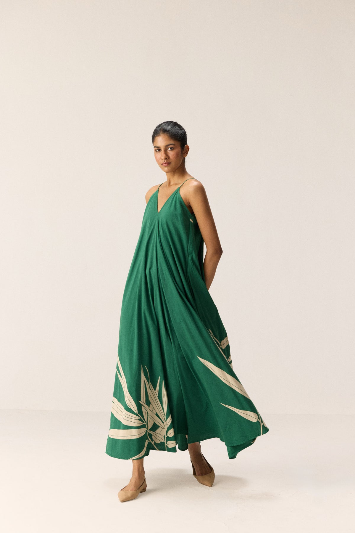 Tender Fern is a strappy cotton mul gown in a striking shade of green, featuring a delicate white fern print on the front. Effortlessly elegant, it’s designed for graceful movement and summer ease, complete with practical side seam pockets.