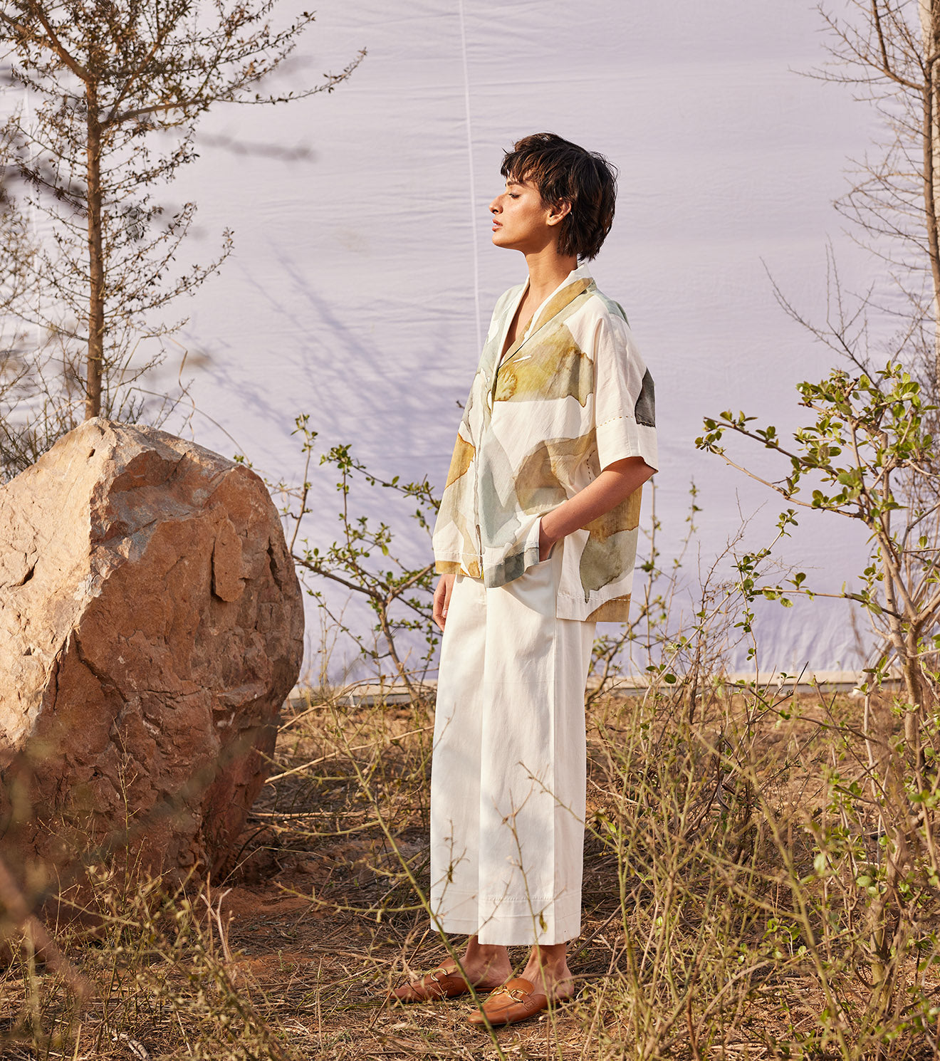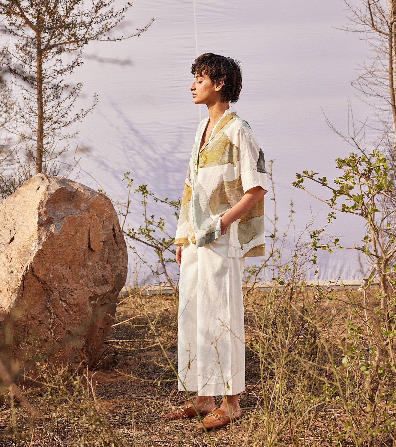 An off white co ord set featuring a floral printed shirt with shawl lapels and wide twill bottoms crafted in breathable cotton fabric. - Handcrafted in India. - 2 Side pockets