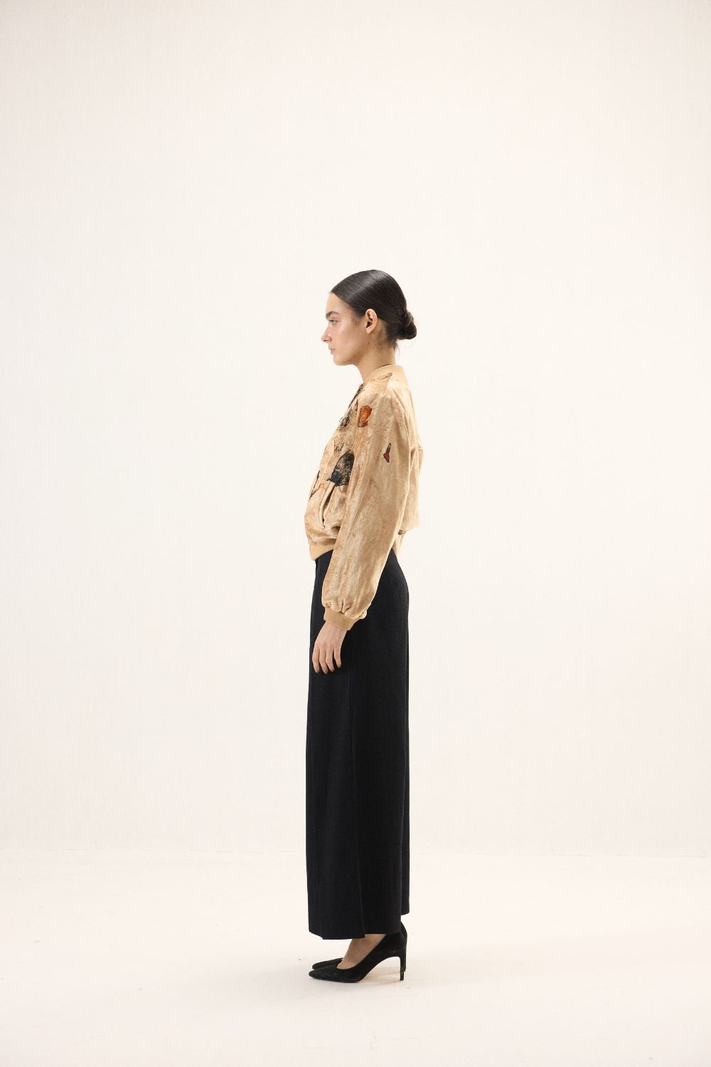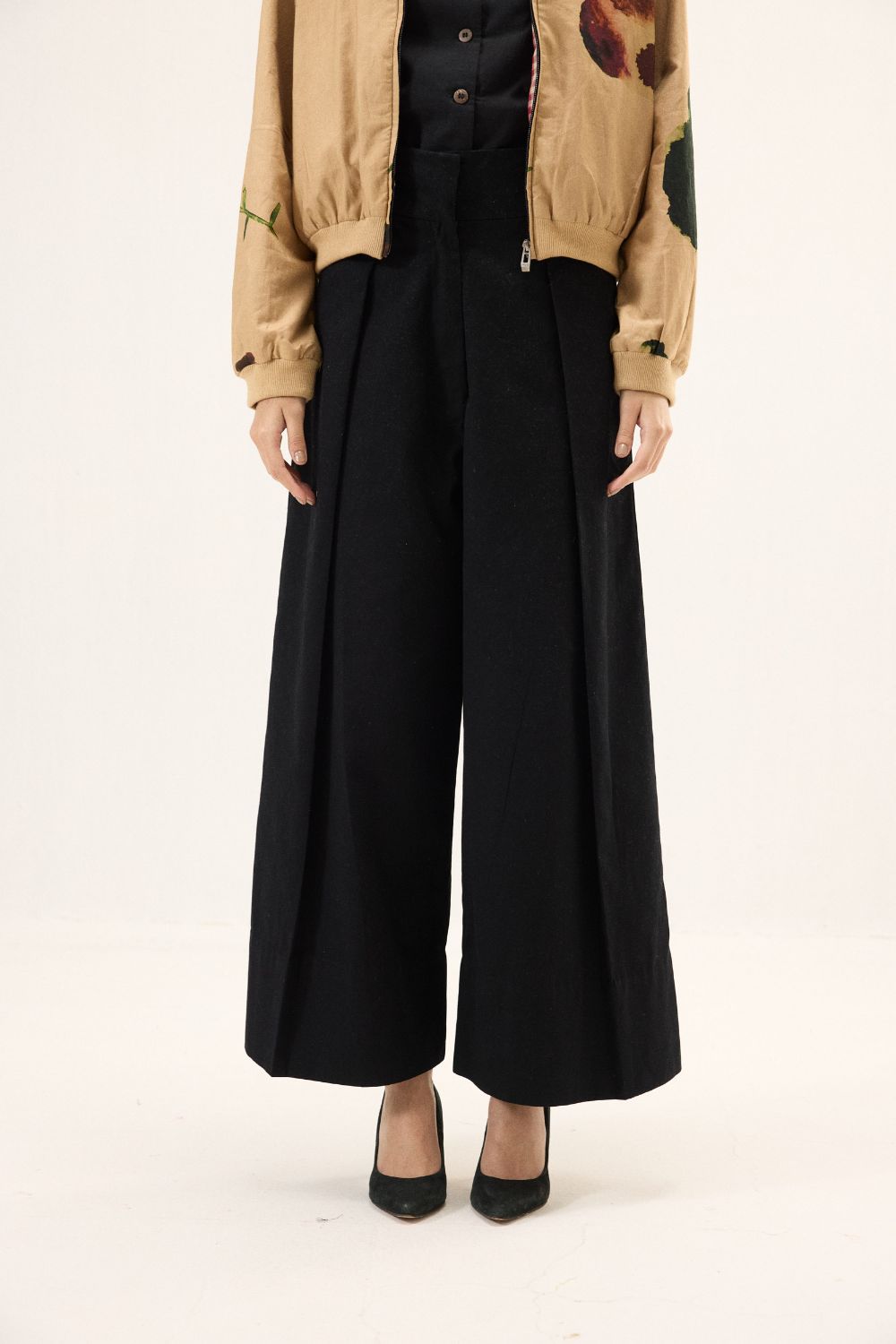 Expertly tailored in dyed twill, these black pleated trousers offer a refined balance of structure and ease. The front pleats add movement to the silhouette, while two functional pockets enhance everyday practicality. Finished with a clean drape, this versatile piece is designed to anchor a modern wardrobe with elegance and timeless appeal.