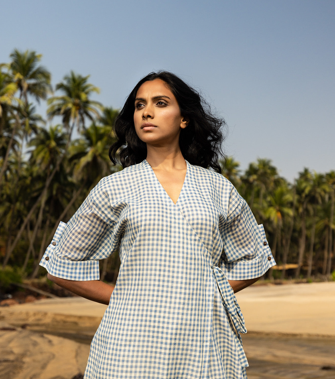 A checkered side knotted wrap co-ord set with button emblelished sleeve and flared elasticated waist pants.