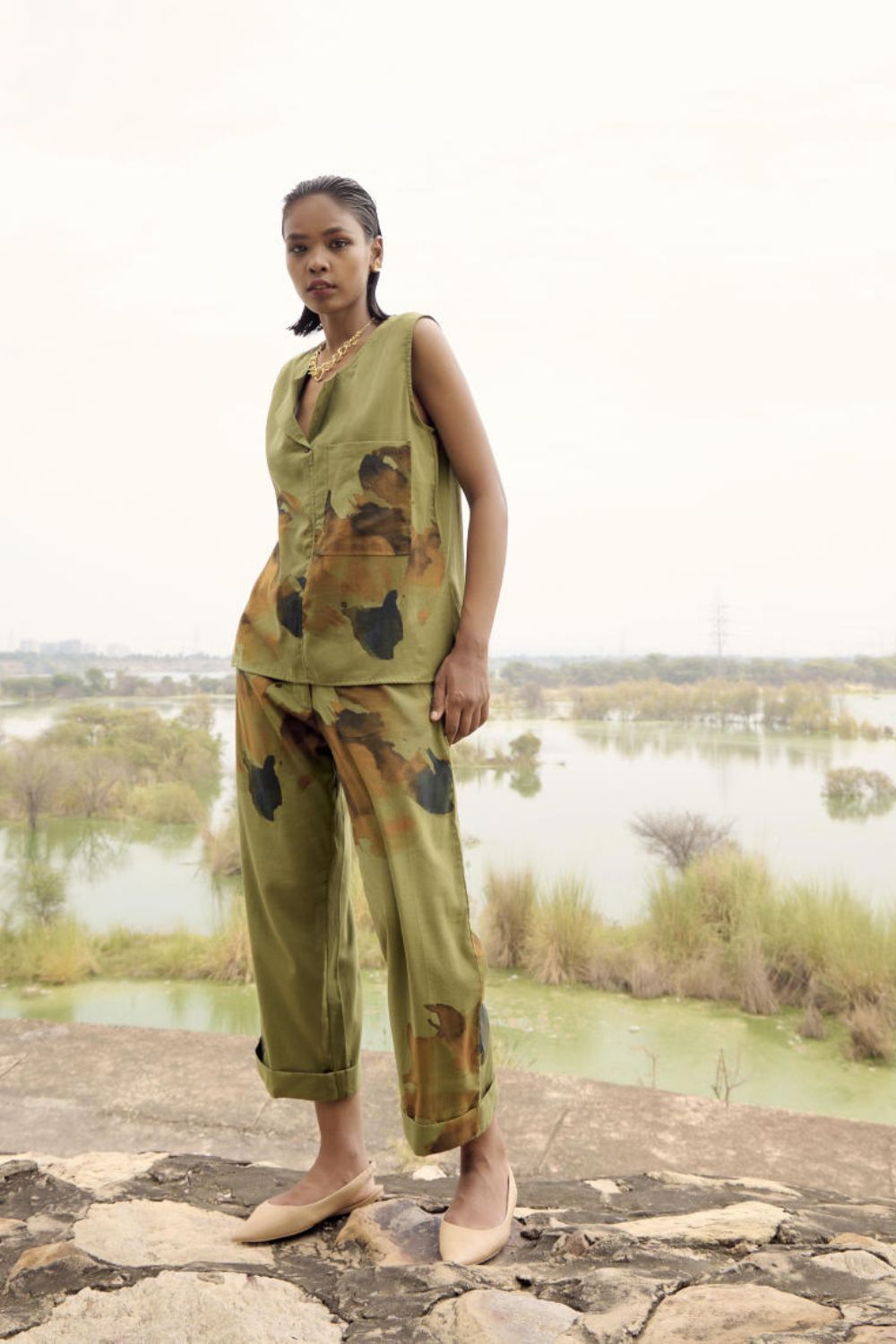 A moss green mul co-ord set. The tunic comes with front button opening, side slits and front patch pocket. Comes with a regular trouser with front button opening and side pockets.