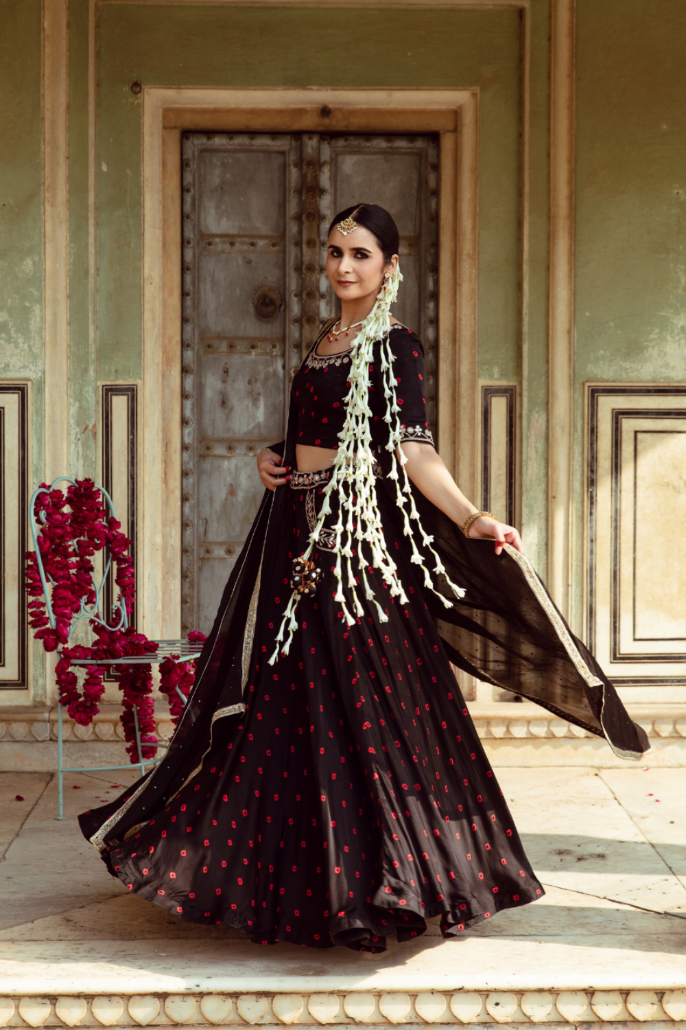 This Black and Red Bandhej Print Lehenga Set combines classic charm with contemporary flair.