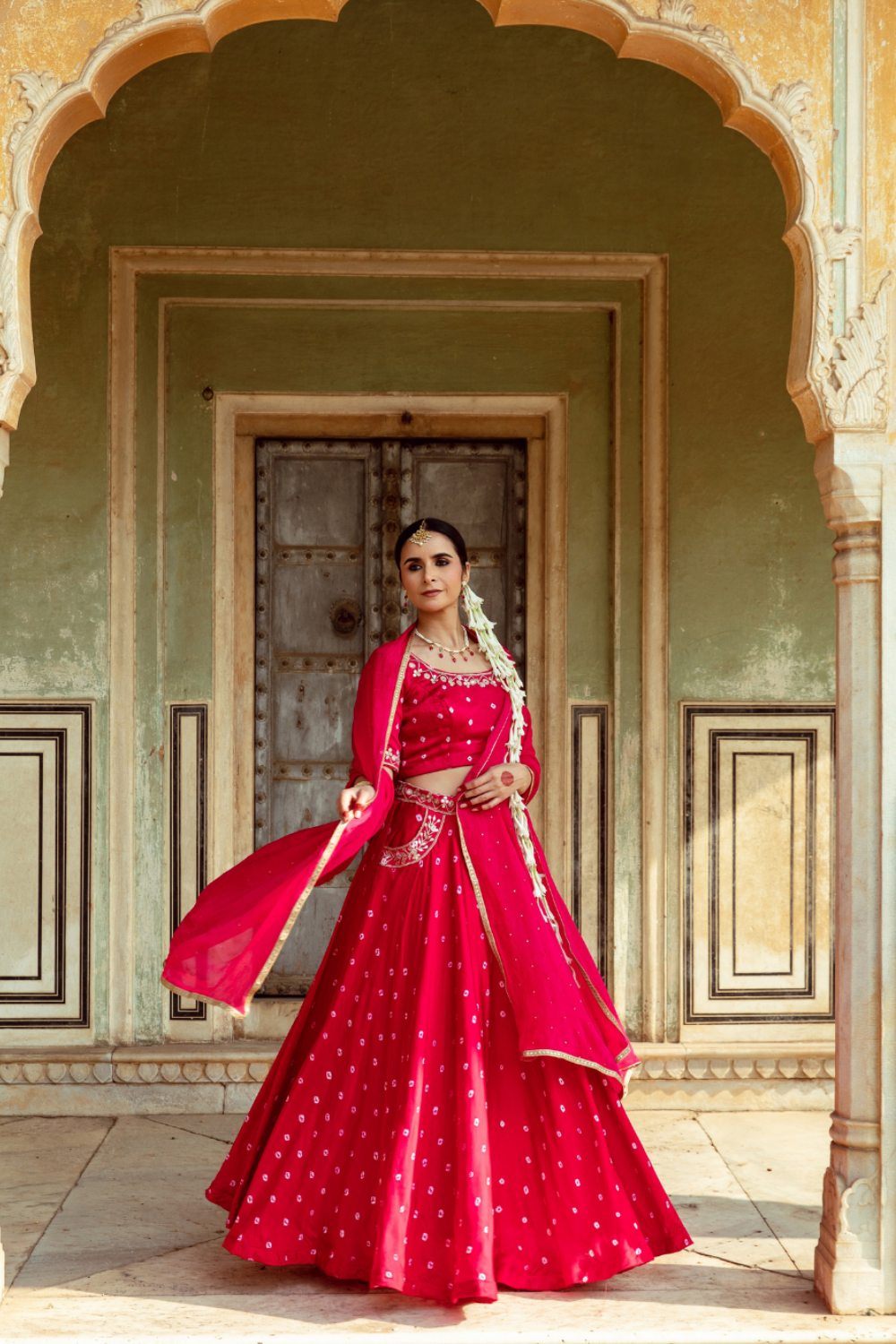 This Fuchsia and White Bandhej Print Lehenga Set is a striking blend of vibrant color and intricate design.