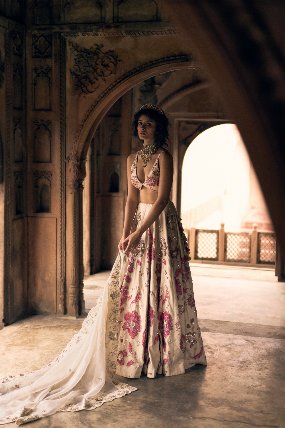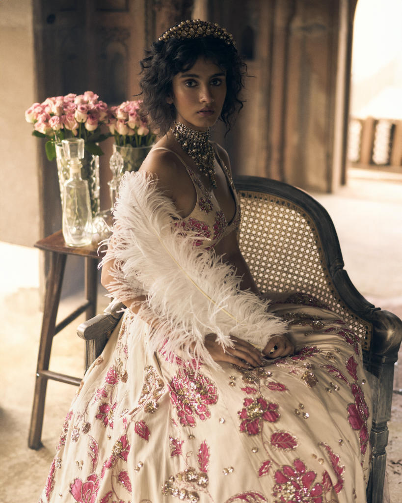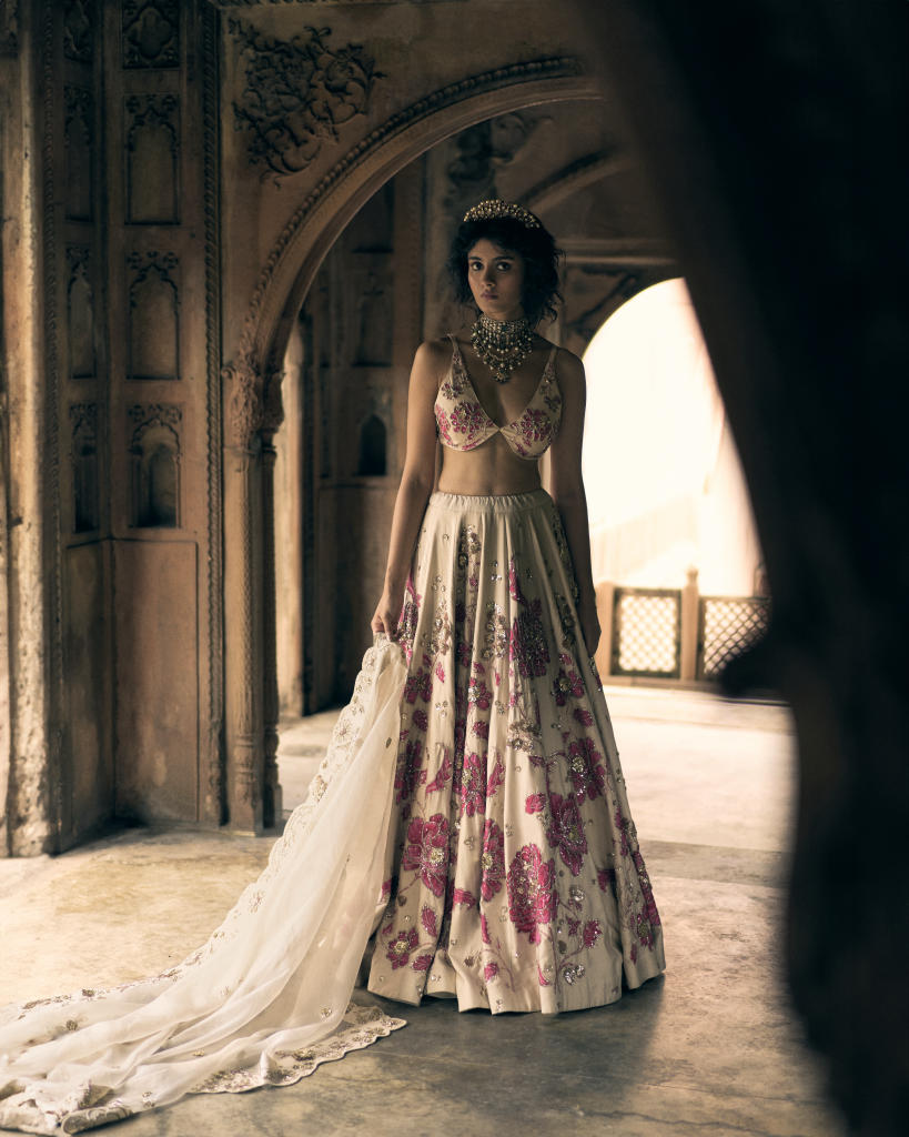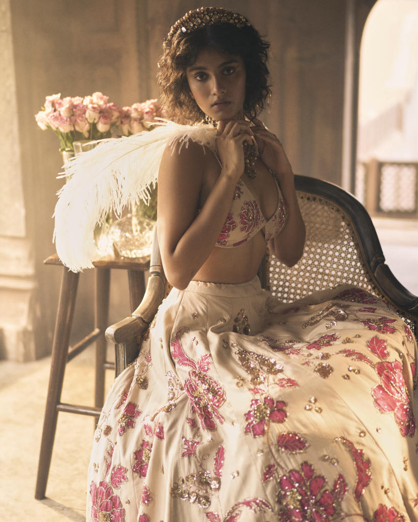 An romantic ivory and pink floral print lehenga, featuring intricate hand-embroidery in aari, zardozi and sequins. It is paired with a signature cut printed and hand-embroidered blouse and a delicate organza dupatta hand-embroidered in a beautiful storyline of flora, fauna, leaves and birds.