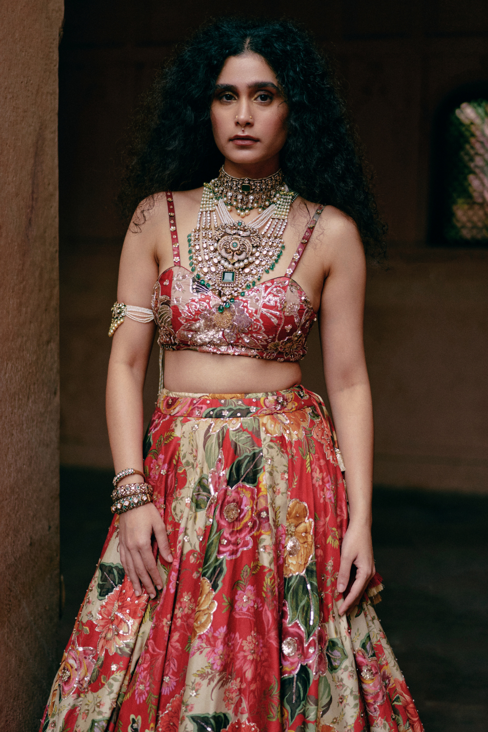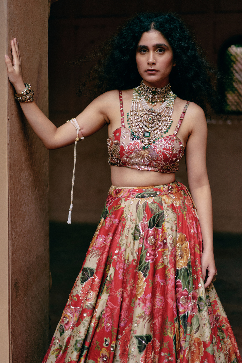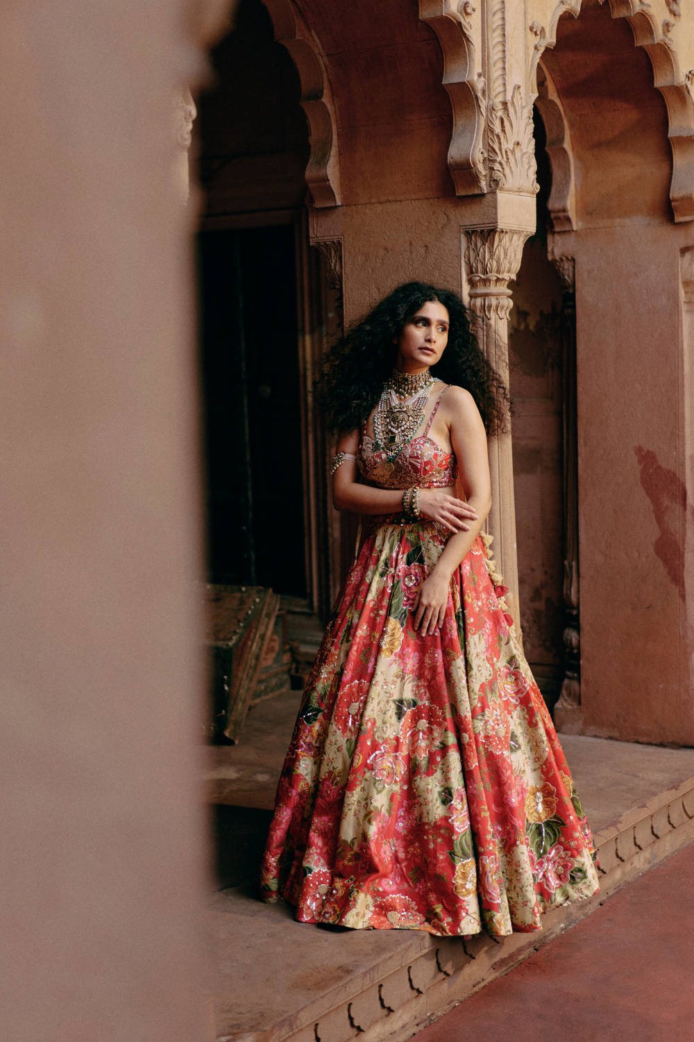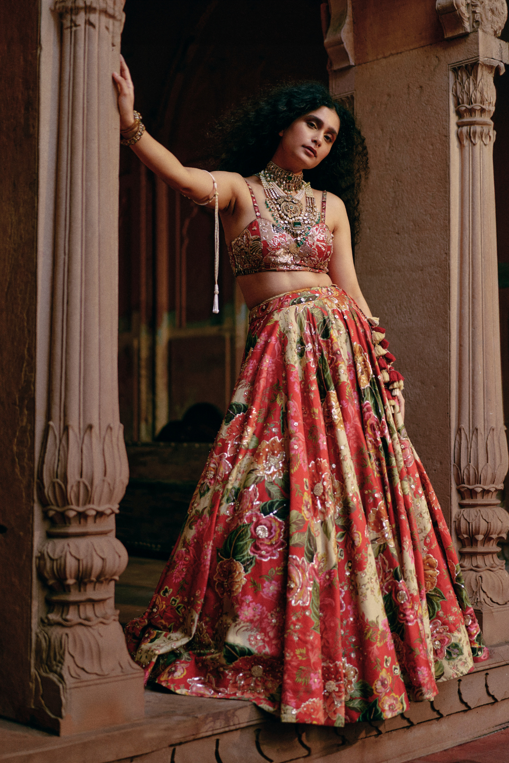 Every collection begins long before the garment is stitched: months of research into India’s rich craft traditions, followed by the painstaking creation of detailed illustrations. These artworks are then scanned, enhanced with jewel-toned palettes and touches of rich gold, and finally translated onto fabric. The result is a visual language so distinct that their name has become synonymous with print, colour, and the kind of glamour that still feels feather-light.
