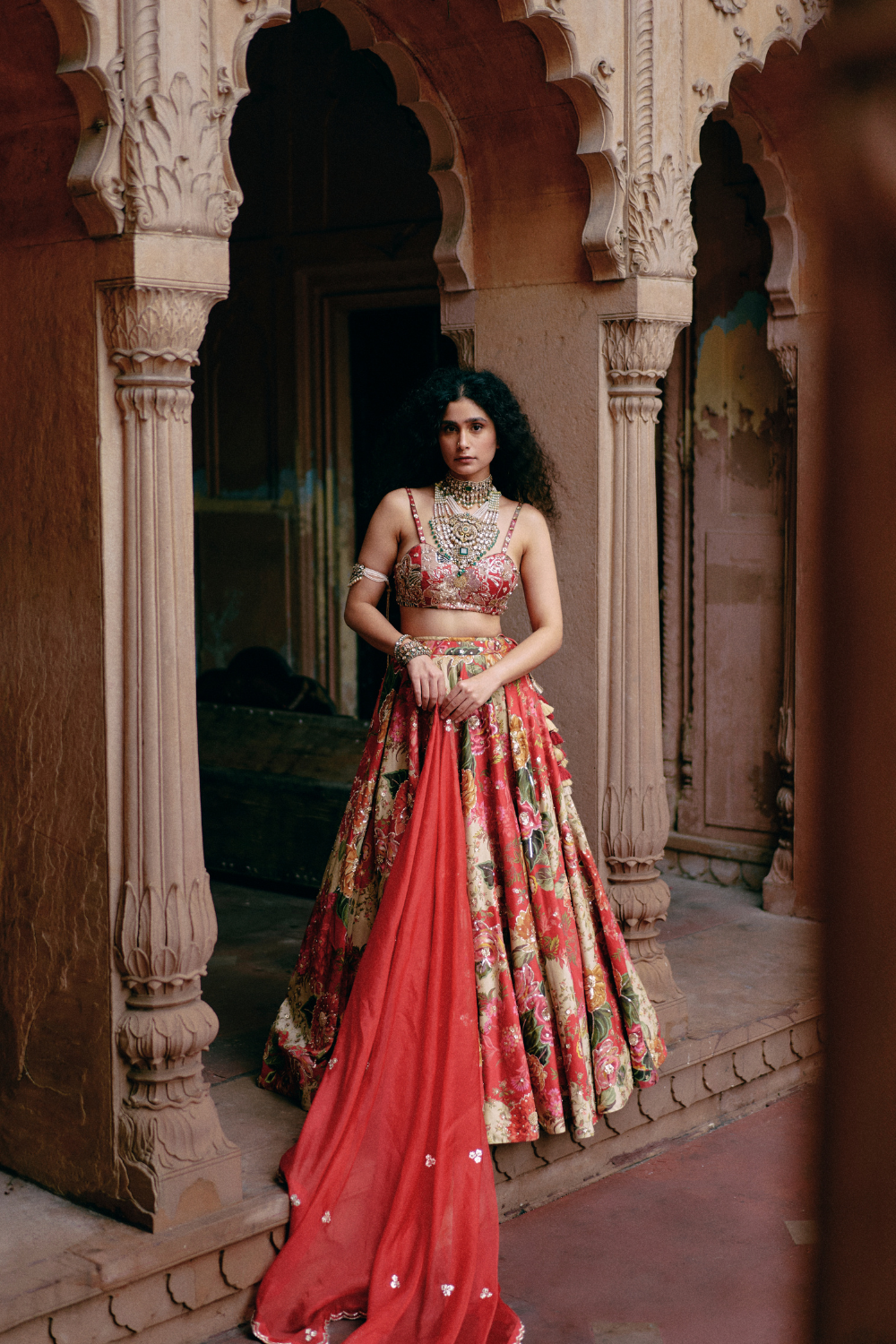 A red map printed lehenga set with a heavily hand-embroidery strappy blouse, and hand-embroidery print highlights on the lehenga. It is paired with a scallop embroidered dupatta.