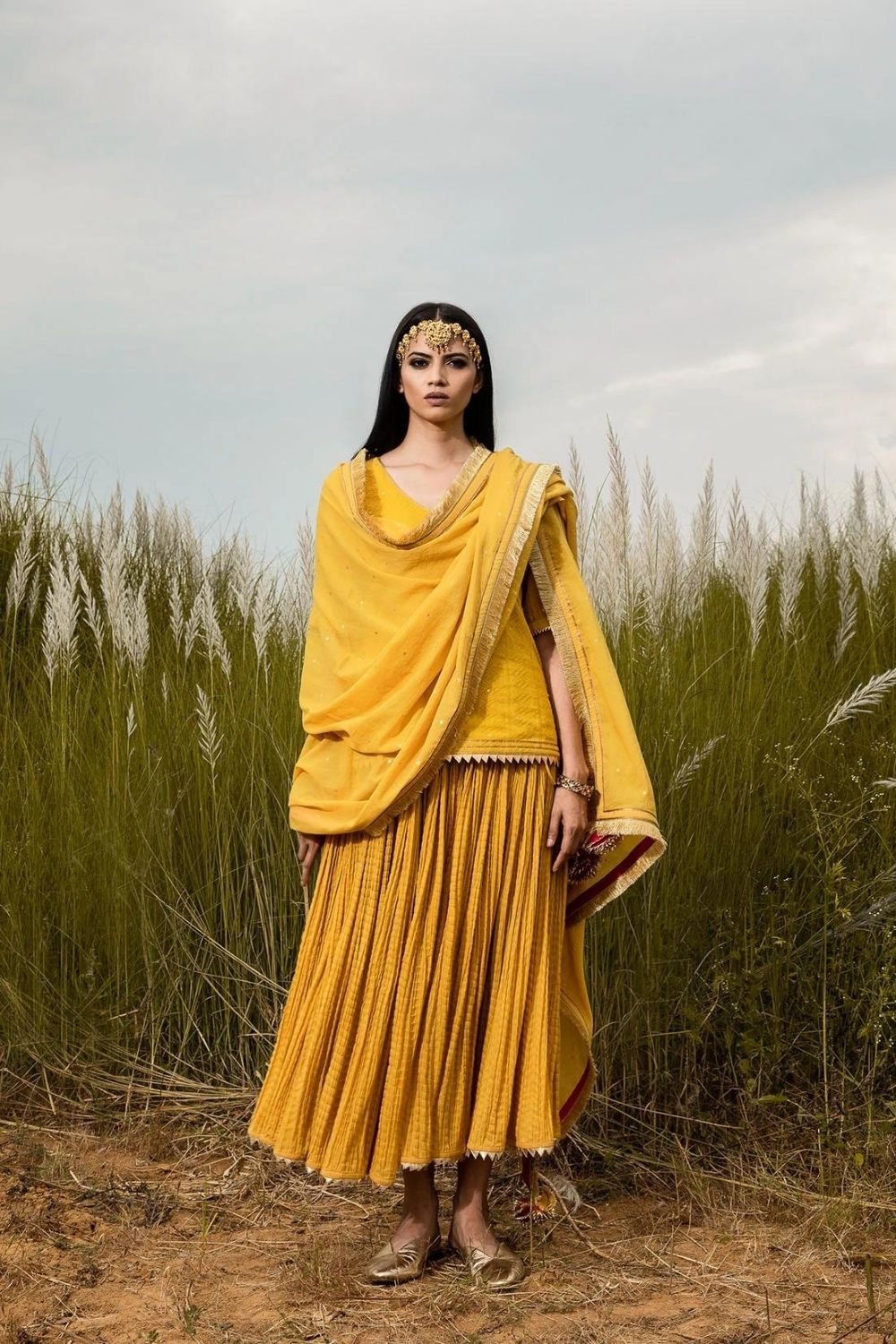Mustard yellow short kurti, with an architectural neckline, short sleeves, and delicate details of gold gota work. Worn with it is a playful and fun crinkle ghagra, falling slightly above the ankle and fastened by decorative tassels. The look is completed with our mustard odhni - 'Basant'.