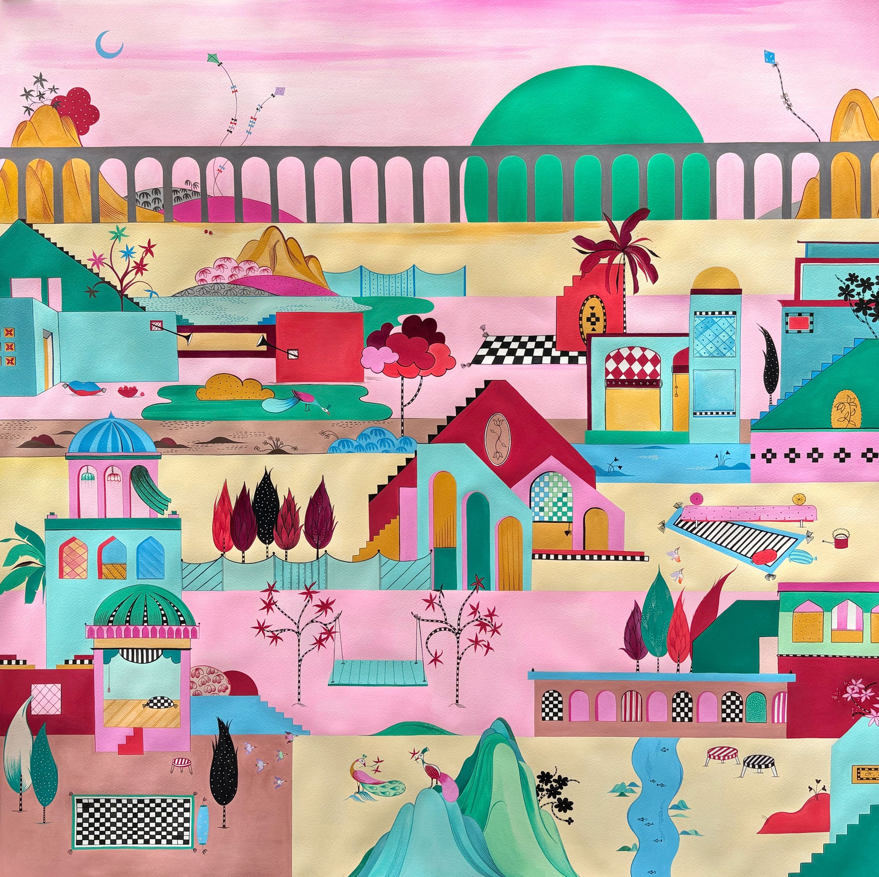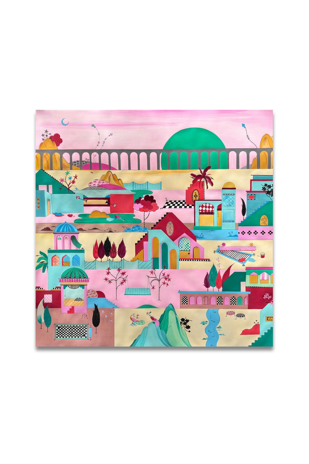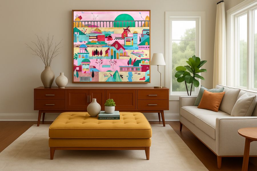 Each piece begins with a study of shape and hue — colours borrowed from mango skies and twilight hours — before she layers in the imaginary: architecture, flora, figures, and symbolic objects that appear to belong to another time. The result is an immersive visual language that oscillates between the real and the fantastical, evoking both nostalgia and curiosity.