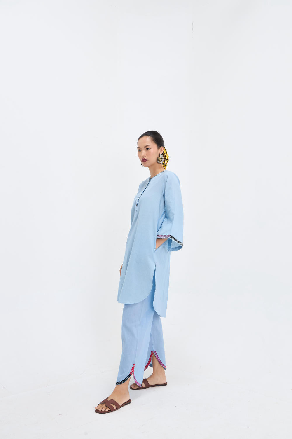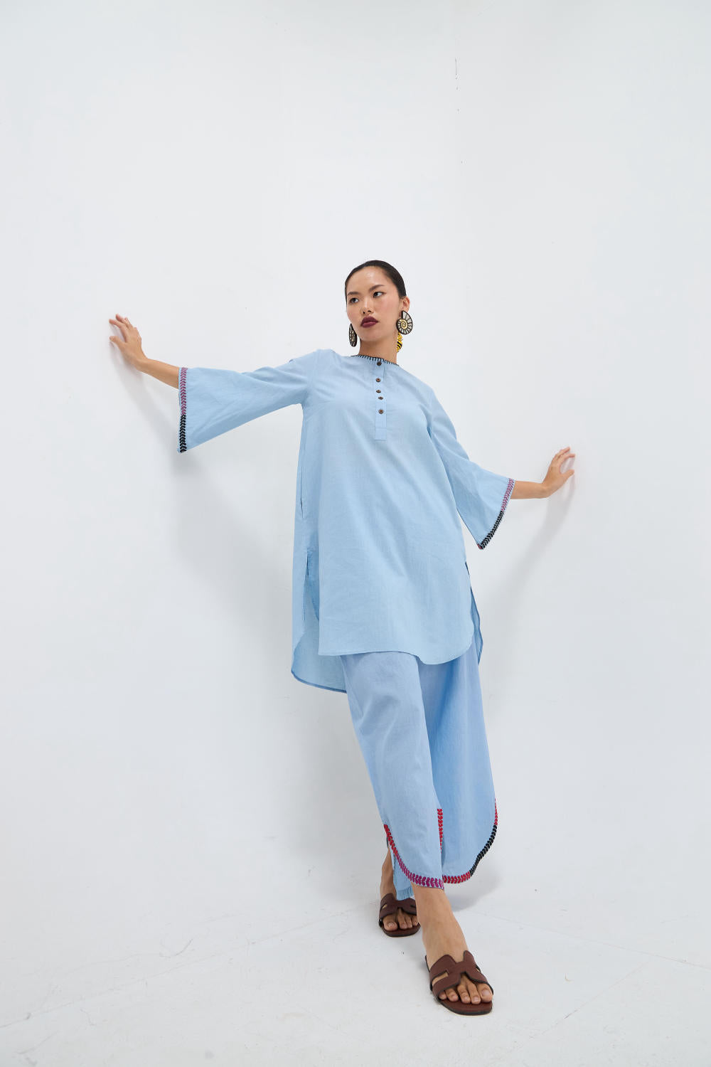 This sky-blue Cotton Cambric set features a round-hem kurta with wooden buttons and a relaxed silhouette, this ensemble is all about understated charm. The scallop-embroidered pants bring a playful edge to the look, making it perfect for casual outings or laid-back gatherings.