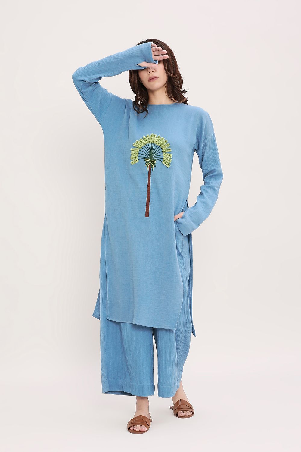 Soft crush cotton tunic with hand embroidery. Comes with matching pants with fully elasticated waist and side pockets. Total 2 pcs.