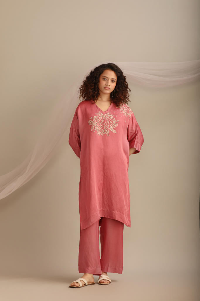 A linen satin rose coloured two piece set with delicate thread work kurta and plain pants