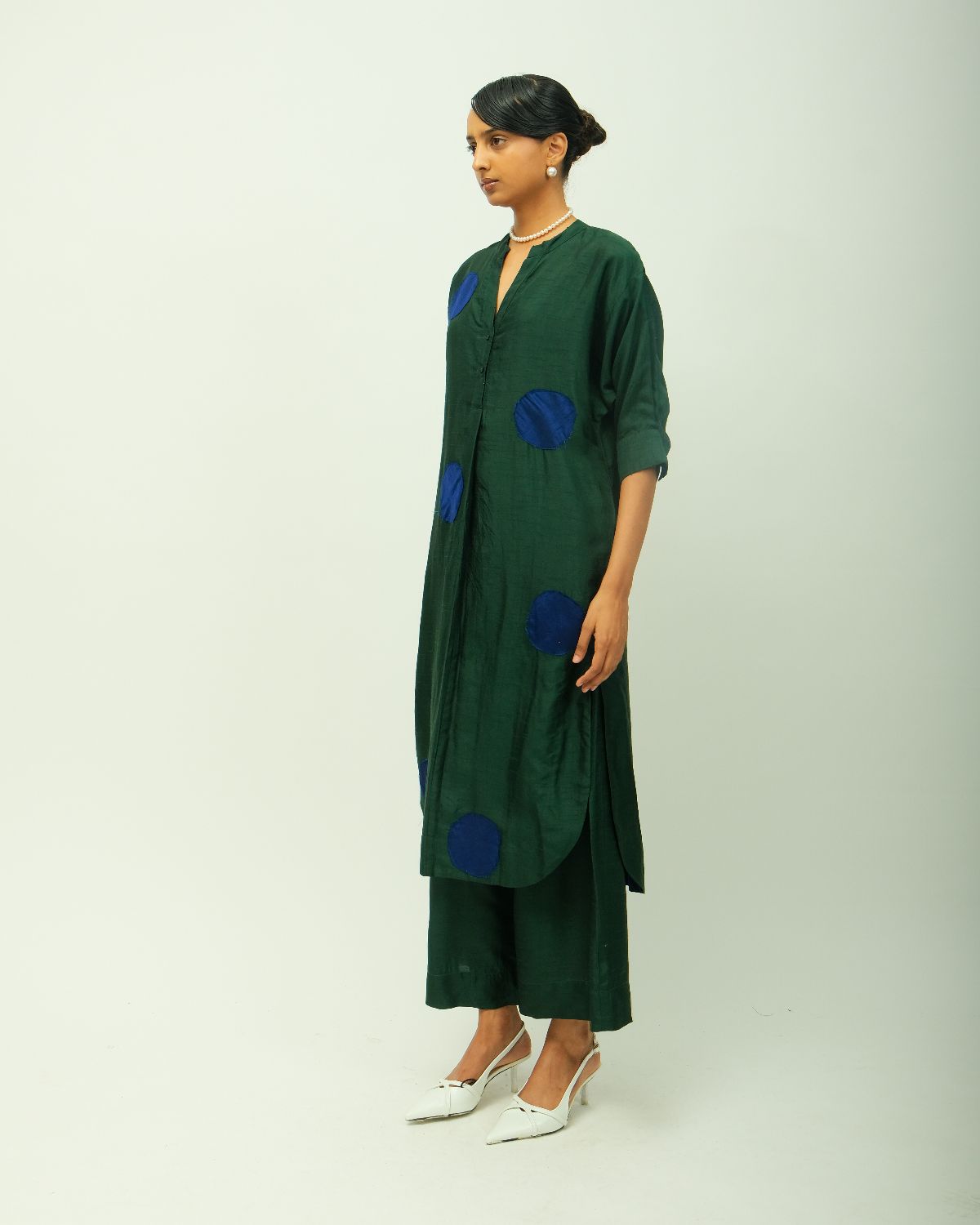 Dress: Anti-Fit Dress, V-neckline, elbow-length sleeves, front placket, applique work. Wear it for festive soirees like mehendi, pujas, haldi ceremonies, or lunch—single piece