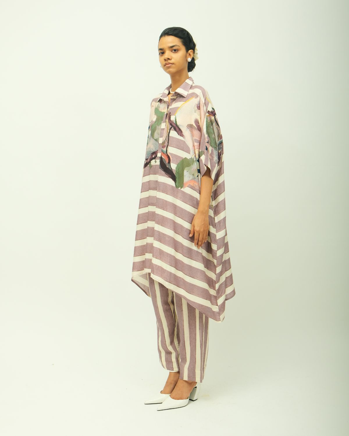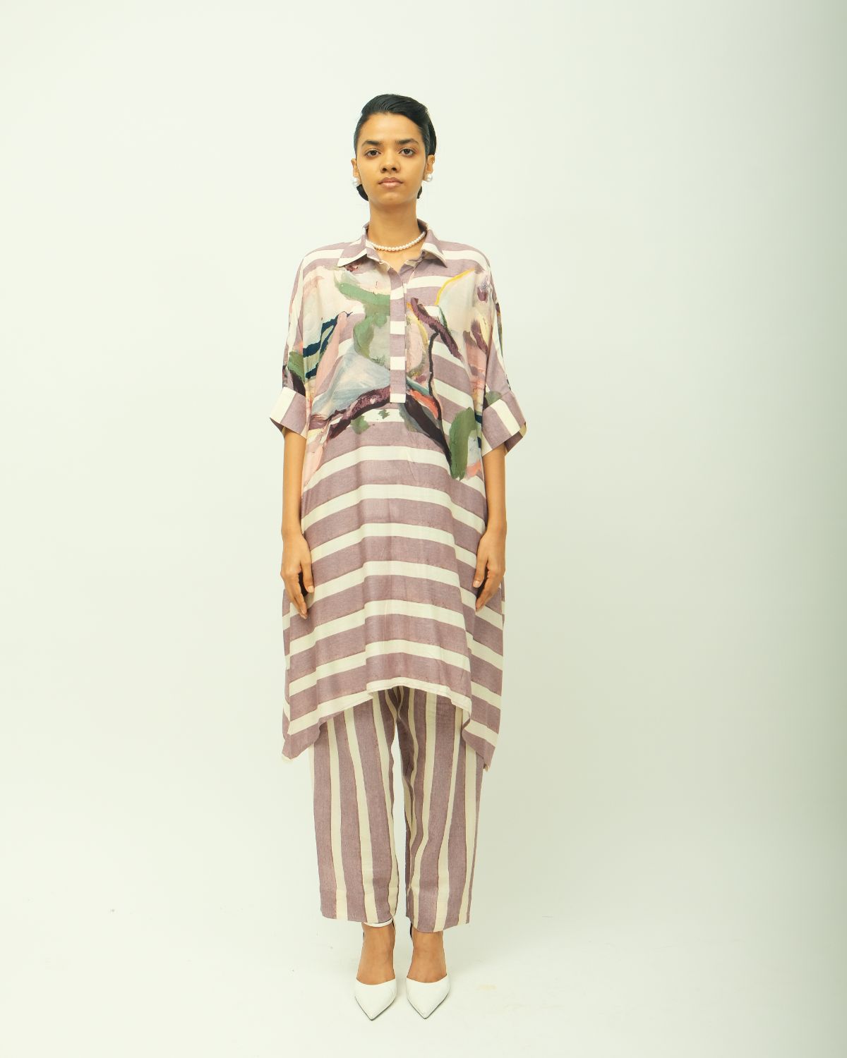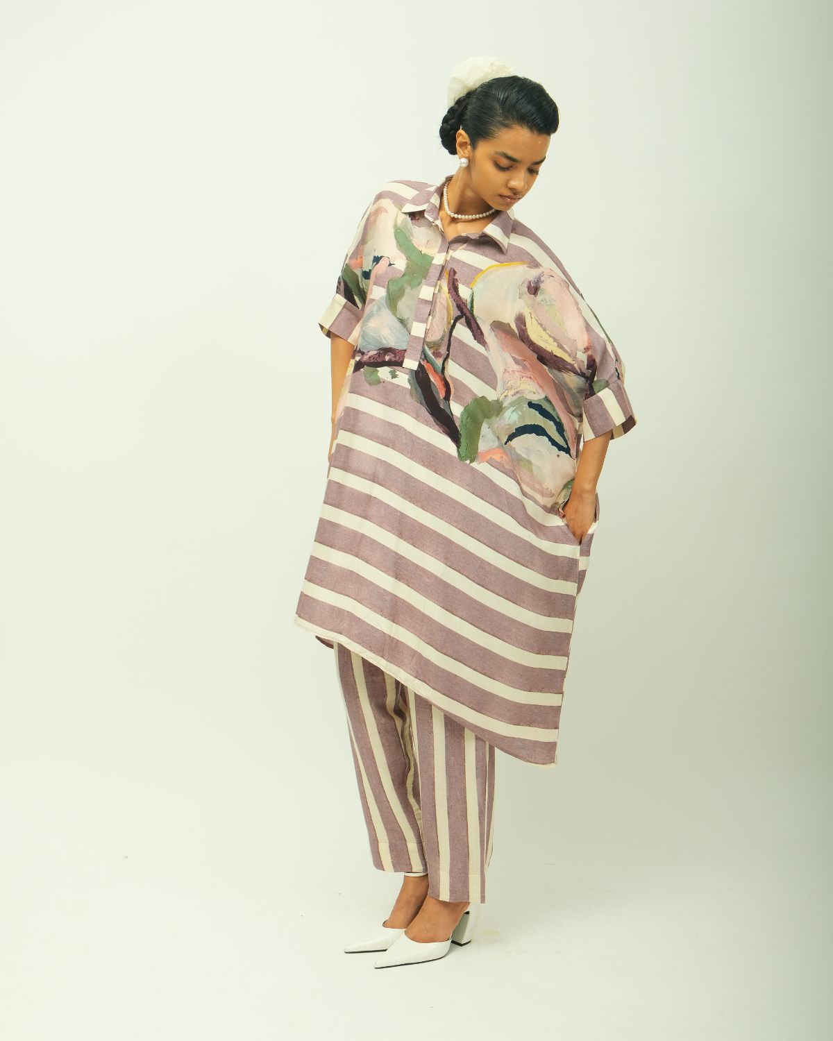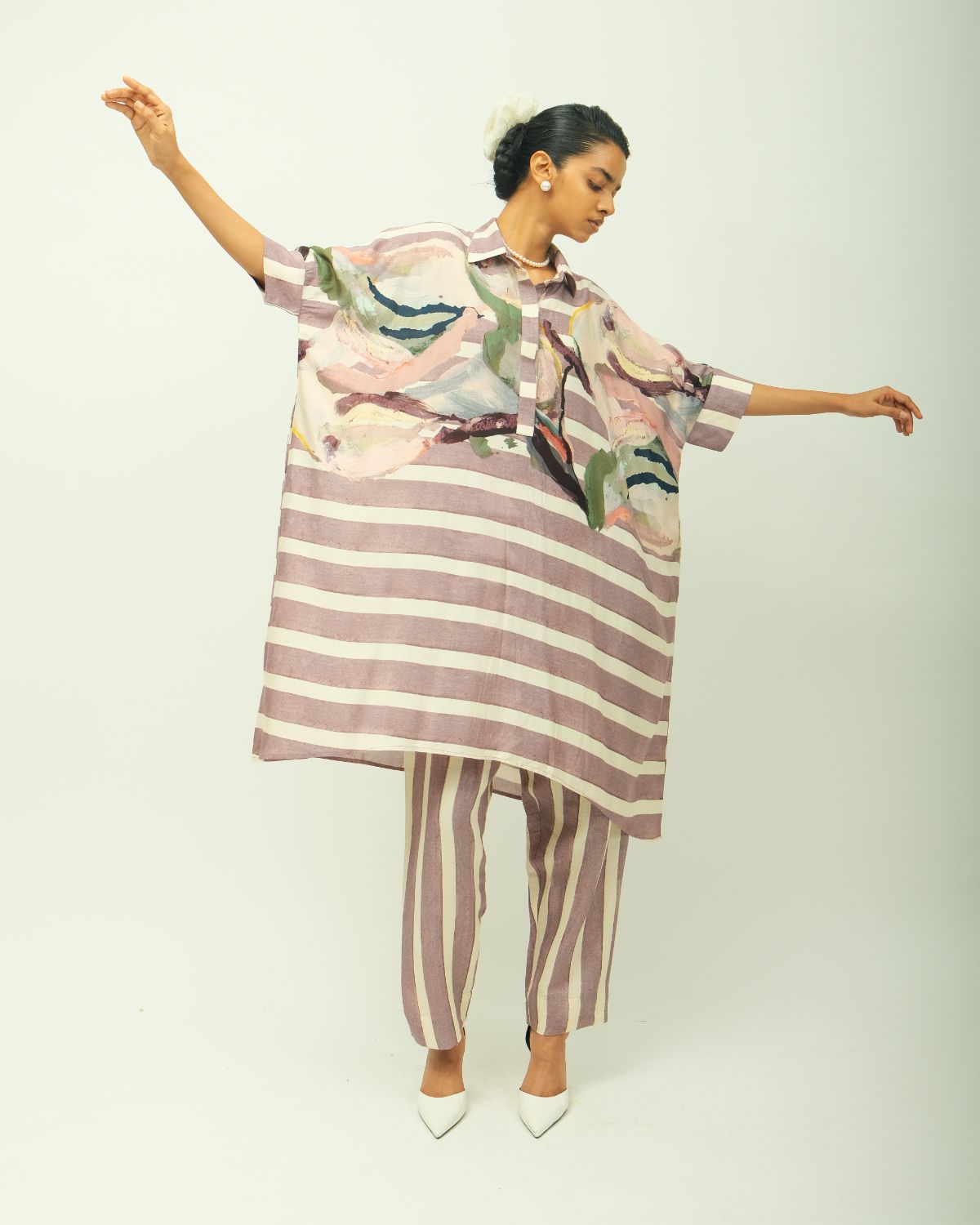 Top: An oversized shirt tunic with horizontal stripes in muted mauve and ivory, featuring a front placket and classic collar. The top showcases a digitally rendered print across the chest—originally hand-painted [print placement may vary]—adding an artistic flair to the structured silhouette.