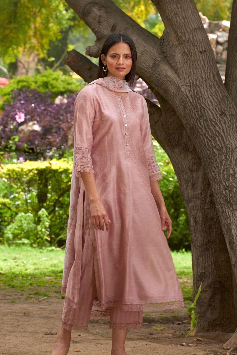 Self stripe smart kurta with lace work and pants with Mal floral print dupatta