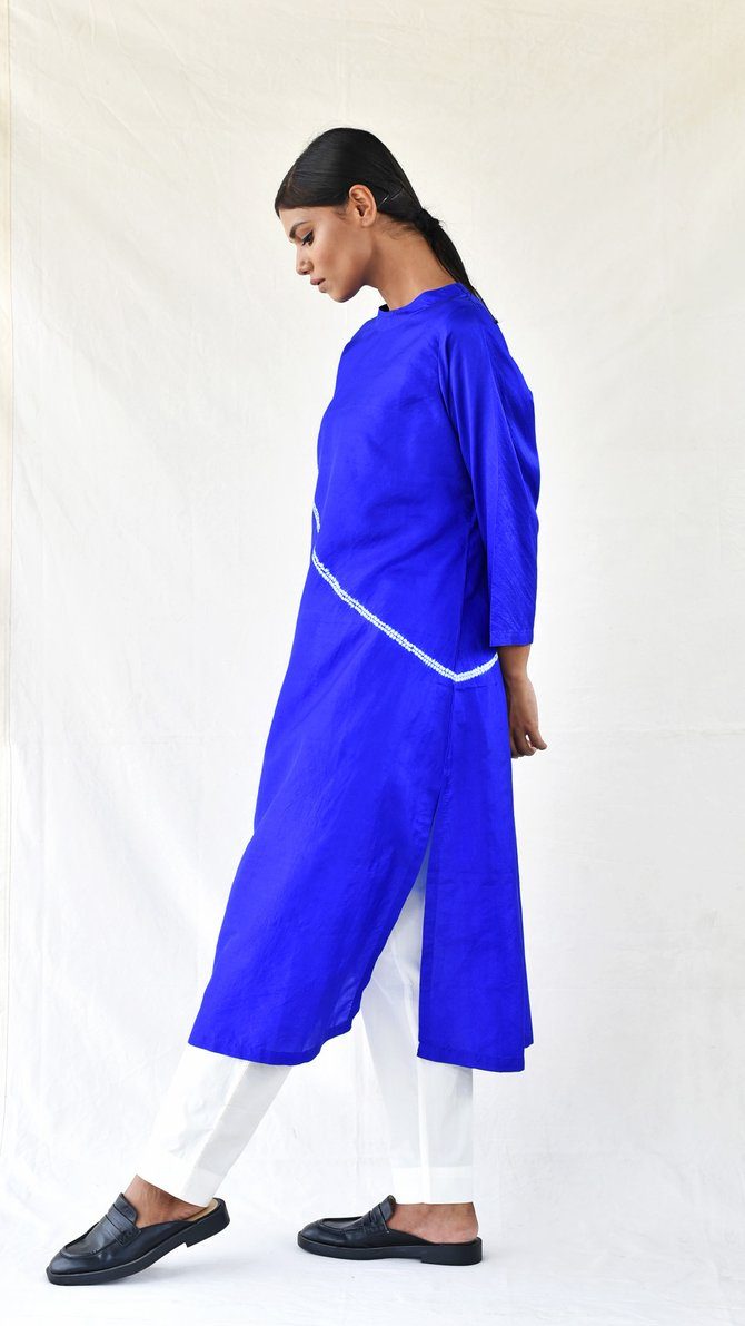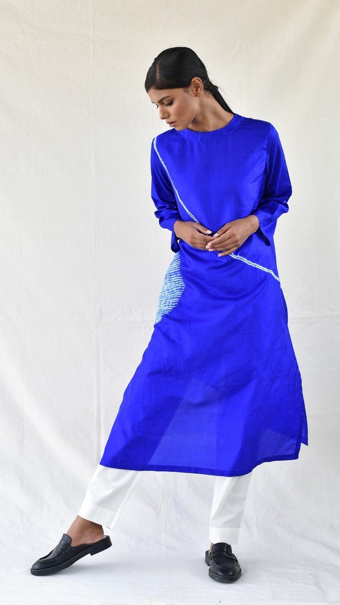 Handwoven silk kurta dyed in royal blue, with an abstract nui-shibori pattern.