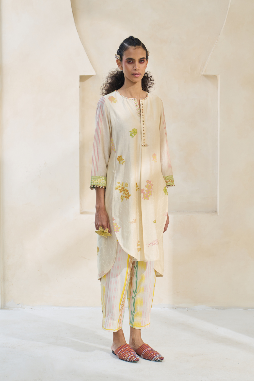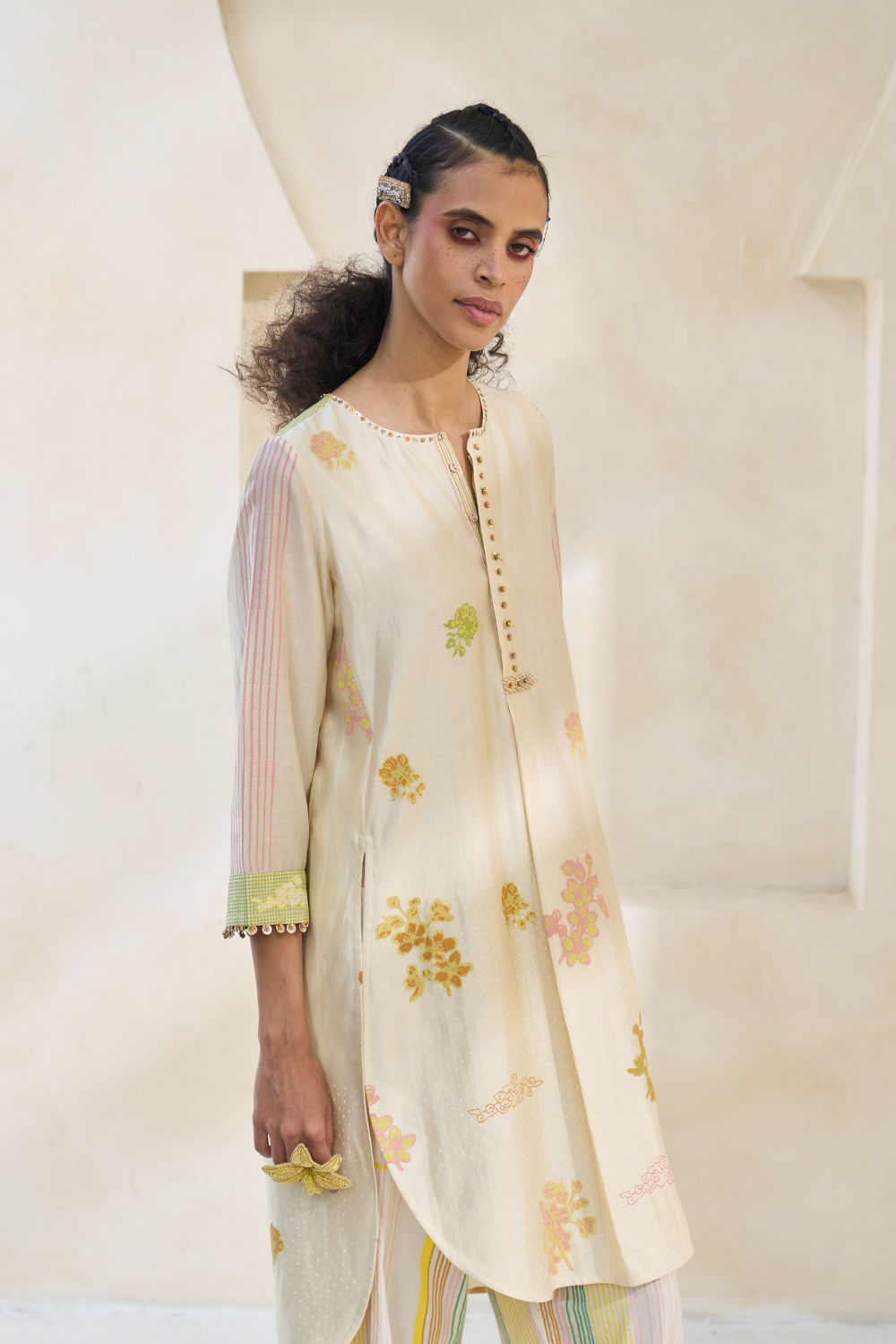 High-low kurta hand block print embellished with hand-done beading, in handwoven 60 gm Chanderi with 100% cotton lining.