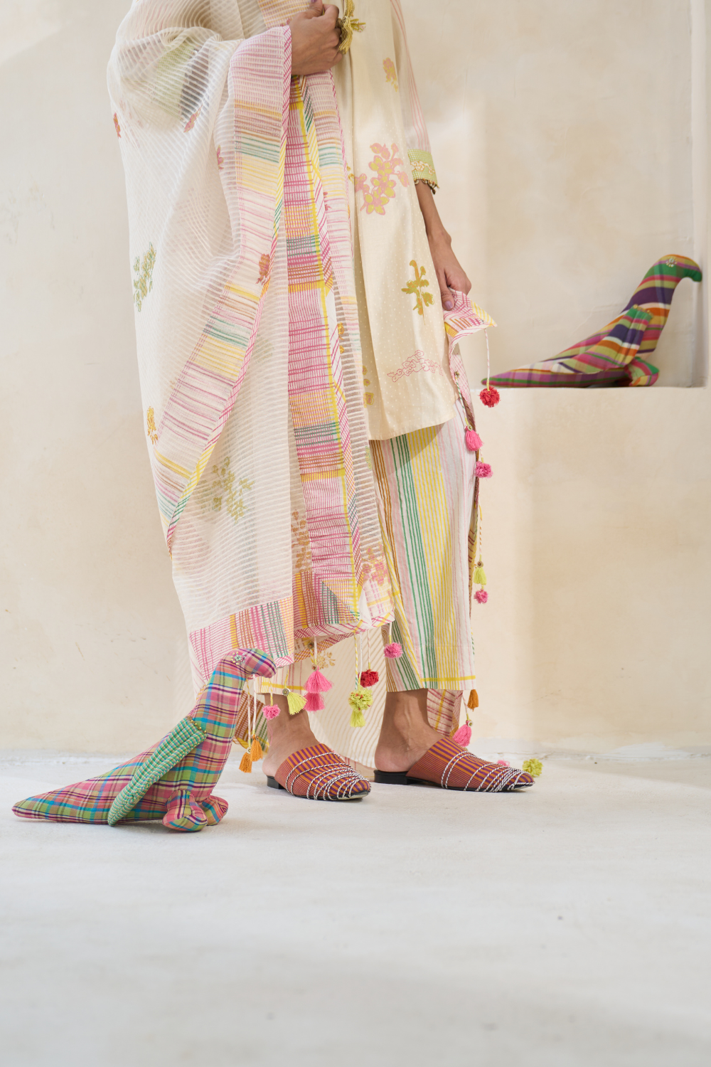 Her Chanderi carries its signature translucence and soft sheen, but with a subtlety that feels almost ethereal — printed slowly, consciously, through hand block printing that heightens the fabric's inherent delicacy.