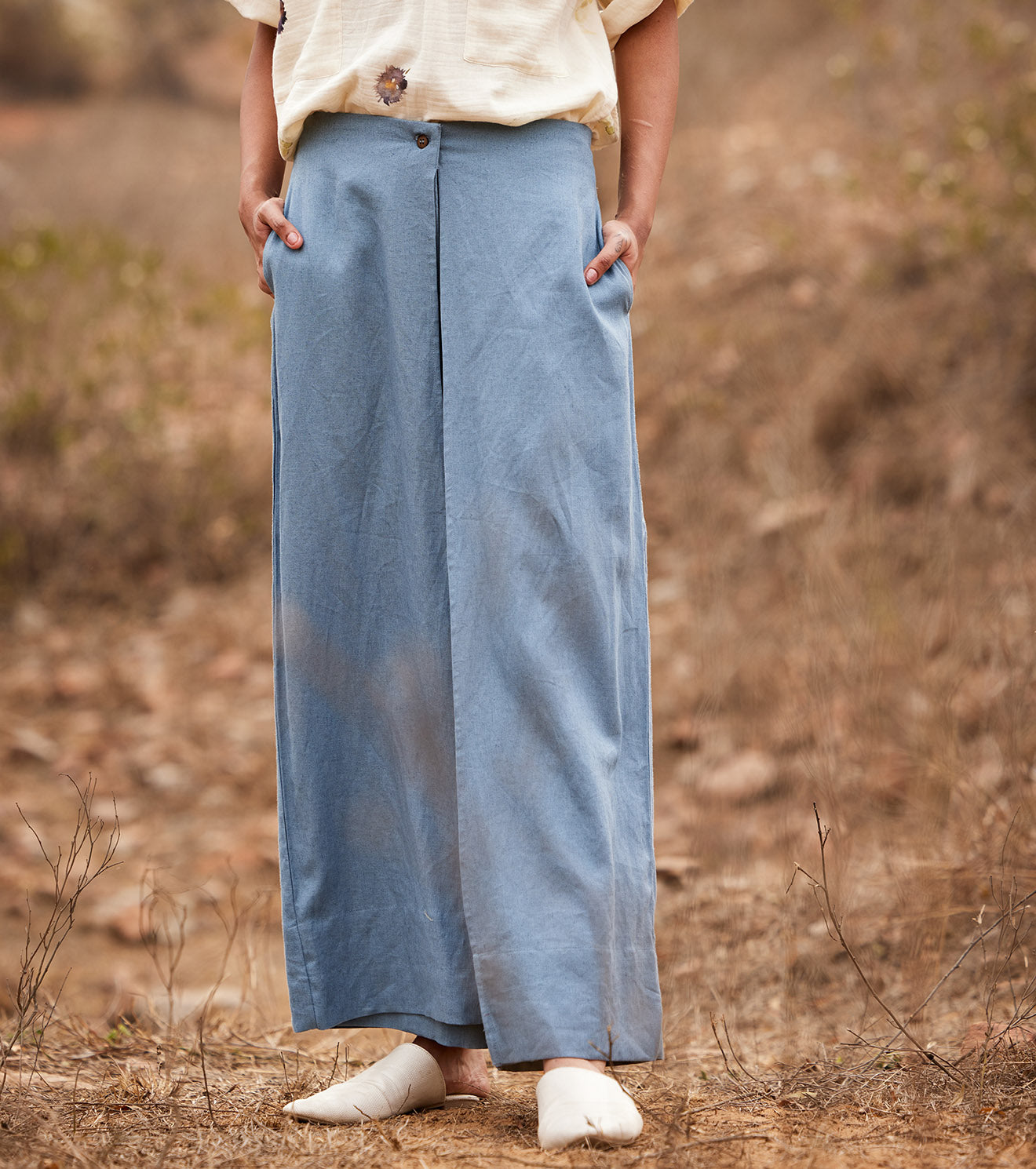 A sky blue pleated bottoms crafted in breathable linen fabric. - Handcrafted in India. - 2 Side pockets