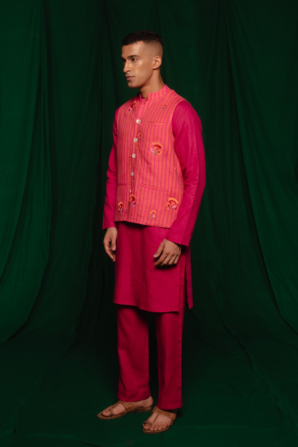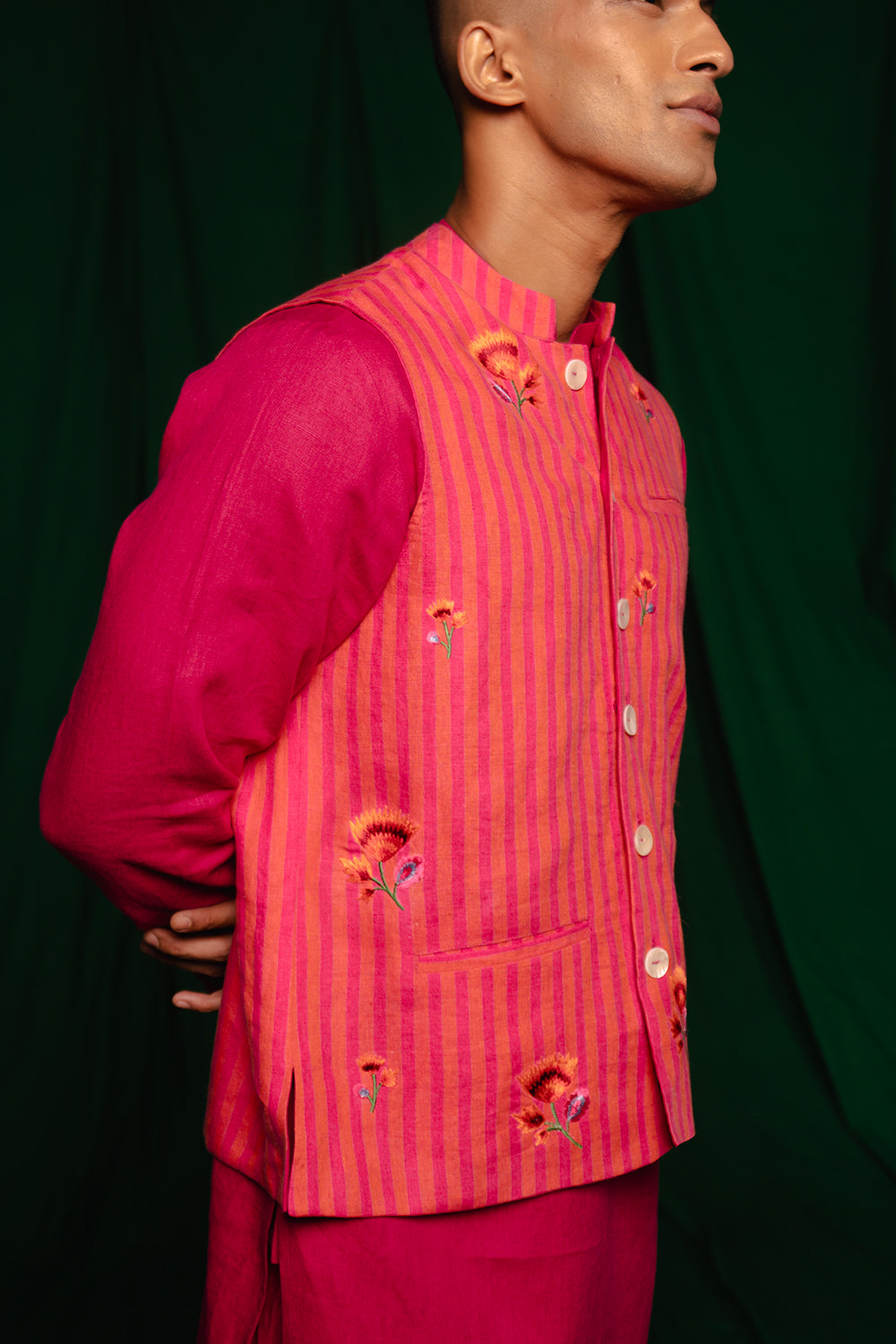 This Nehru jacket showcases a refined blend of traditional charm and modern craftsmanship. Crafted from pure linen with a structured mandarin collar, it features timeless finely woven linen. The front pockets and sleek button closure add both functionality and style, making it a versatile layering piece. Whether worn over a kurta or paired with trousers, this jacket effortlessly elevates your festive or semi-formal look with its understated elegance.