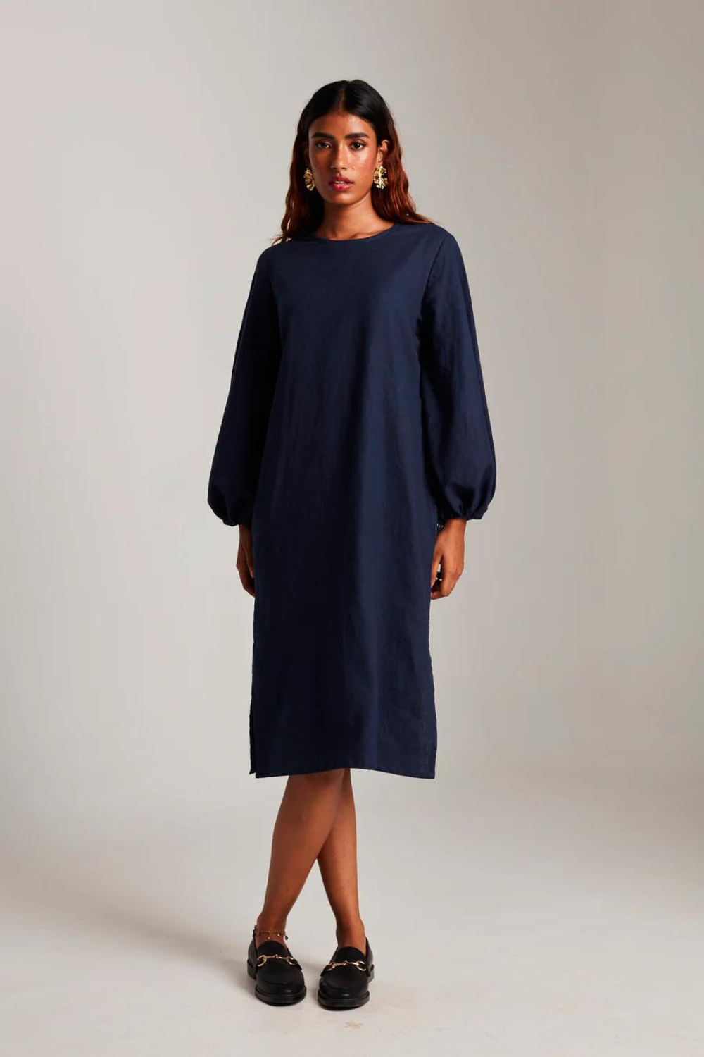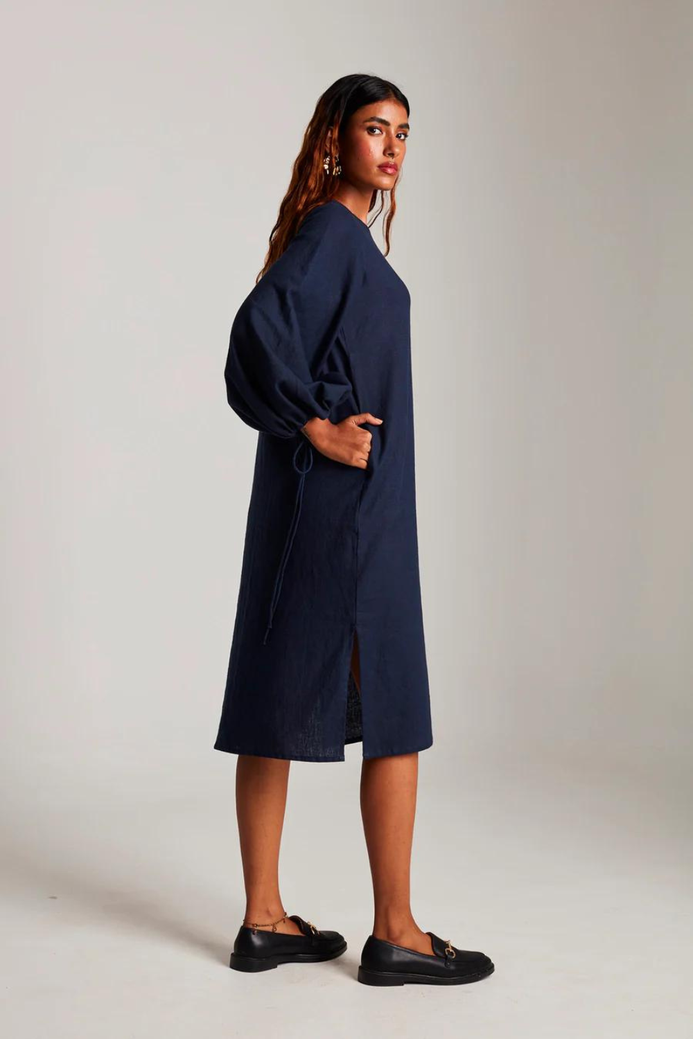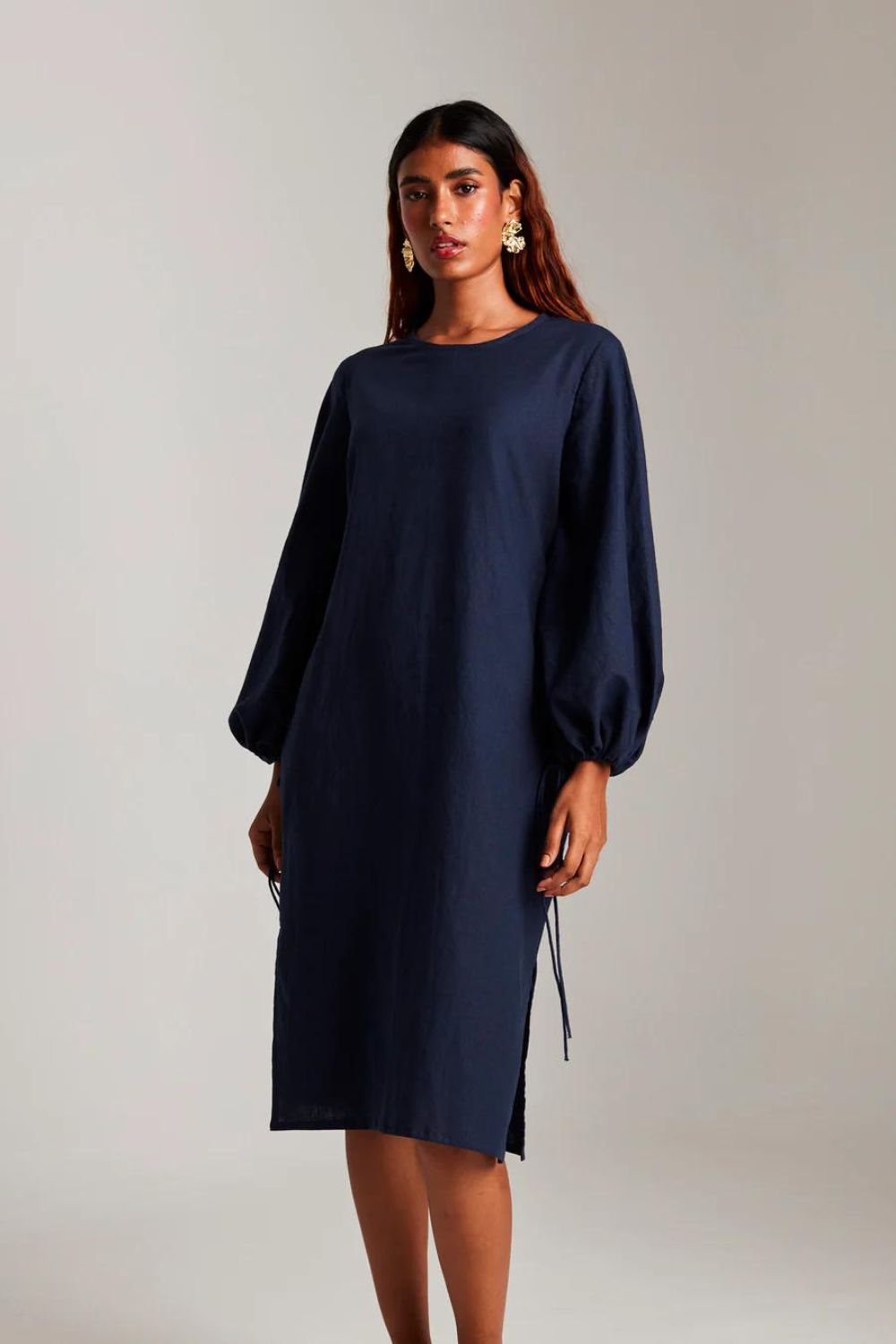 A shift dress with a twist, we added oversized sleeves with drawstrings to this classic silhouette. Roll it up for some volume or wear this as a full-sleeved version. Best paired with statement earrings and slick back hair to keep things chic.