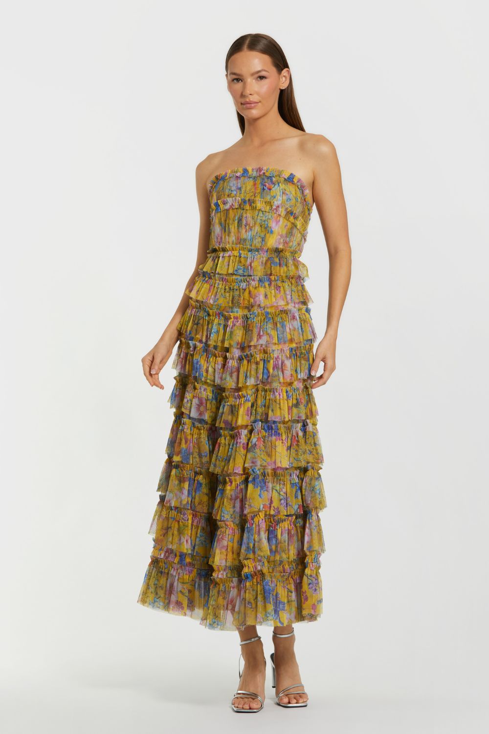 Ruffle Mesh Strapless Midi Dress