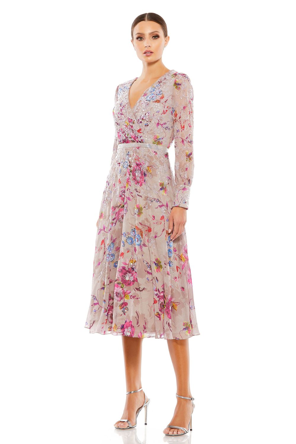Discover timeless elegance with our Long Sleeve Midi Dress, crafted from hand-embellished floral printed fabric. This enchanting dress features a flattering V-neckline, long bishop sleeves, and a faux wrap bodice for a feminine silhouette.